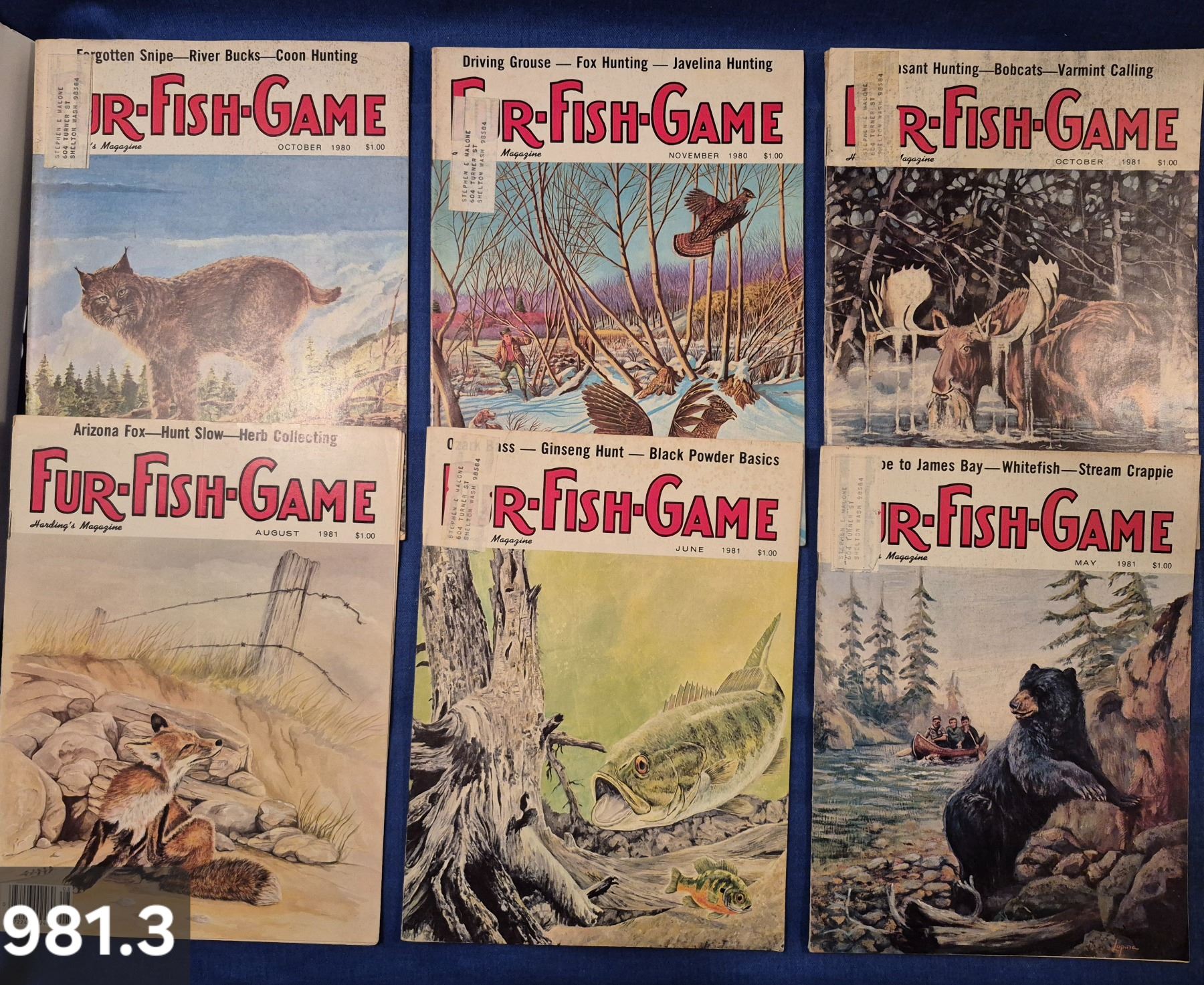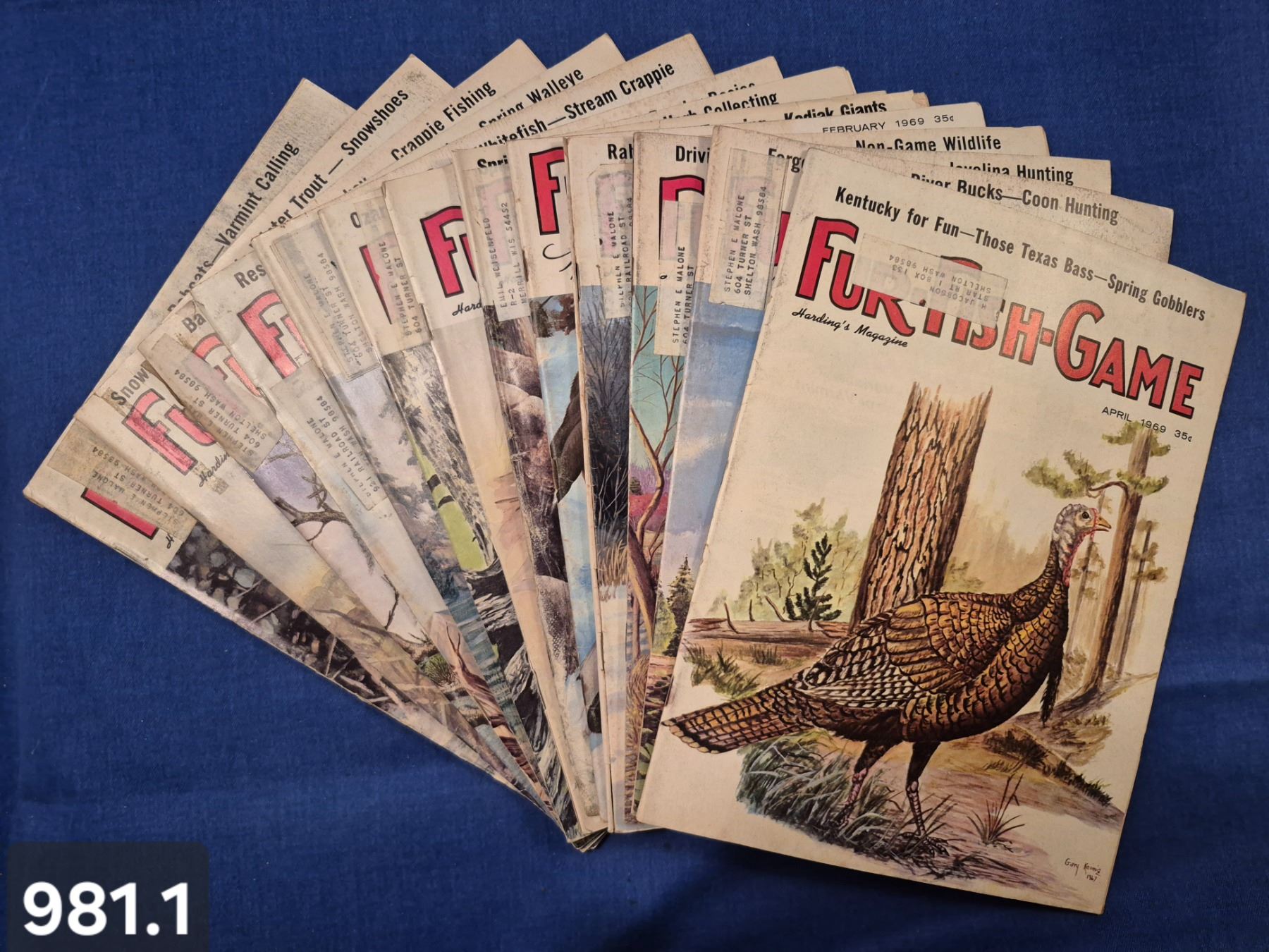 981. 13 Assorted Issues from 1969 to 1983 Fur-Fish-Game outdoor sporting magazines, most in excellent flat condition, lots of gun adds