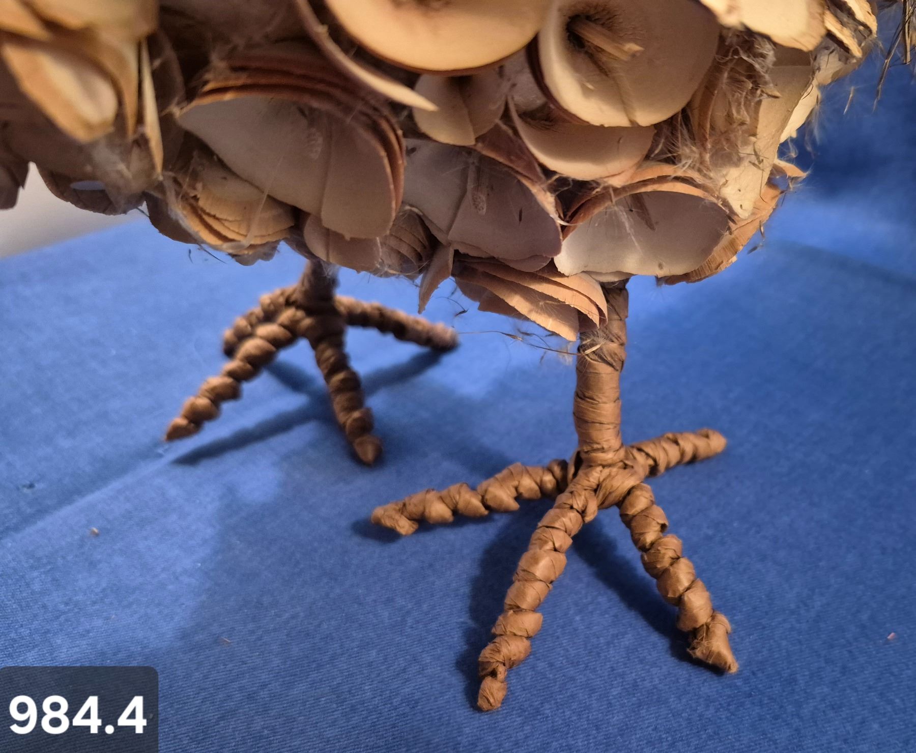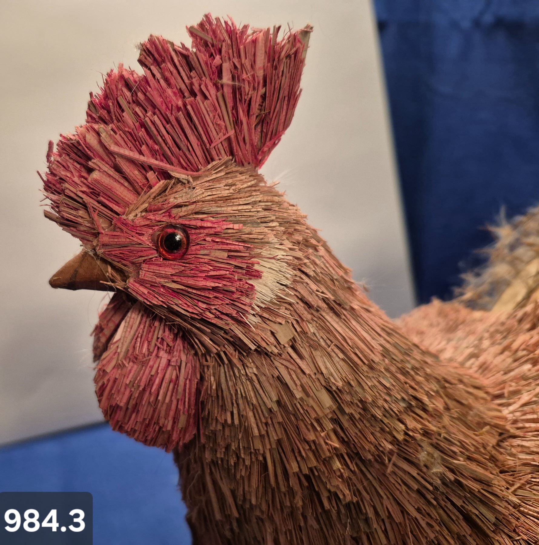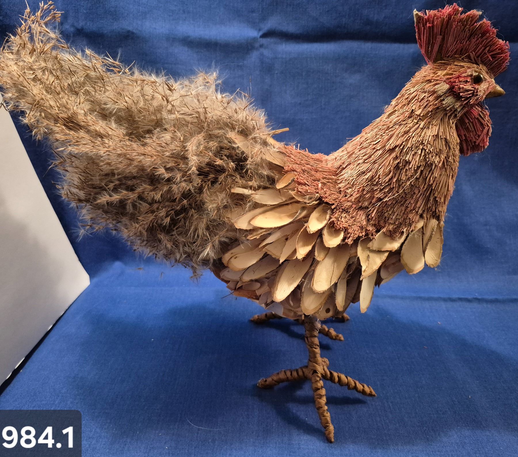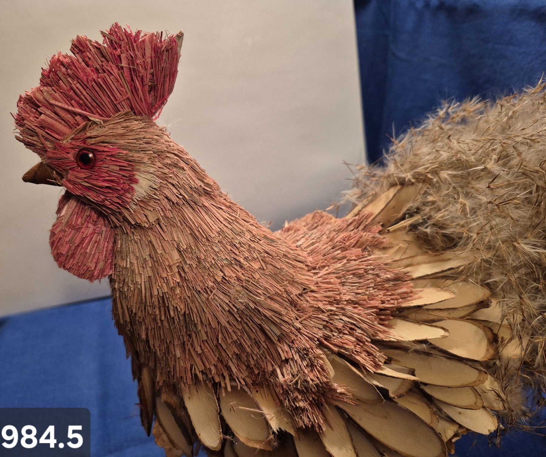 984. Large folk art rooster, made mainly of natural materials, steel legs and feet, 12 1/2 inches tall
