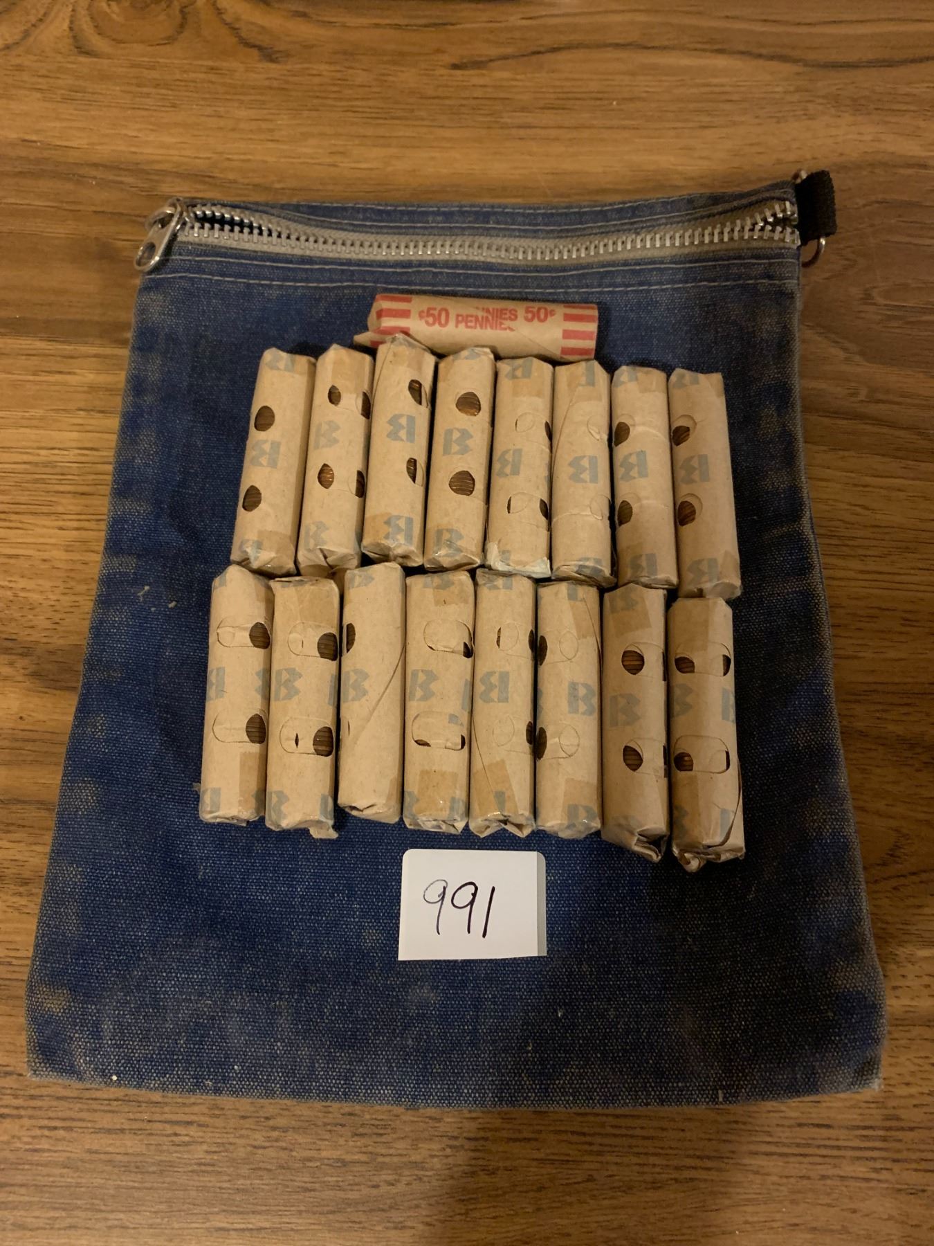991 – 17 ROLLS OF PENNIES IN DENIM CASH BAG