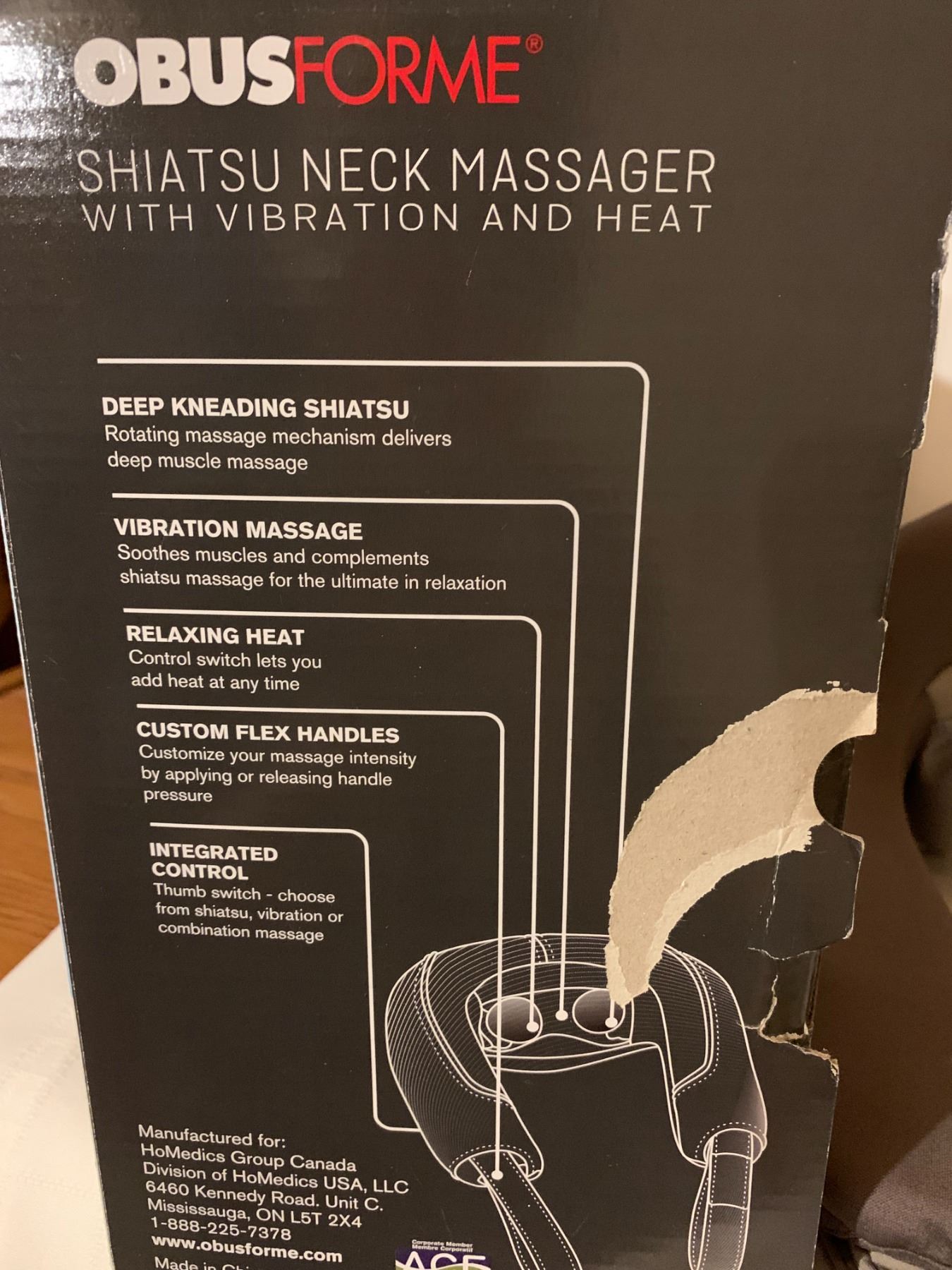992 – OBUSFORME SHIATSU ELECTRIC NECK MASSAGER WITH VIB RATION/HEAT. USED FEW TIMES, NEW CONDITION