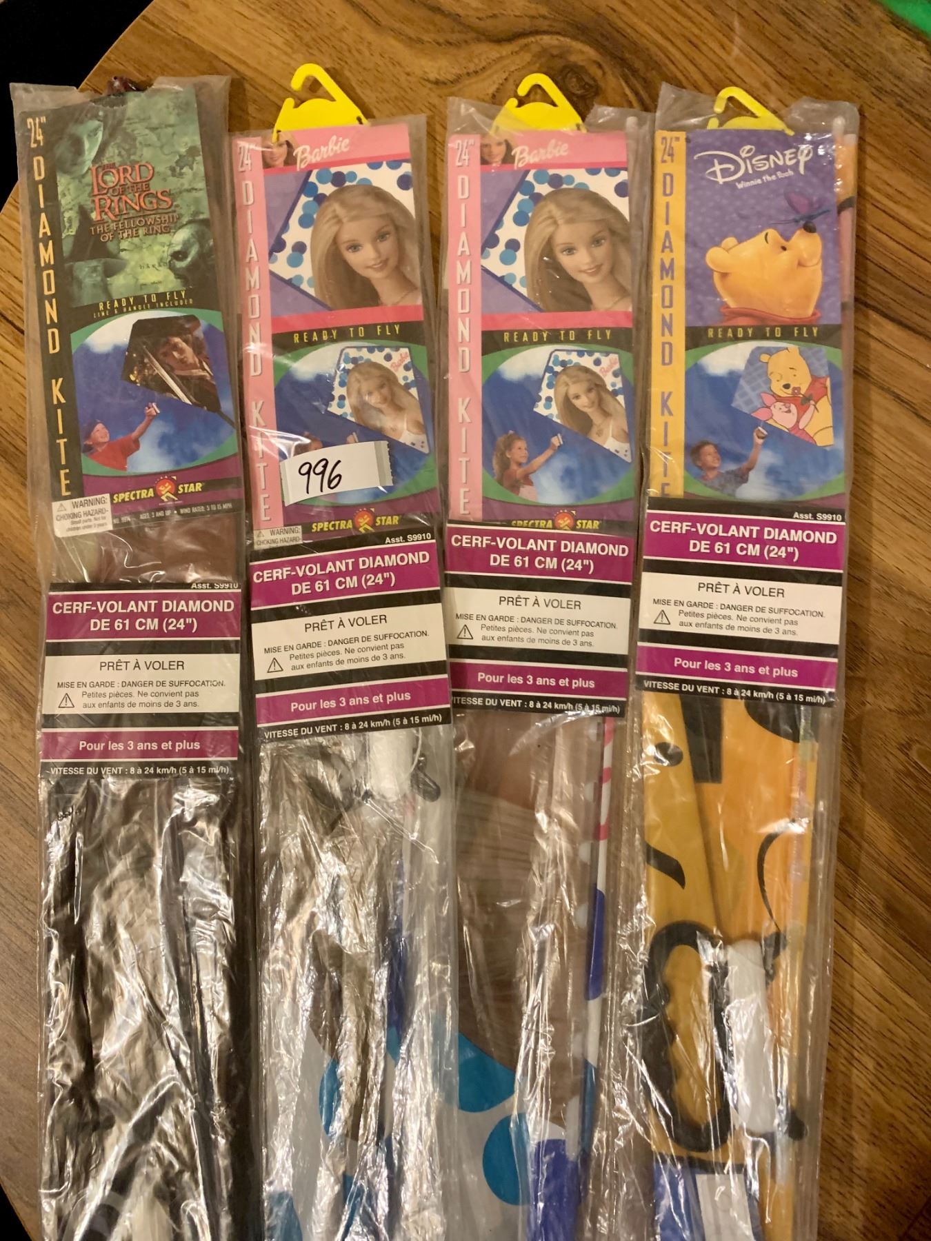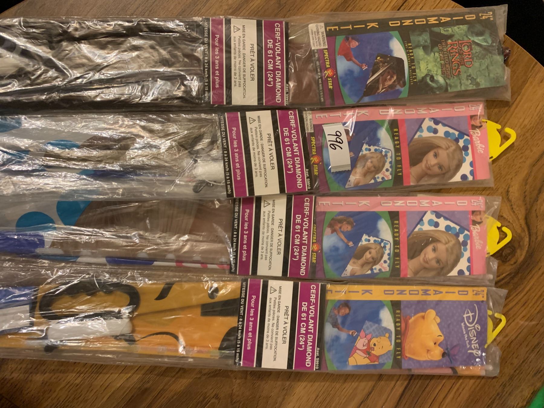 996 – LOT OF 4 LICENSED KITES, 2 BARBIE, 1 WINNIE POOH, AND 1 LORD OF THE RINGS