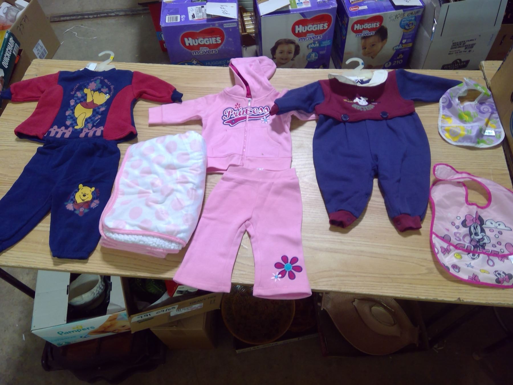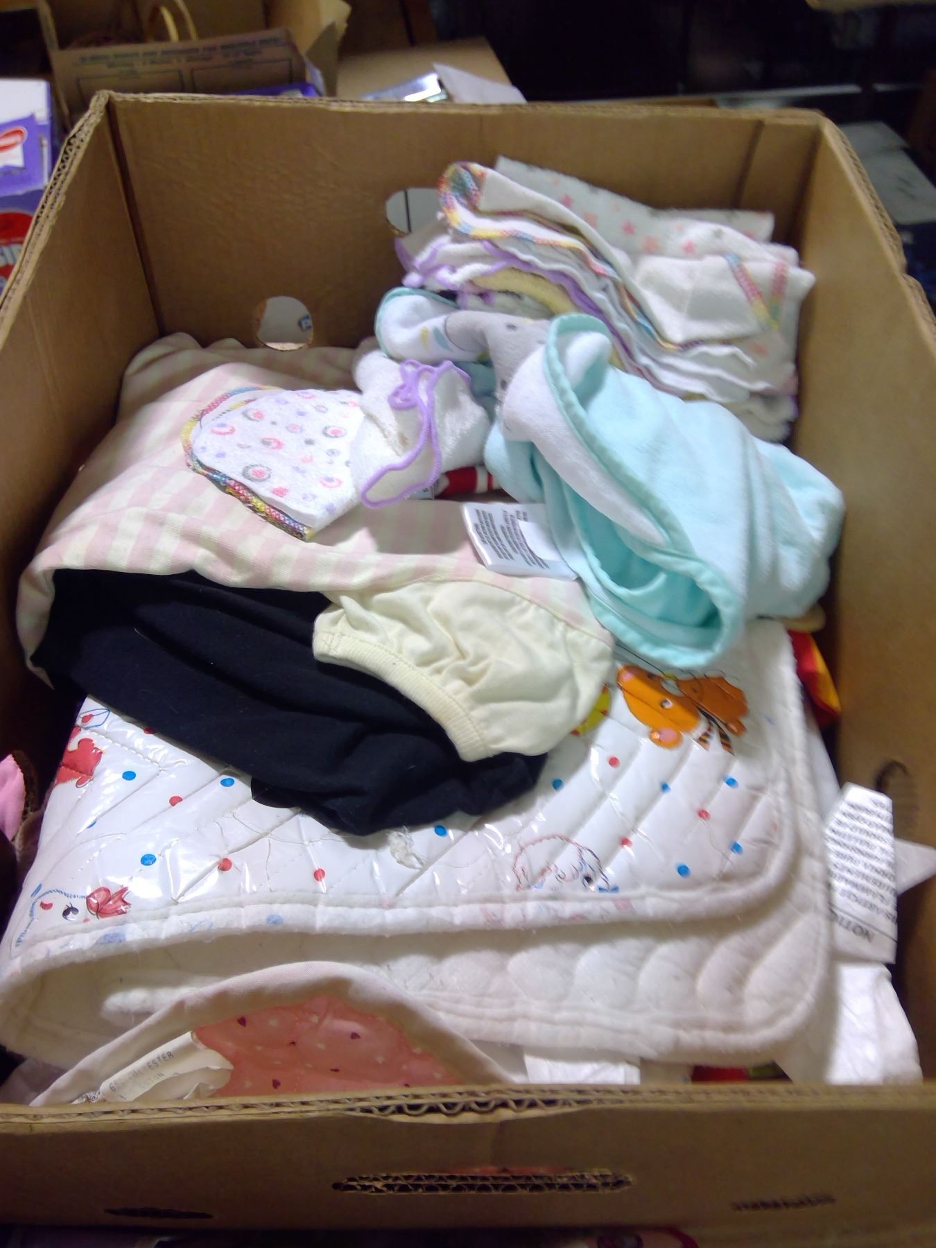 A BOX FULL OF BRAND NEW AND OLD BABY CLOTHES/BLANKETS