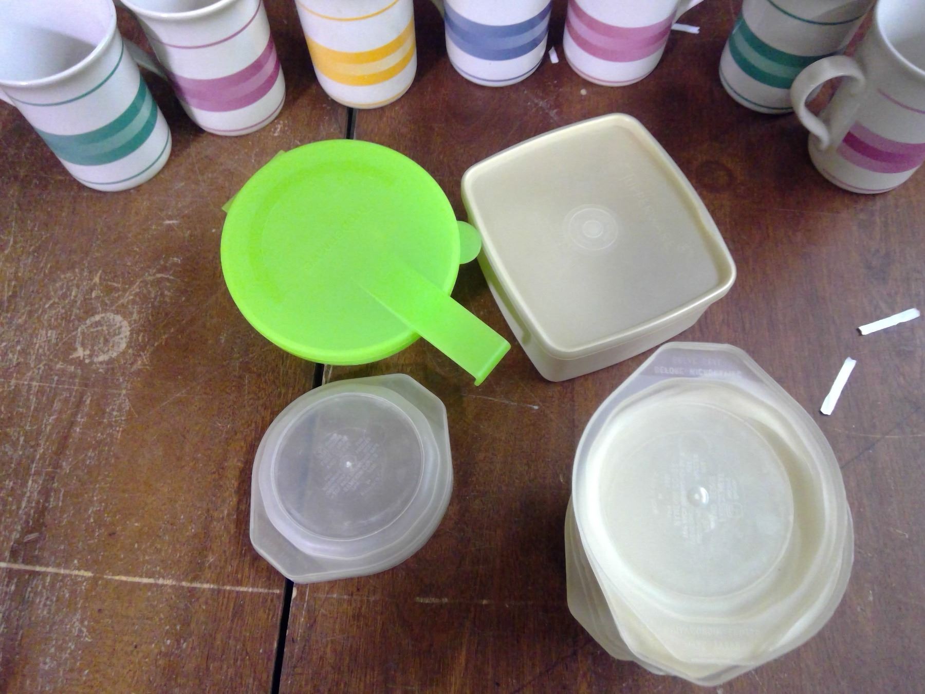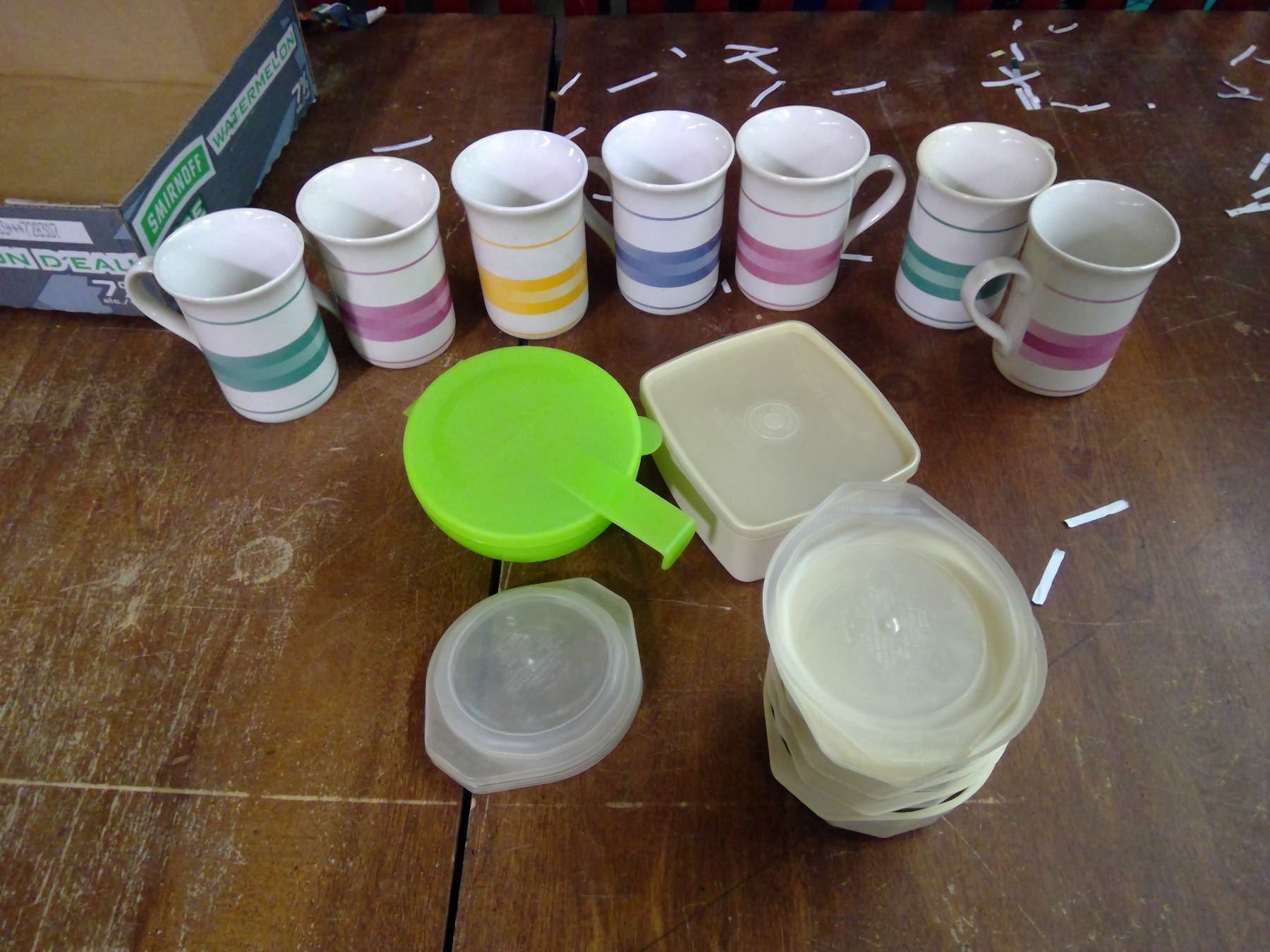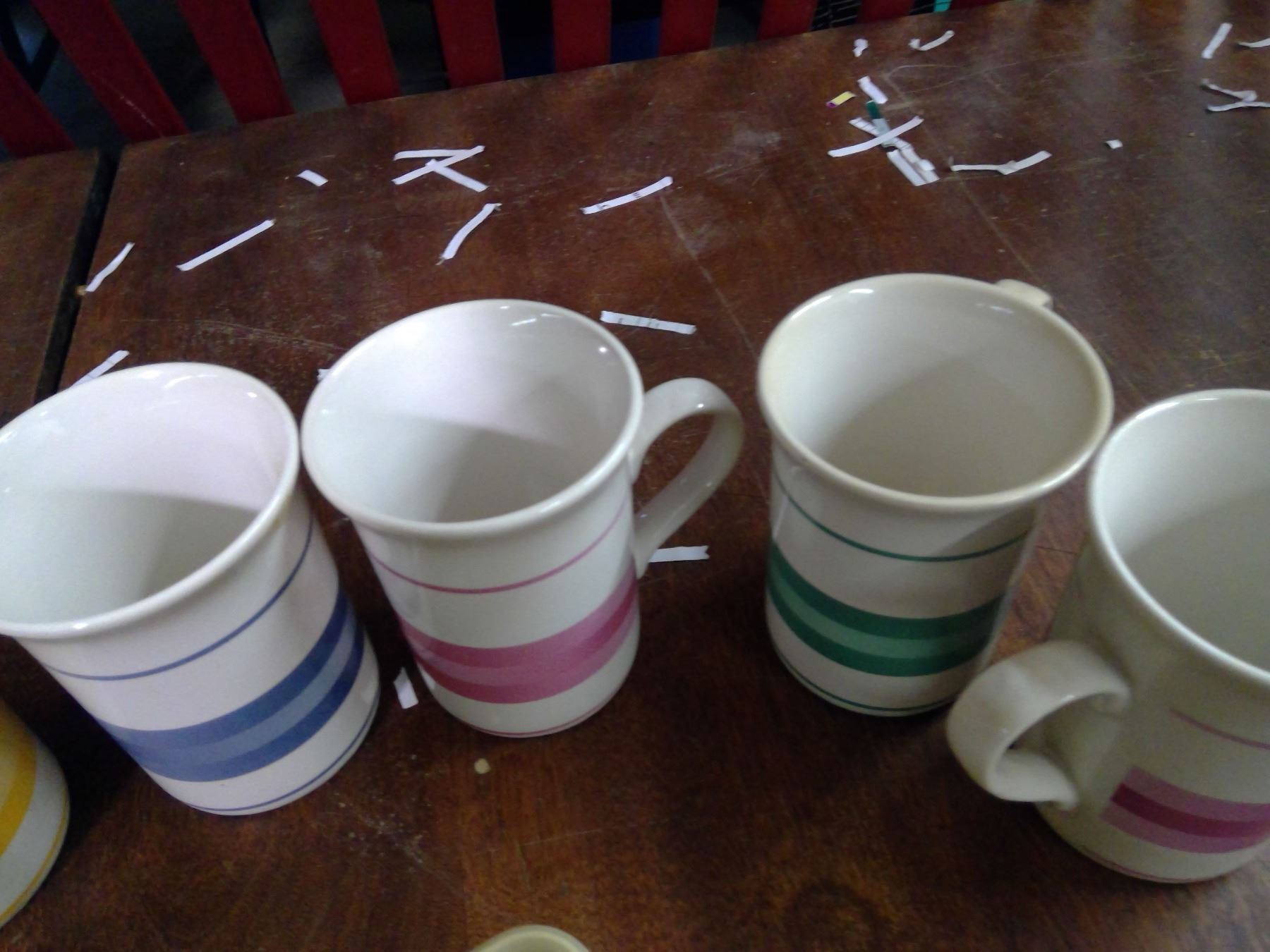 A LOT OF MULTI COLORED MUGS WITH CONTAINERS
