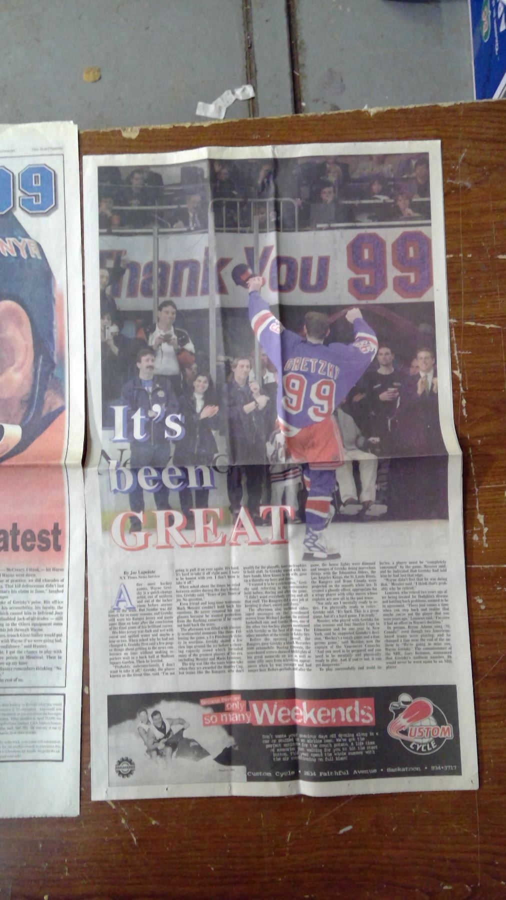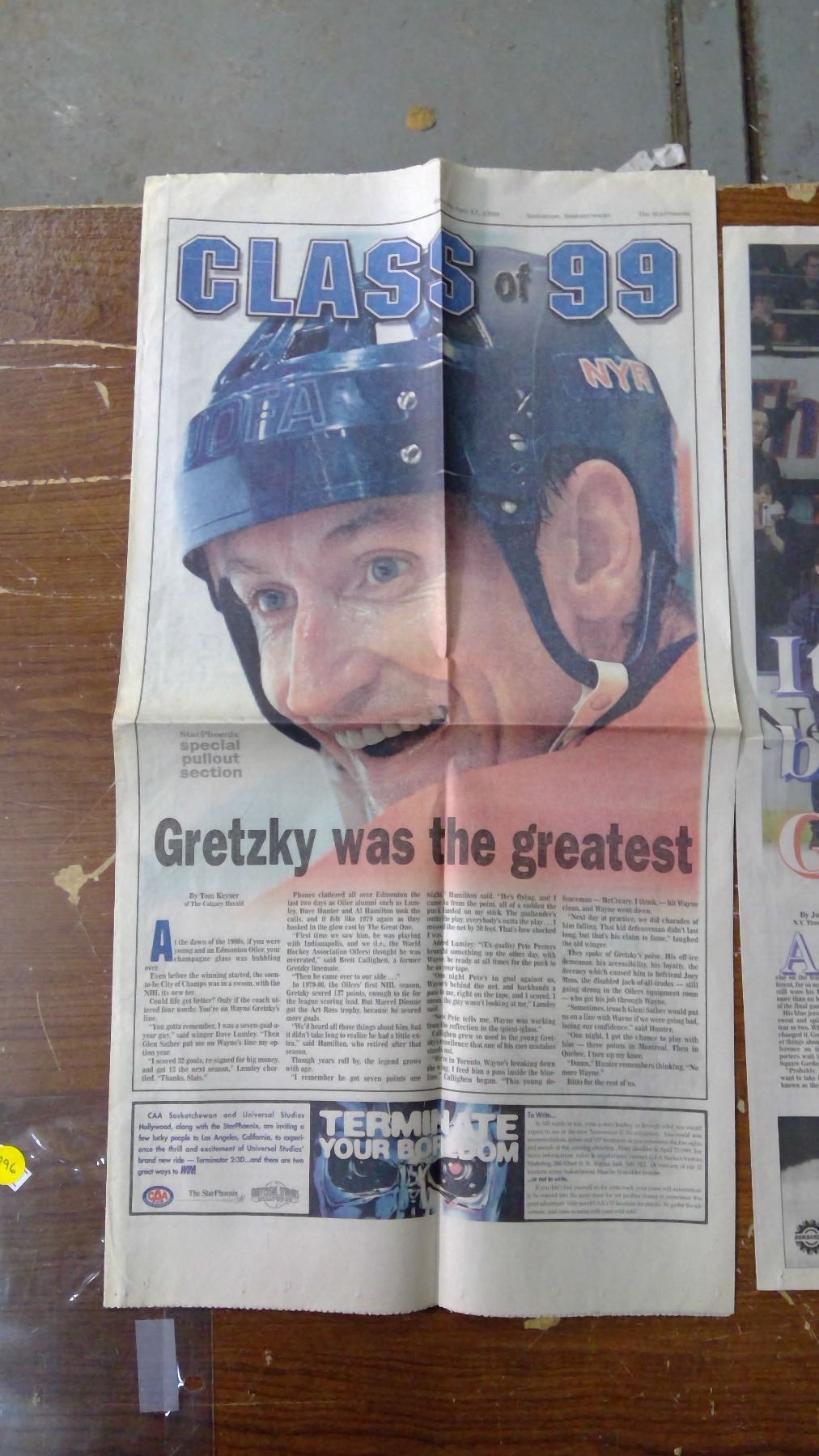 A TRIBUTE TO WAYNE GRETZKY UPON HIS RETIREMENT FROM PLAYING HOCKEY, WITH THE FOLLOWING TEAMS WHL INDIANAPOLIS RACERS, NHL OILERS, KINGS, AND RANGERS BY THE STAR PHEONIX - APRIL 17 1999