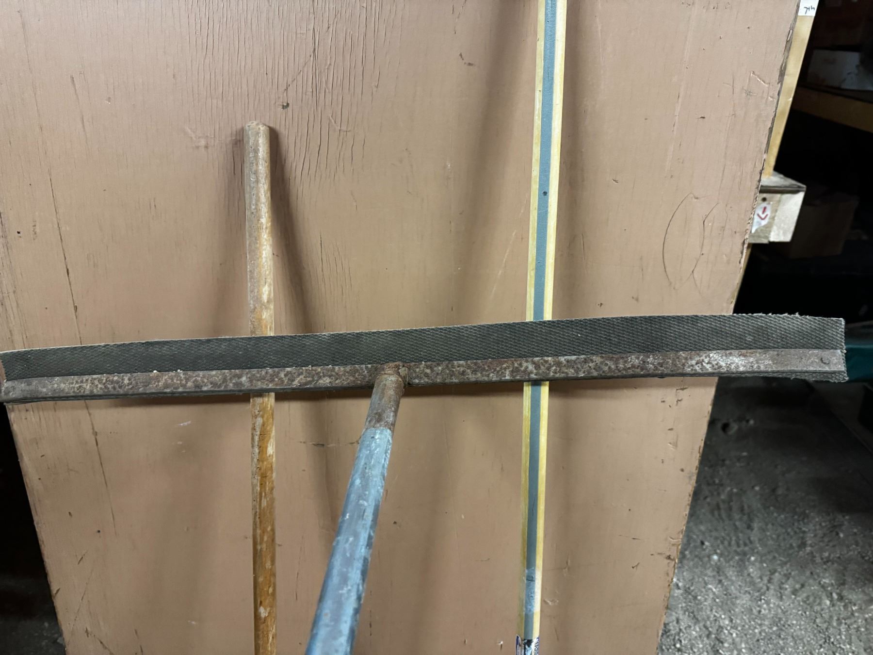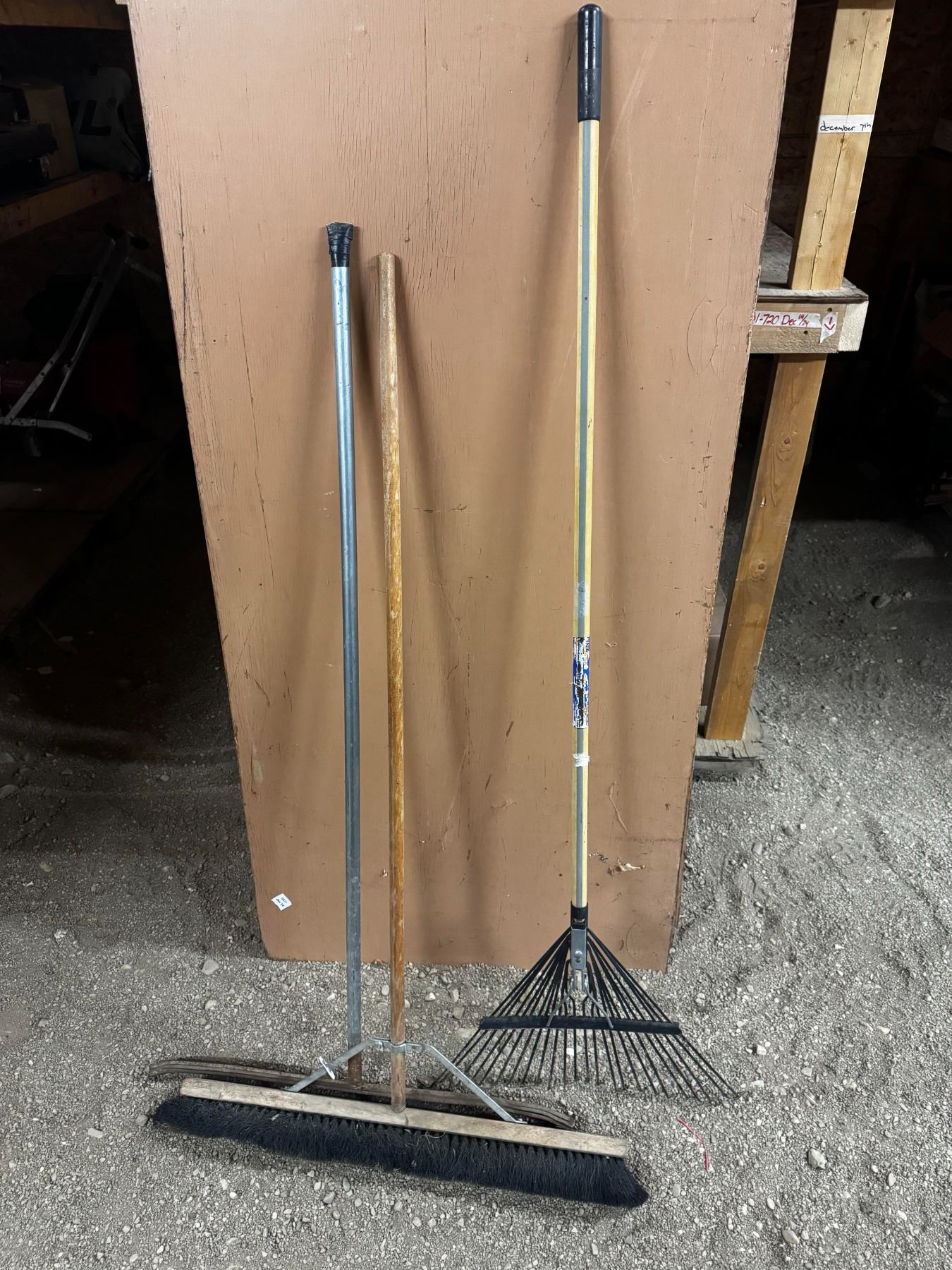 A broom, Squeegee and Rake.