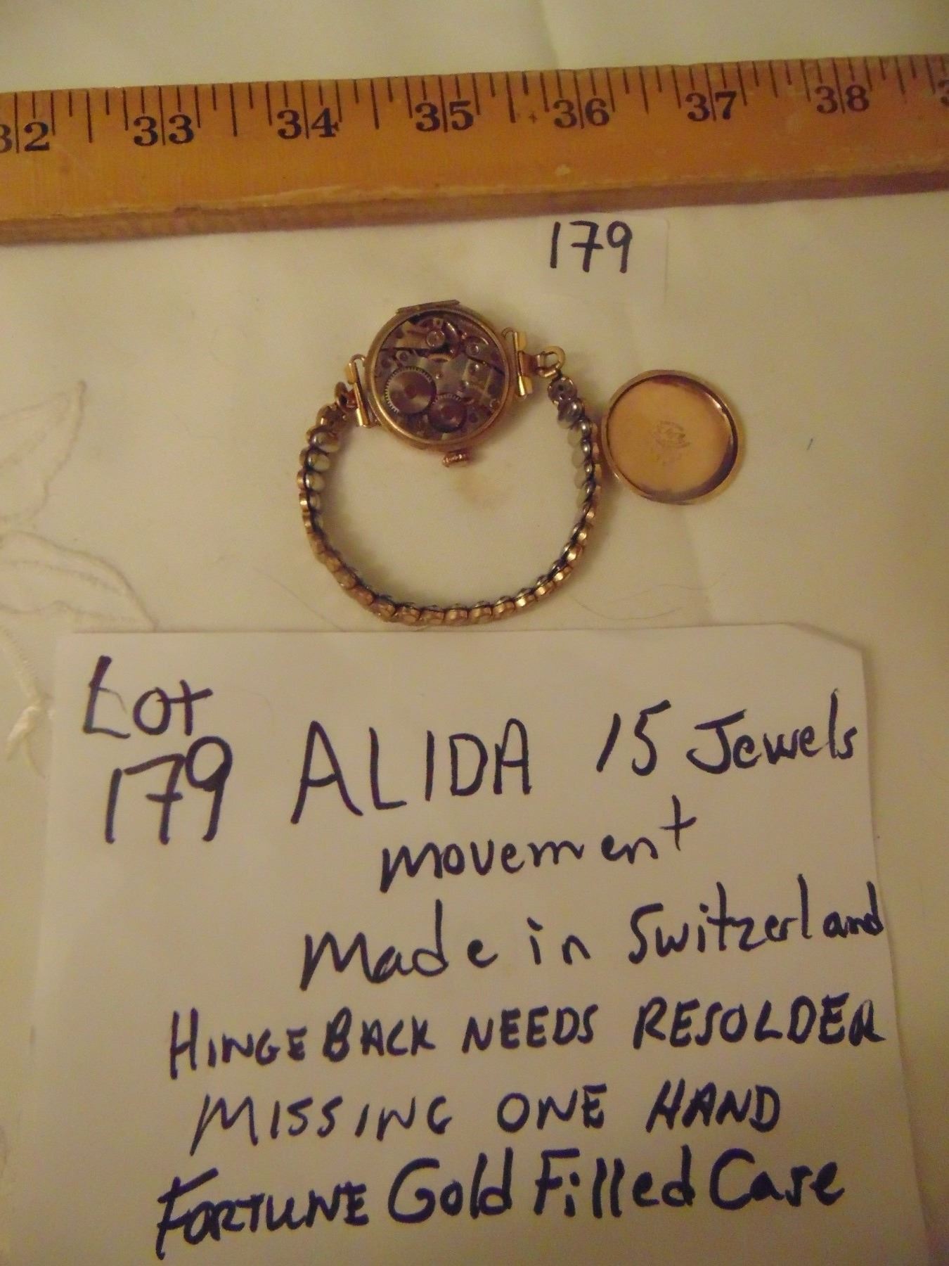 ALIDA 15 JEWEL SWISS GOLD FILLED CASE RUN MISSING HAND CASE NEEDS HINGE REPAIRED