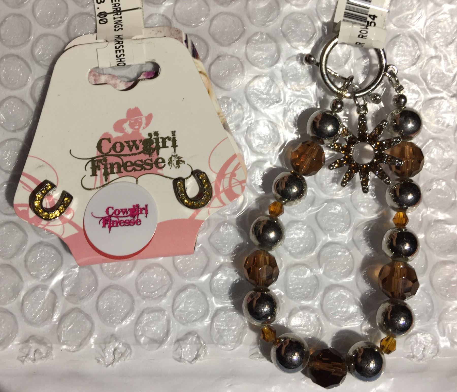 AMBER STONE WESTERN HORSESHOE EARRINGS/AMBER CRYSTAL SPUR ROWEL BRACELET/NICKEL FREE
