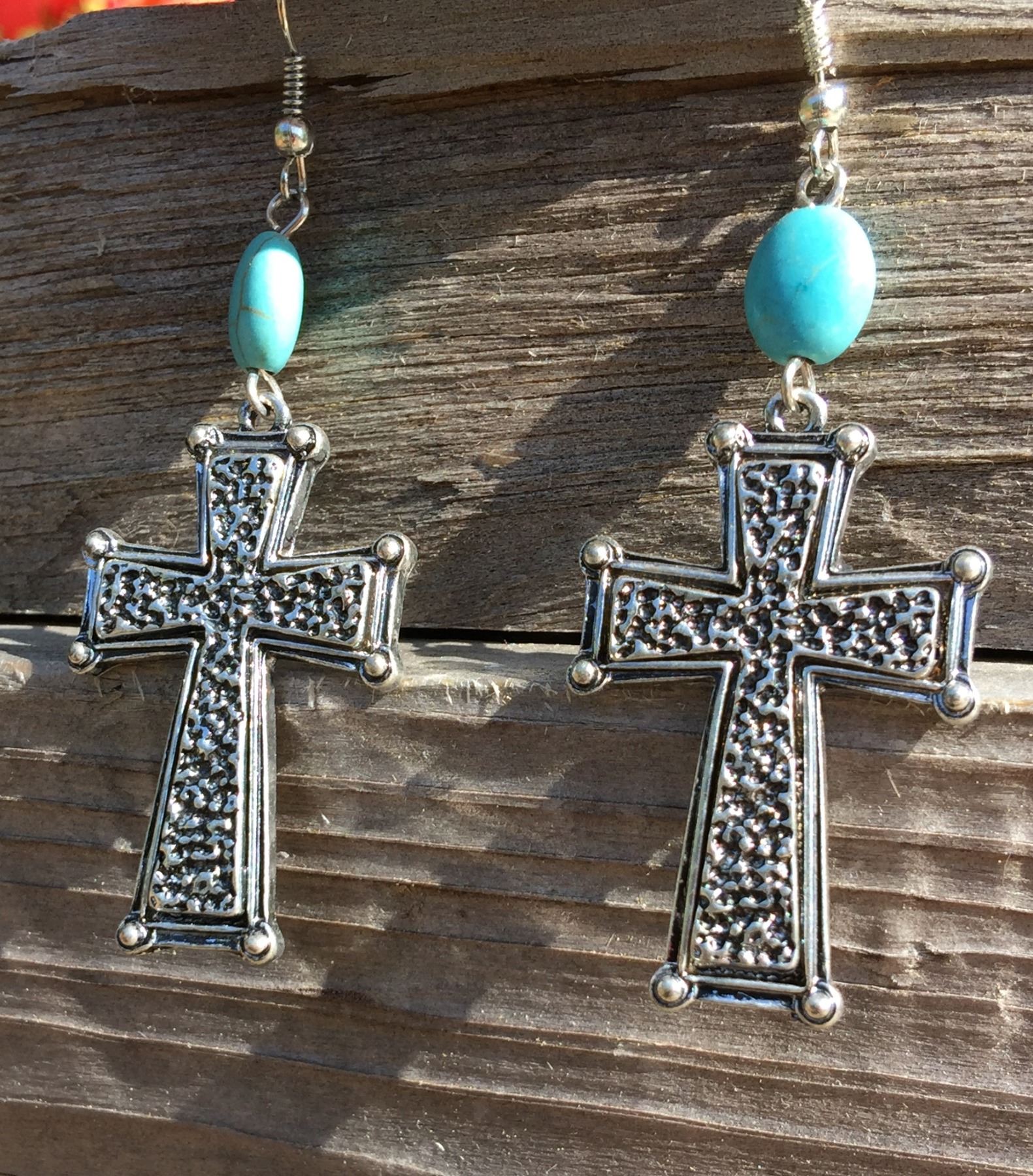 ANTIQUE SILVER CROSS/TURQUOISE BEADED HOOK EARRINGS