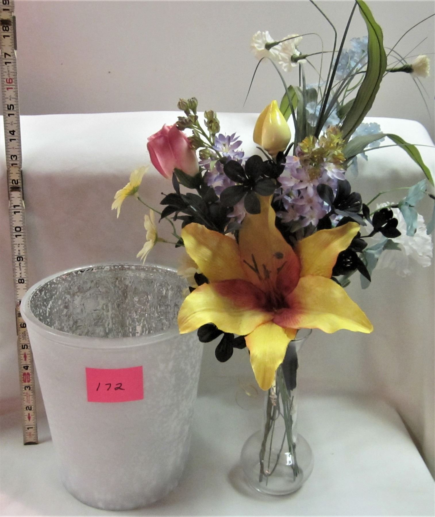ARTIFICIAL FLOWERS/VASE AND GARBAGE CONTAINER