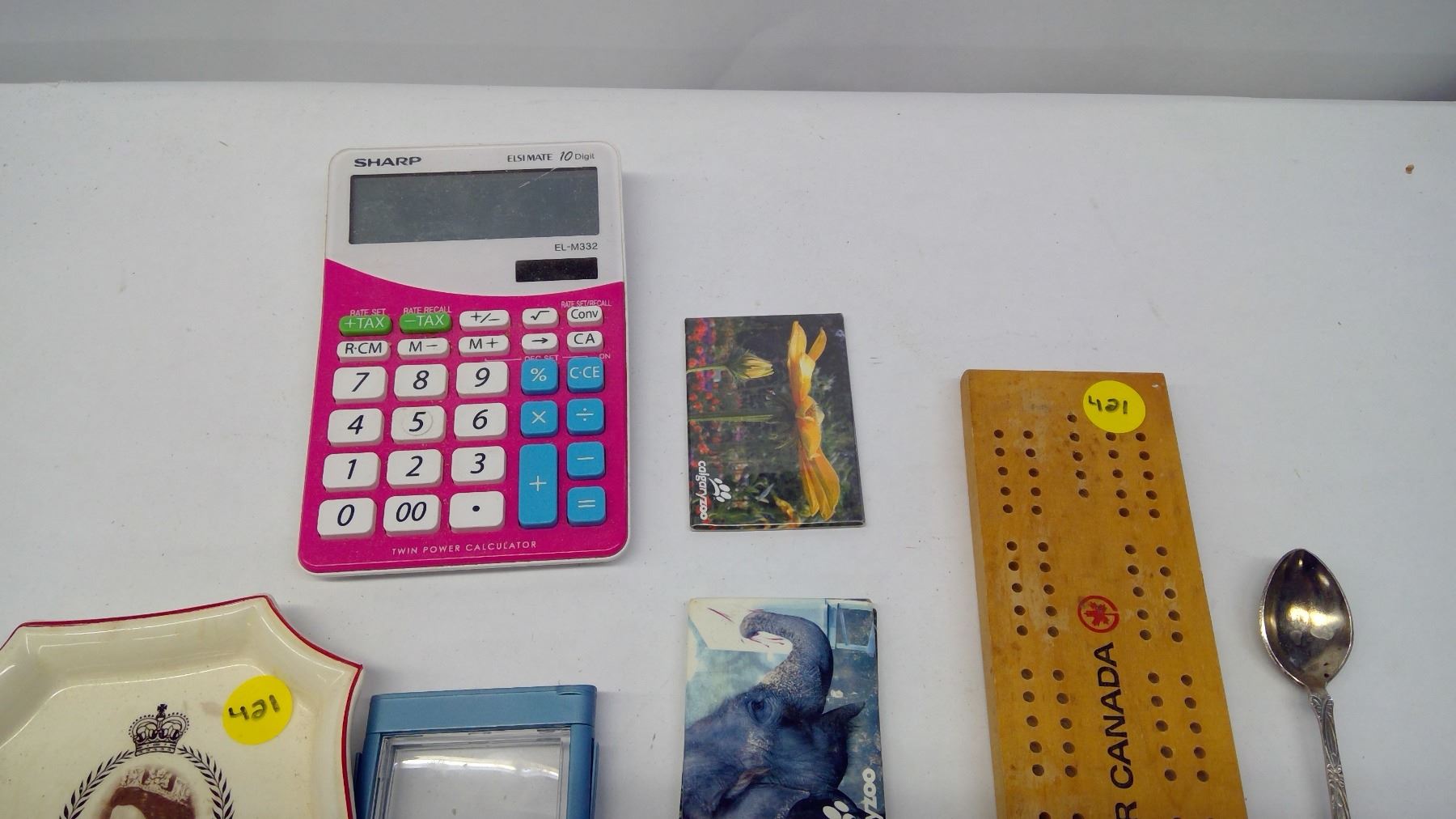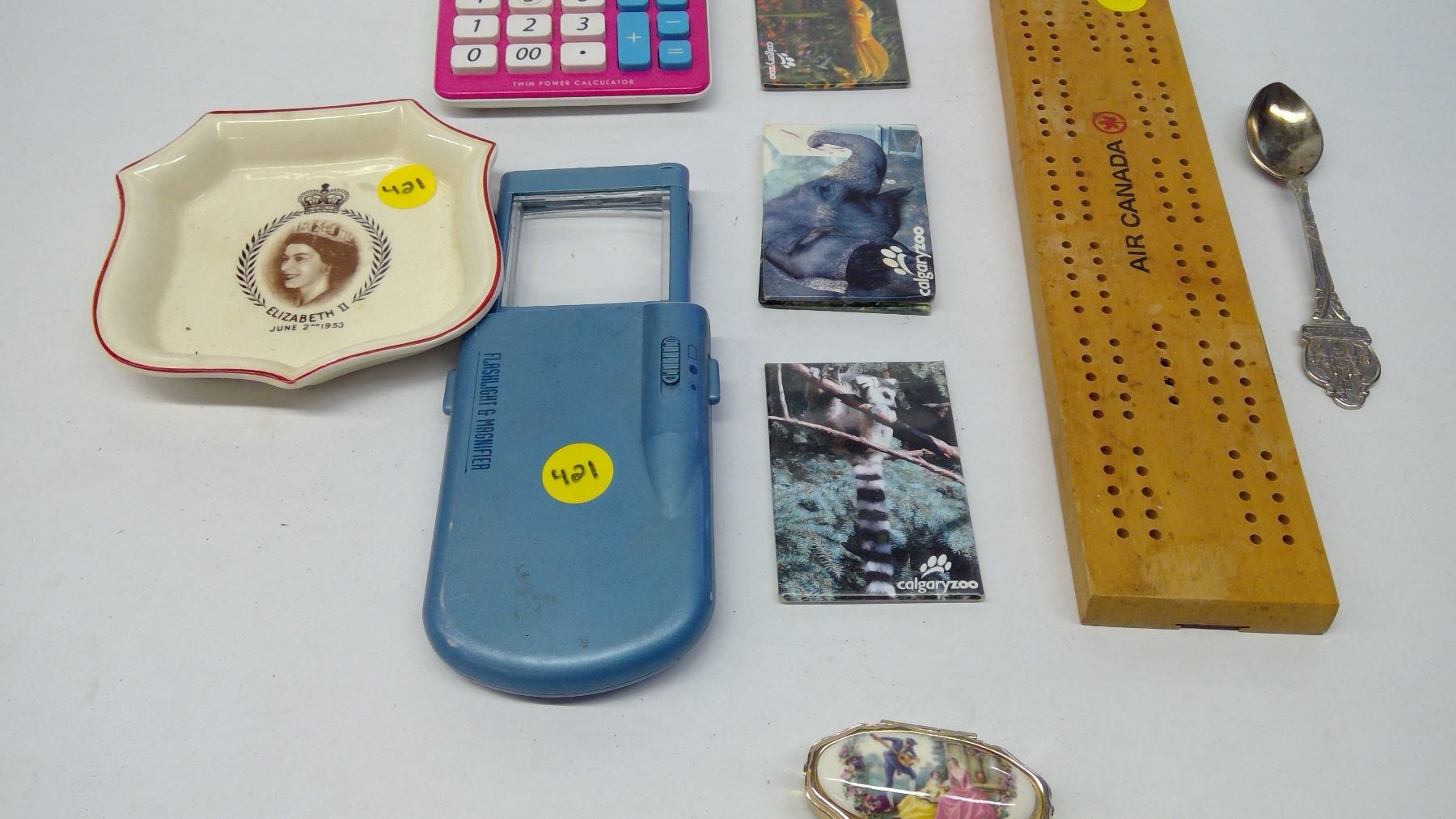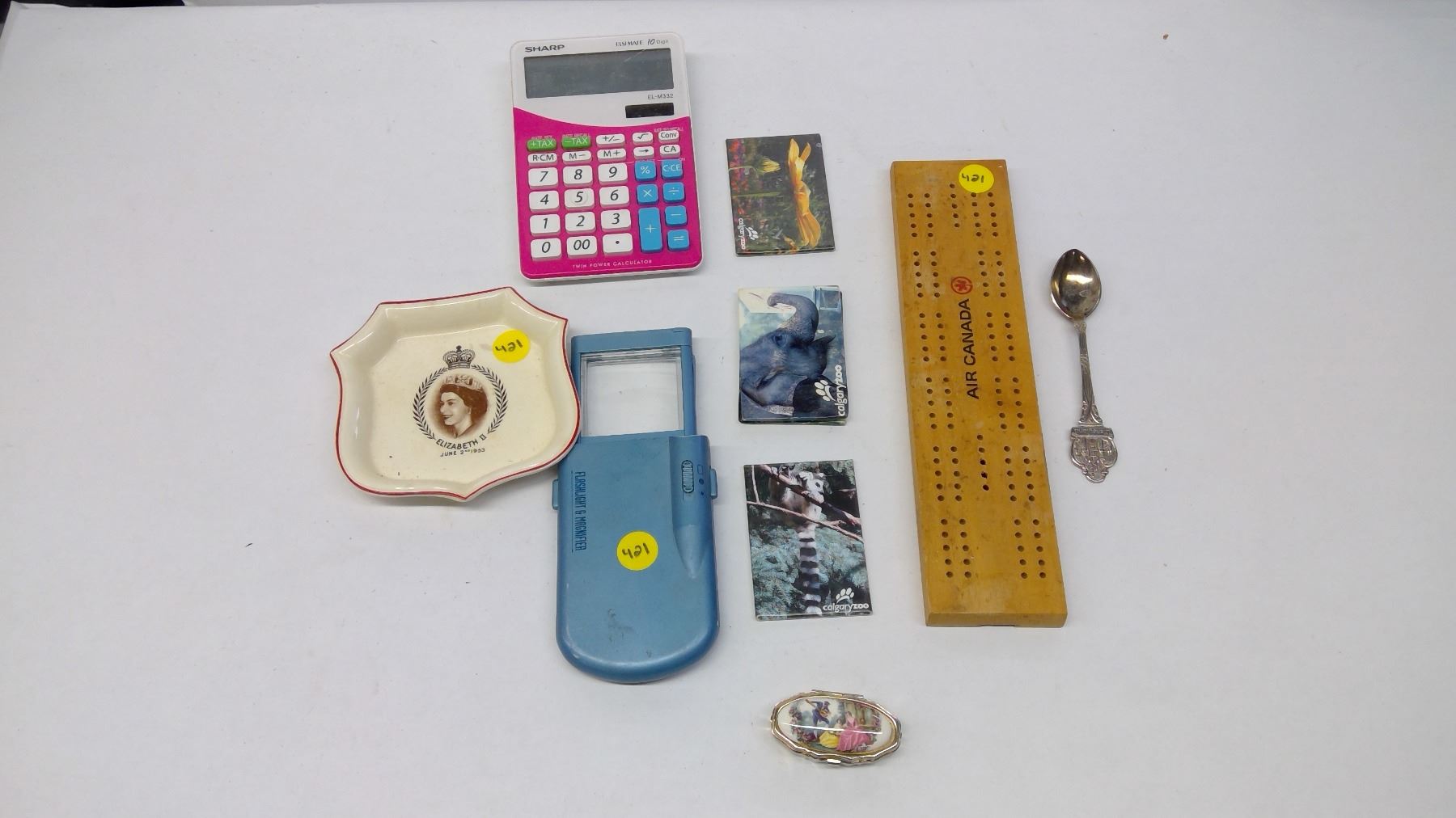 magnifying glass with light, Queen Elizabeth mini plate, oill box, calculator, small crib board and fridge magnets