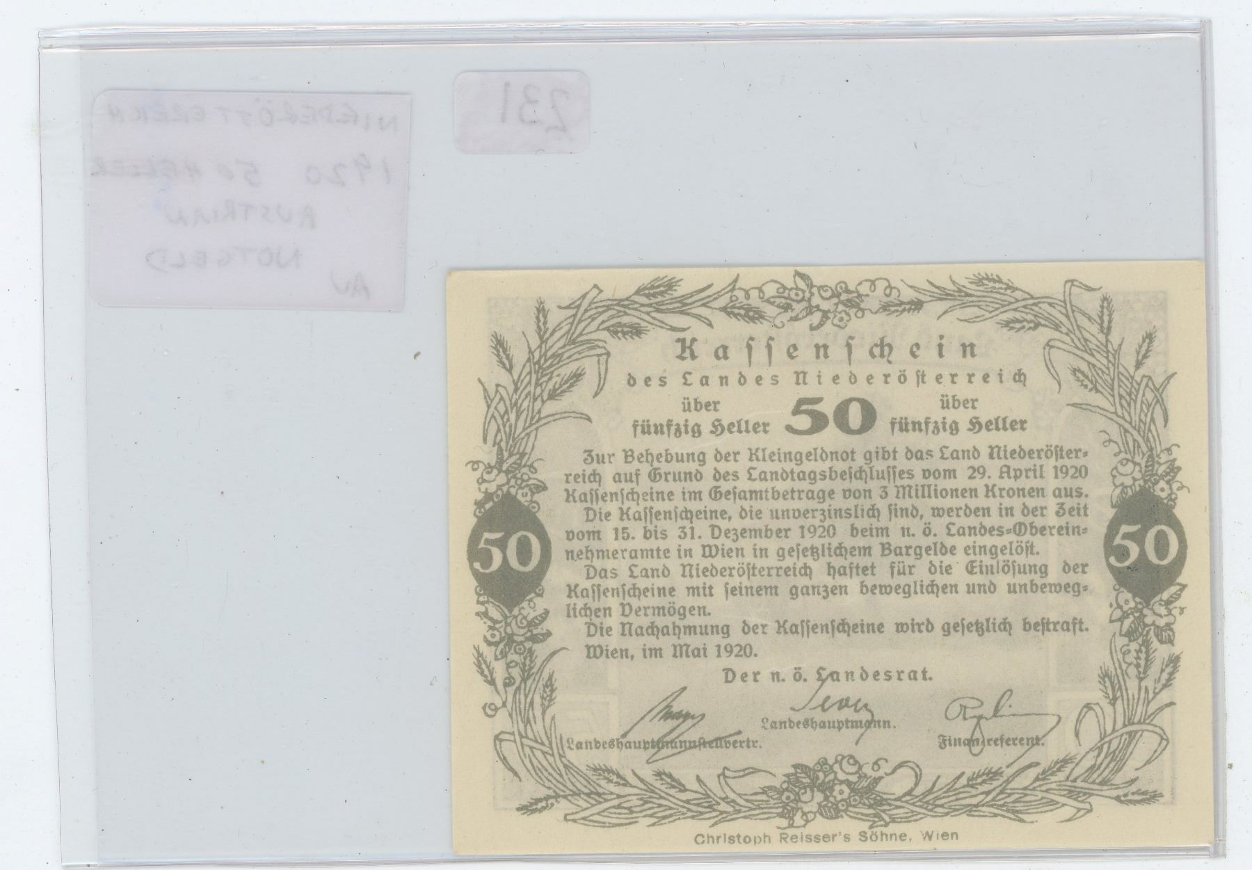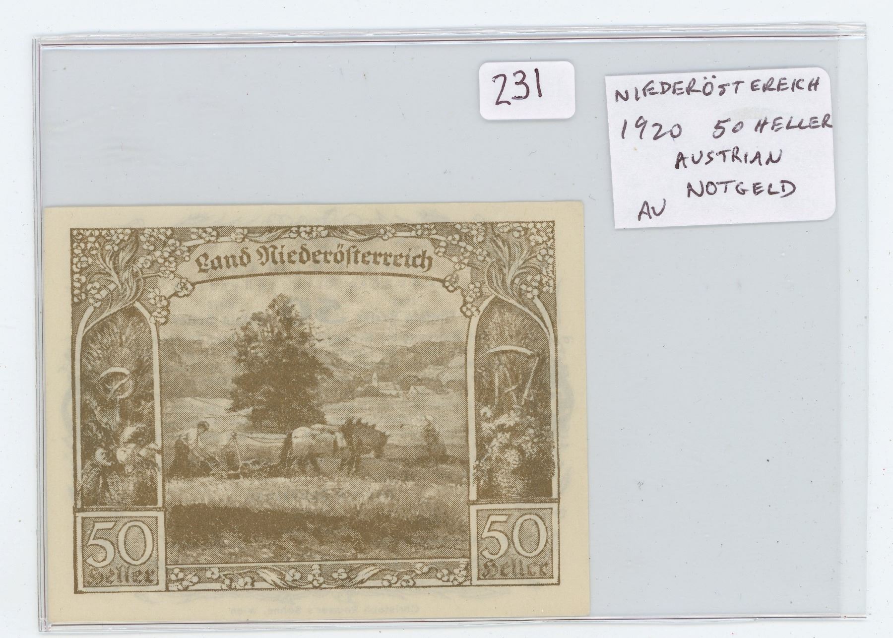 AUSTRIA NOTGELD. NIEDEROSTEREICH (LOWER AUSTRIA) 1920 50 HELLER. AU. NICE.