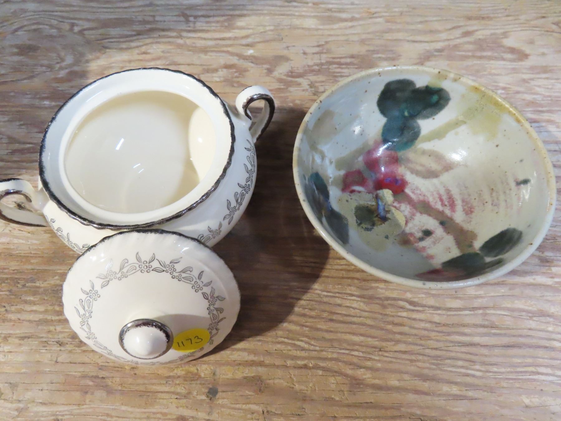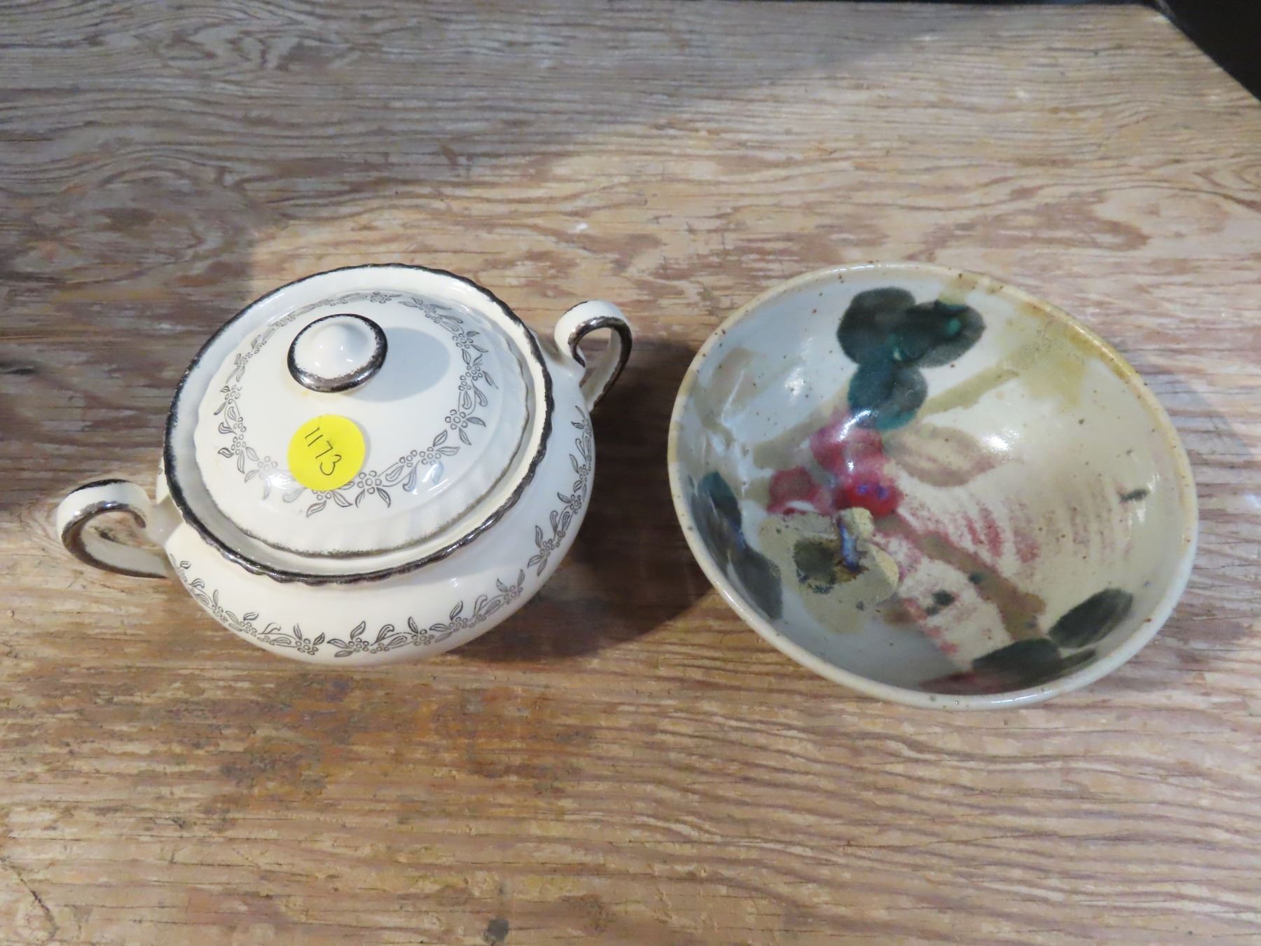 Abstract serving bowl unmarked stoneware& and vintage 2 handle sugar bowl/ lid-pink rose