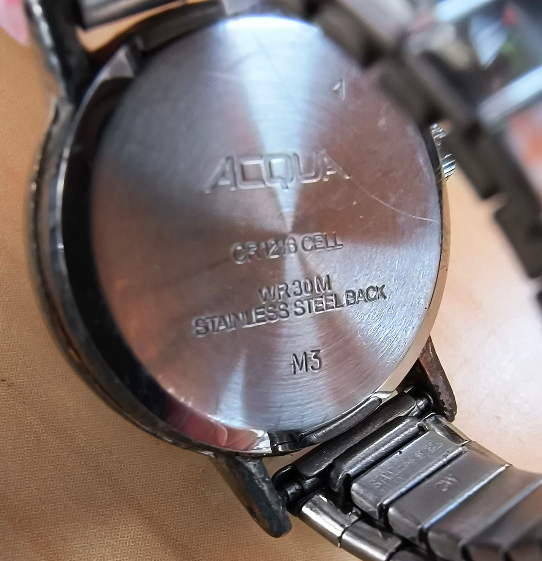 great condition, stainless steel back, water resistant 30m, marked "M3"