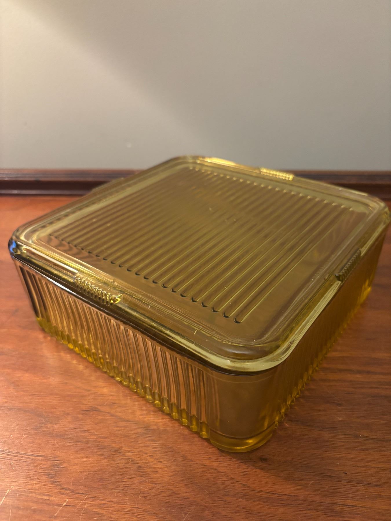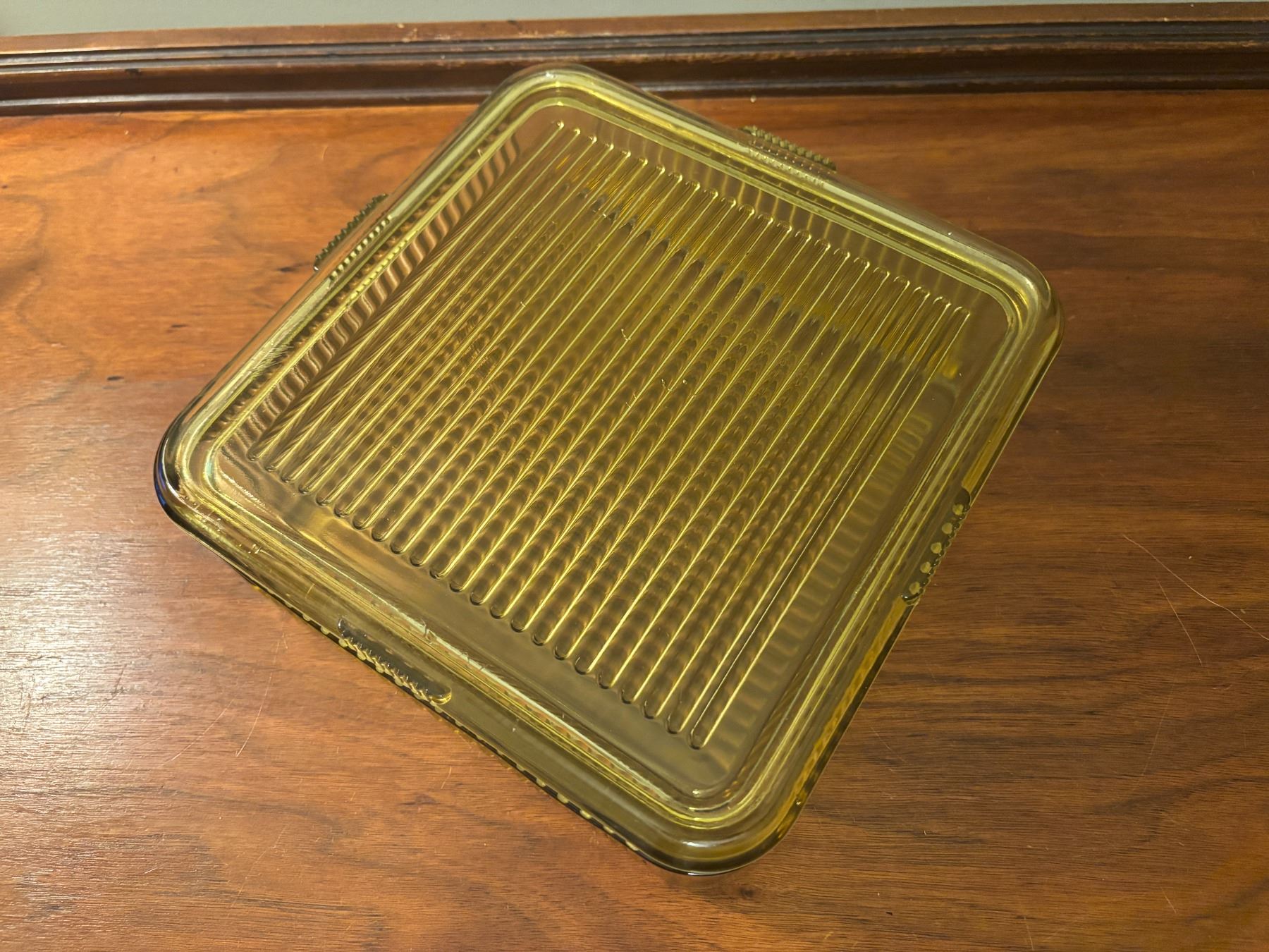 Measures 8.5” square, heavy antique glass napkin holder with lid.