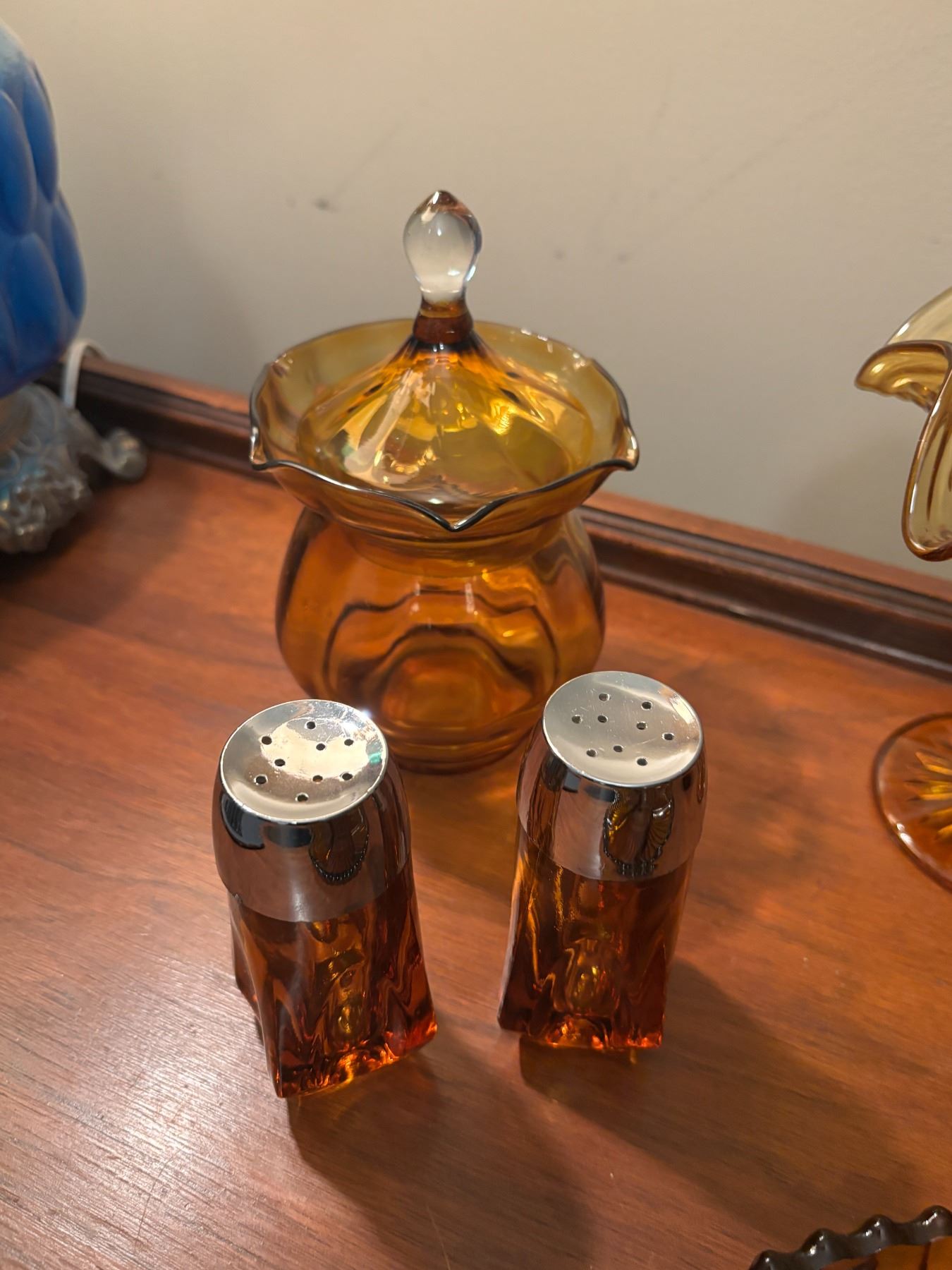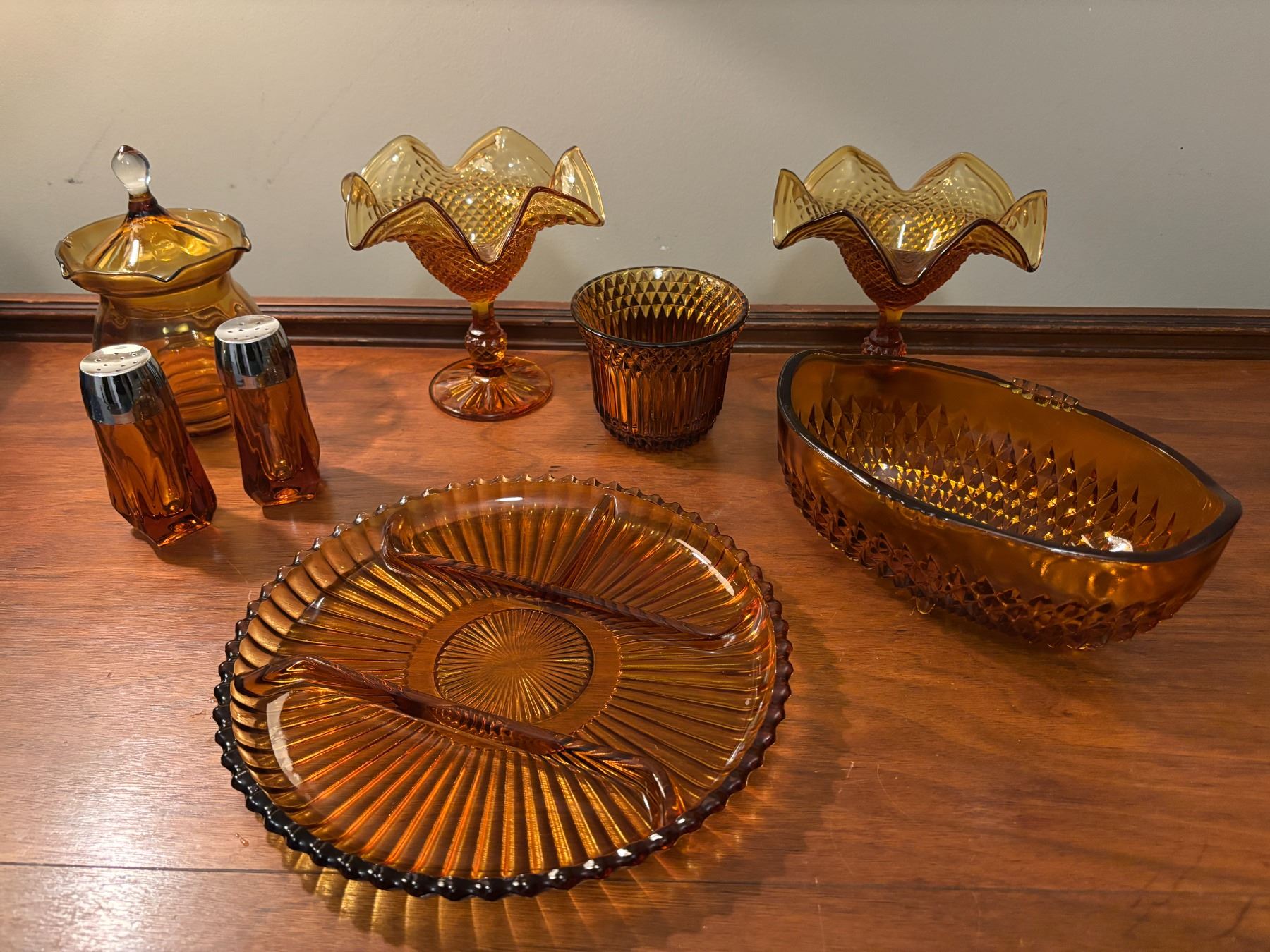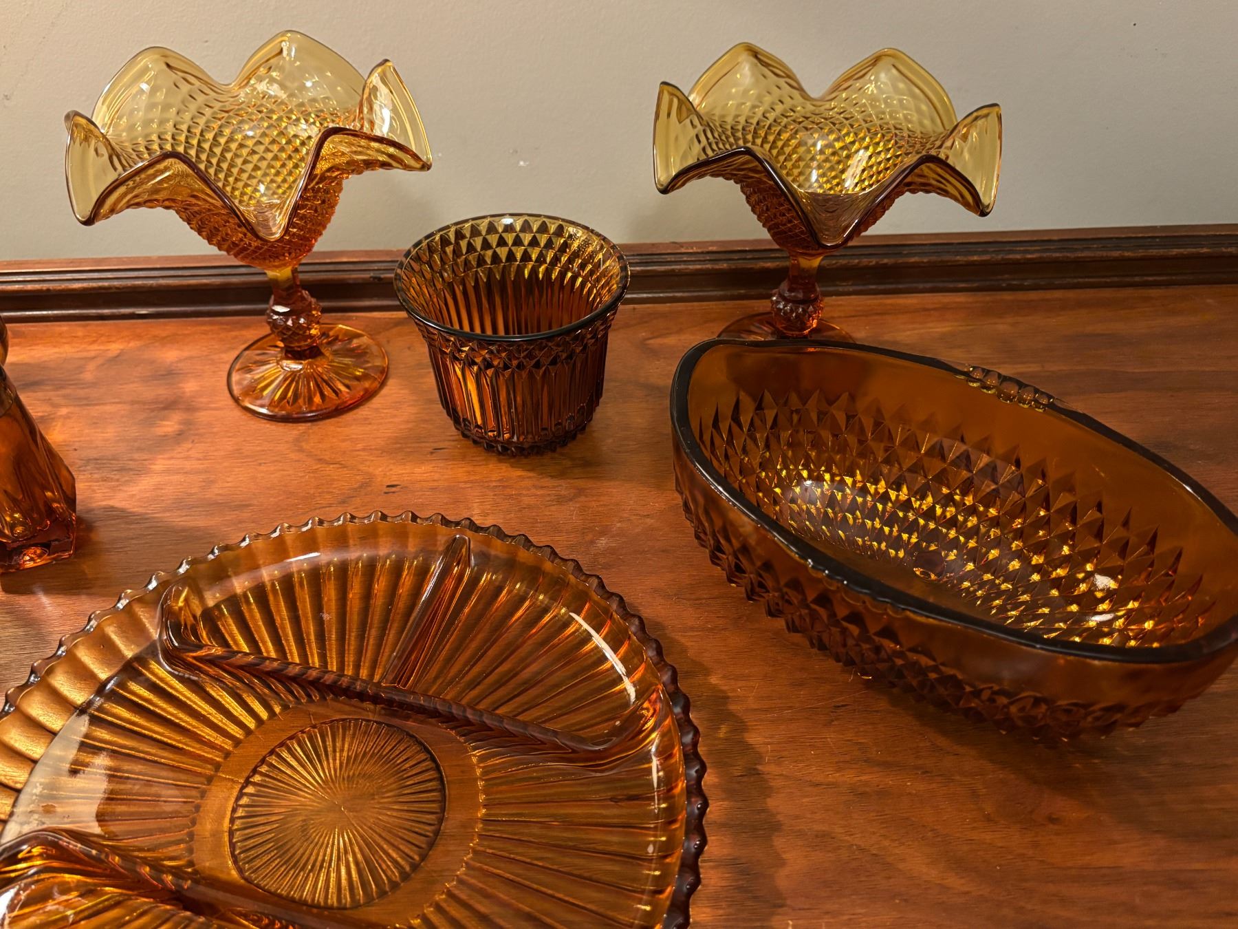 Vintage amber glass, very showy to dress up your table for the holidays or use for everyday!