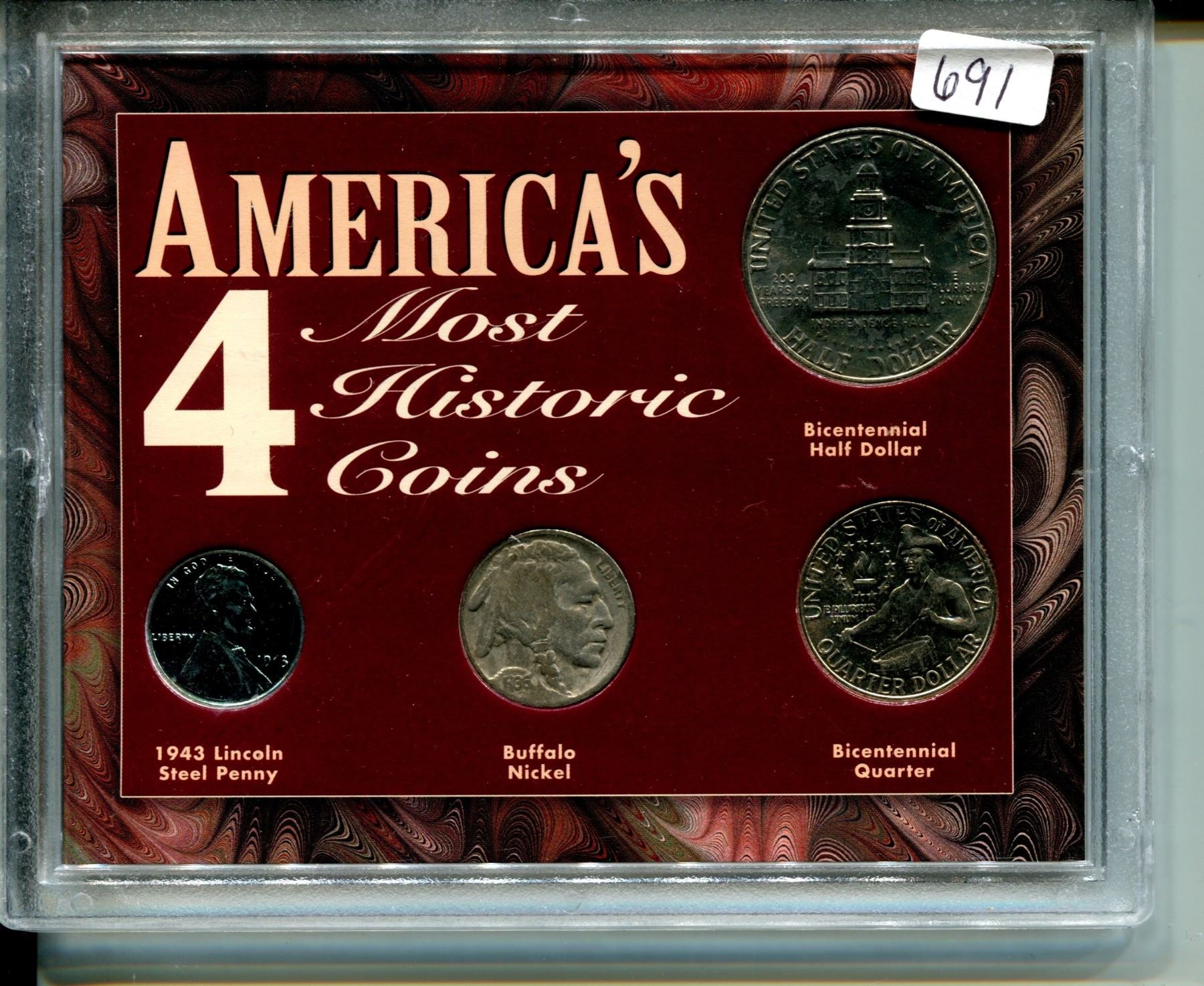 America’s 4 Most Historic Coins. 4-coin set includes 1943 Lincoln Steel Cent, 1936 Buffalo Nickel, 1976D Bicentennial Washington Quarter & 1976 Bicentennial Kennedy Half Dollar. Housed in a UPM hard plastic case.