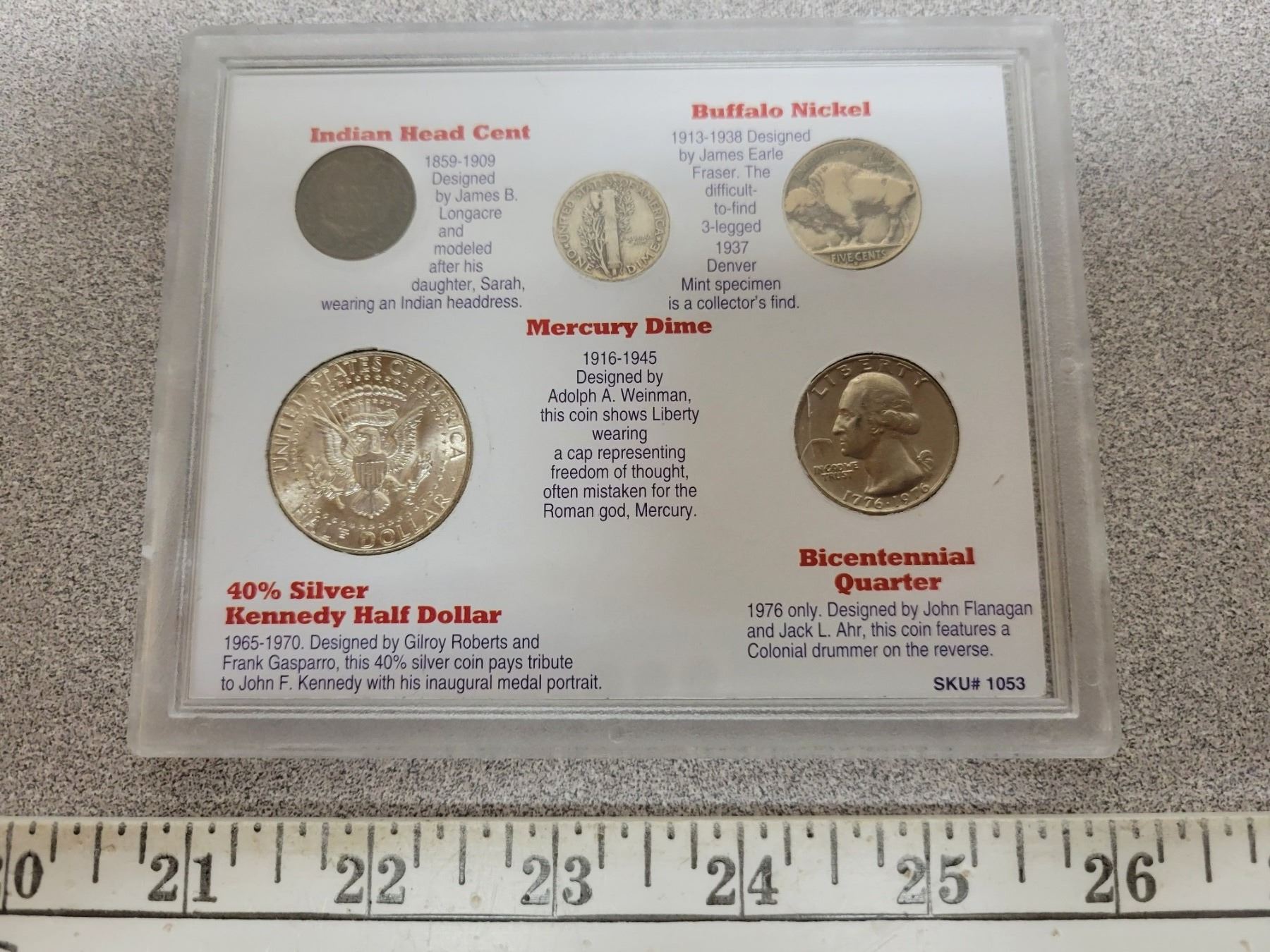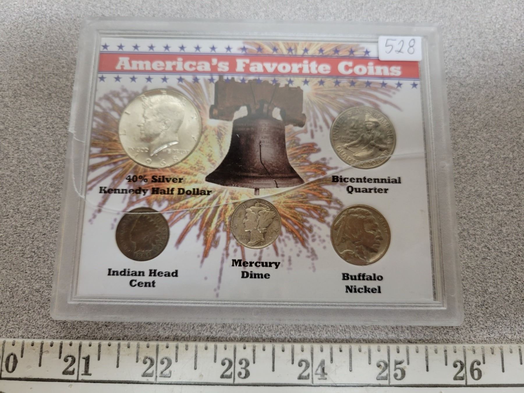 America’s Favorite Coins: Set of 5 coins including Indian Head Cent, Buffalo Nickel, Silver Mercury Dime, Bicentennial Quarter and Silver Clad Kennedy Half Dollar. Housed in a hard plastic holder.