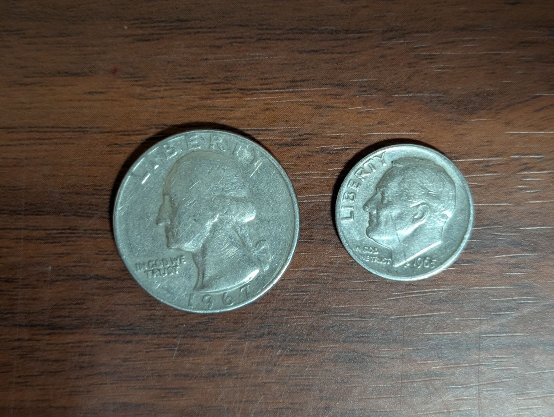 American 25 Cent Coin 1967 and American 1965 10 Cent Coin