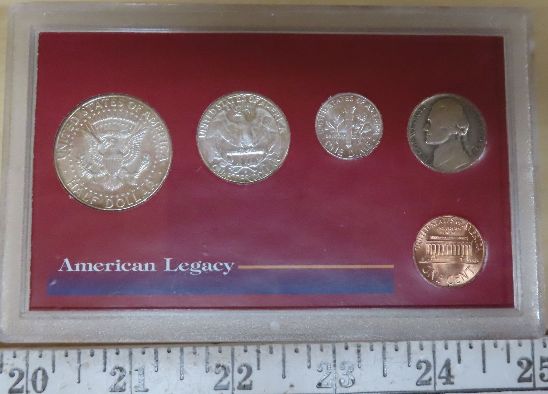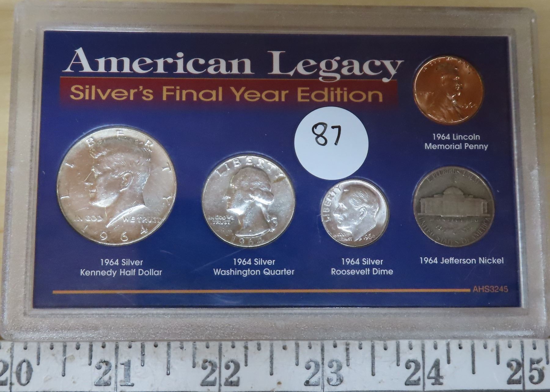 American Legacy Silver’s Final Year Edition. Consists of 1964 Lincoln Memorial Cent, Jefferson Nickel, Silver Roosevelt Dime, Silver Washington Quarter & Silver Kennedy Half Dollar. Housed in a hard plastic holder.