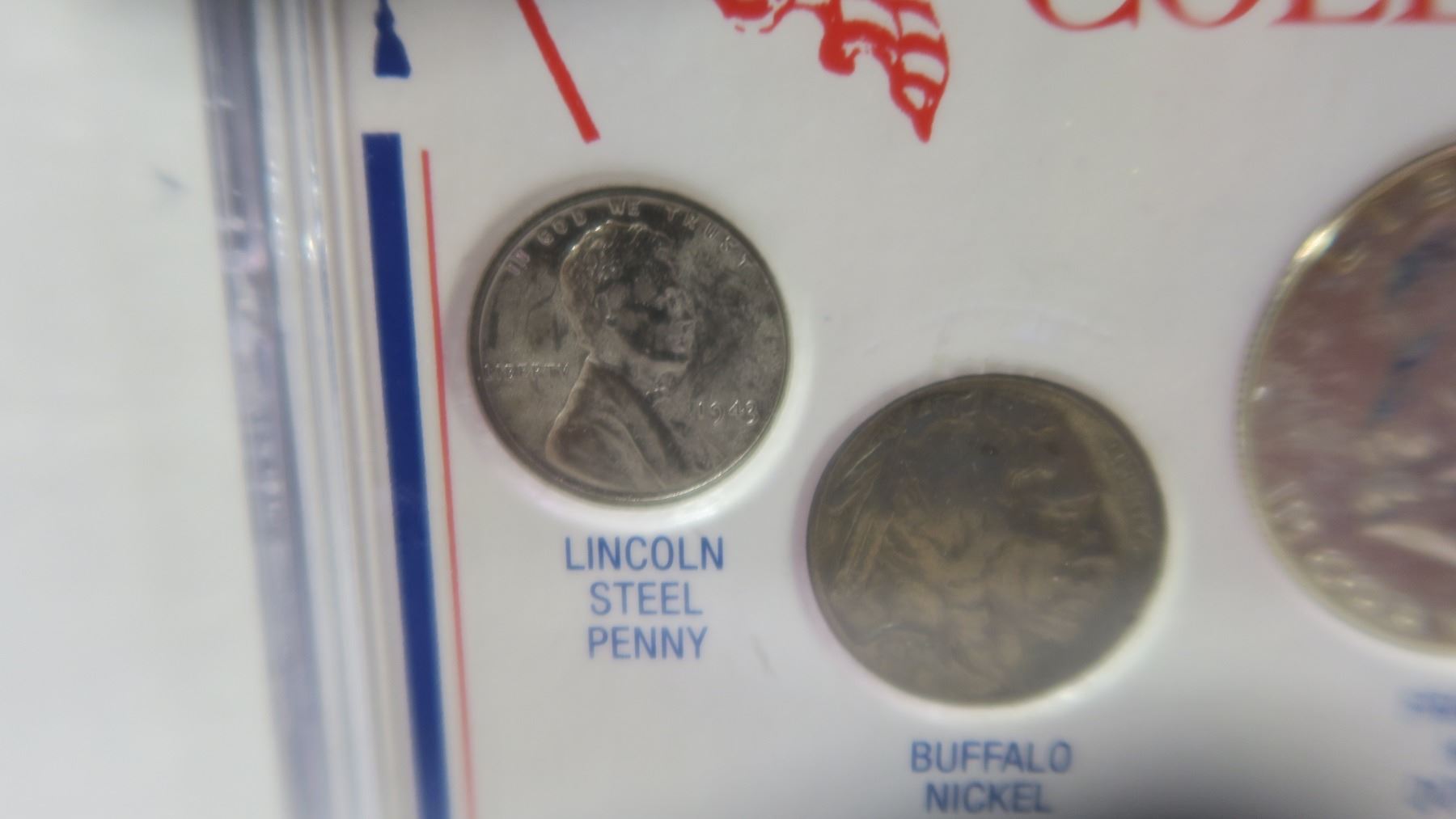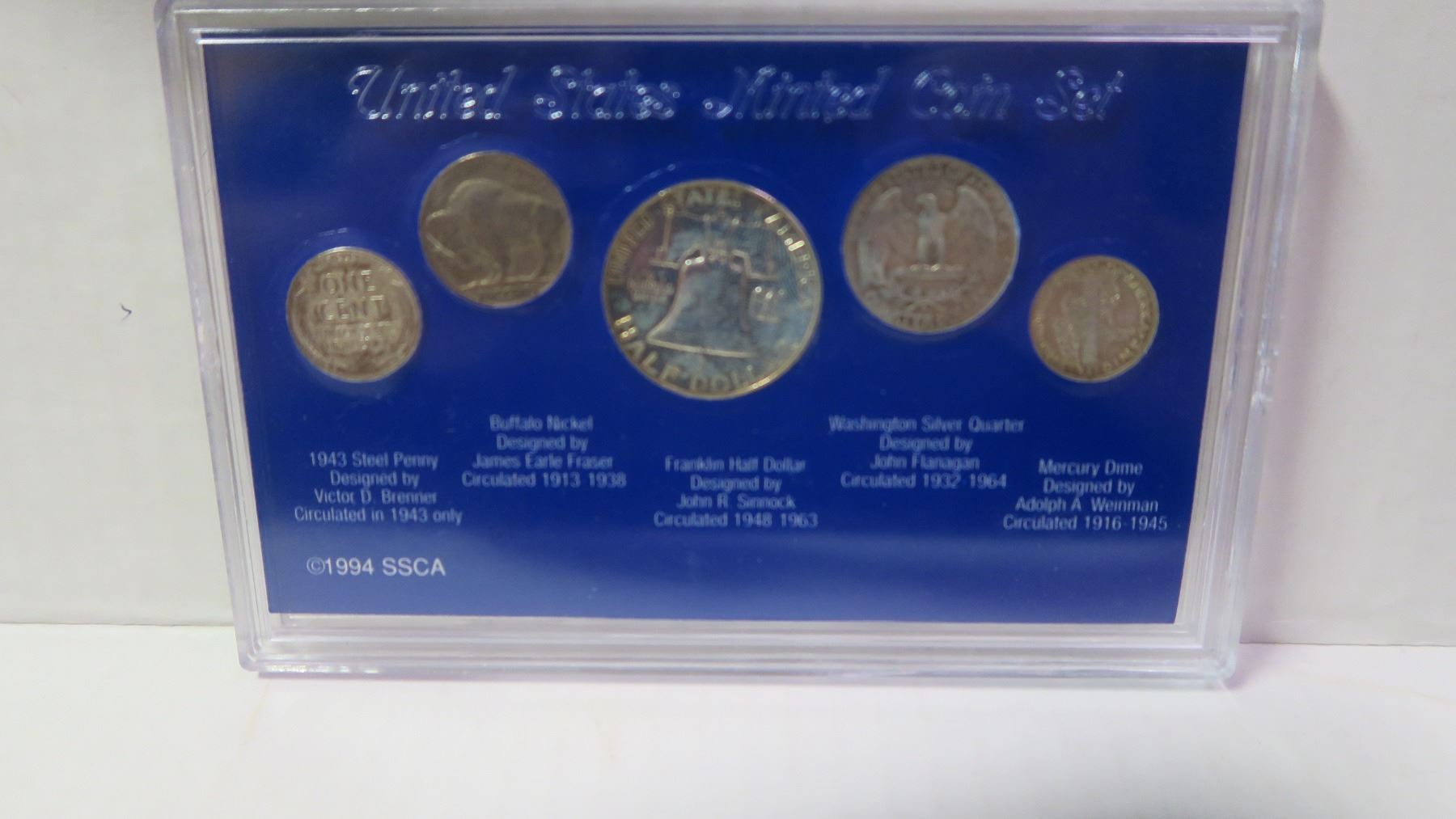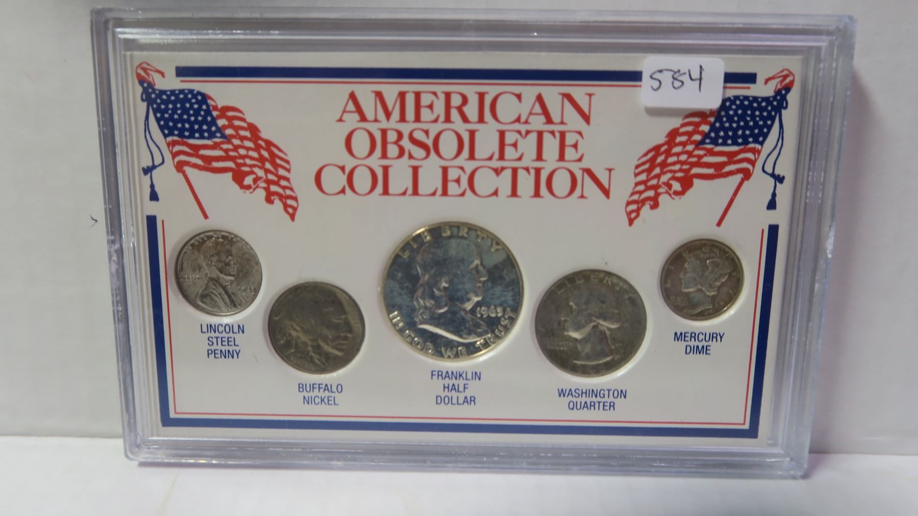 American Obsolete Collection. 5-coin set includes 1943 Lincoln Steel Cent, 1934 Buffalo Nickel, 1941 Silver Mercury Dime, 1946S Silver Washington Quarter & 1963 Silver Ben Franklin Half Dollar. Housed in a SSCA case.