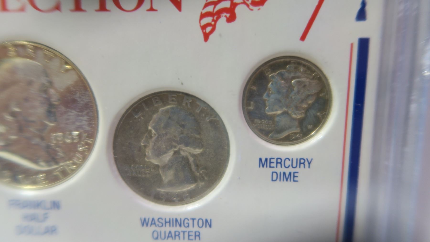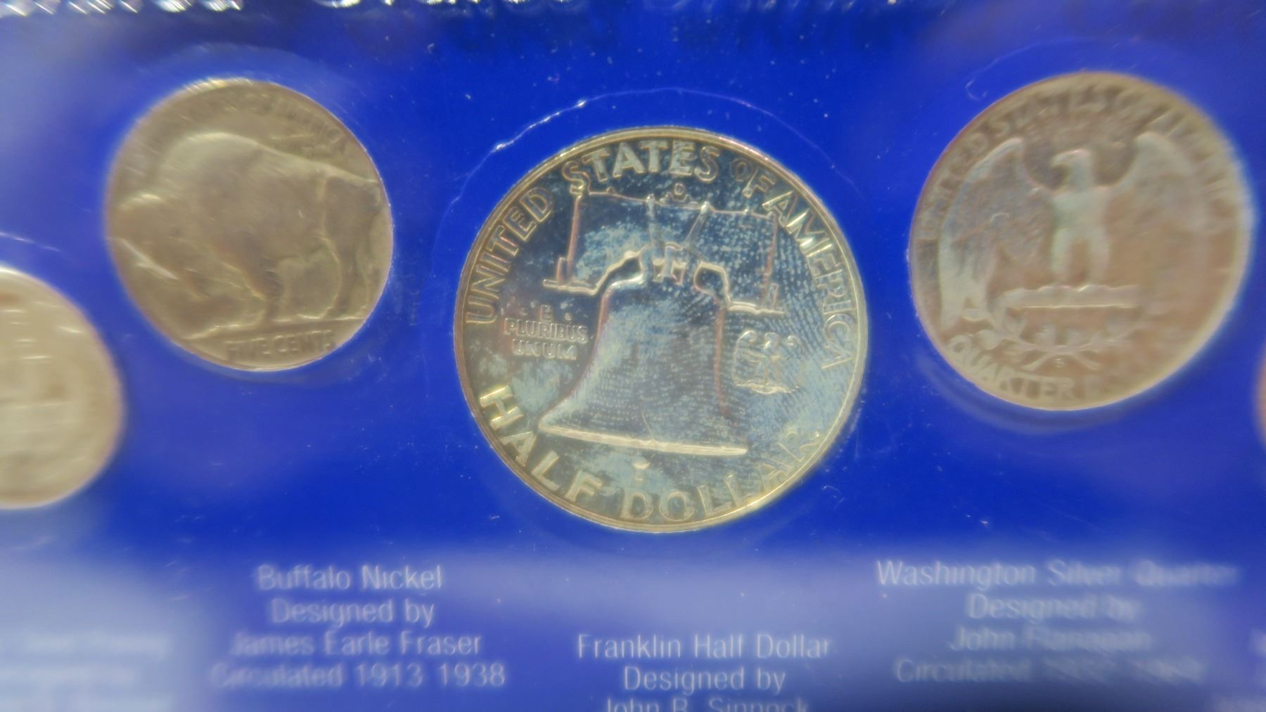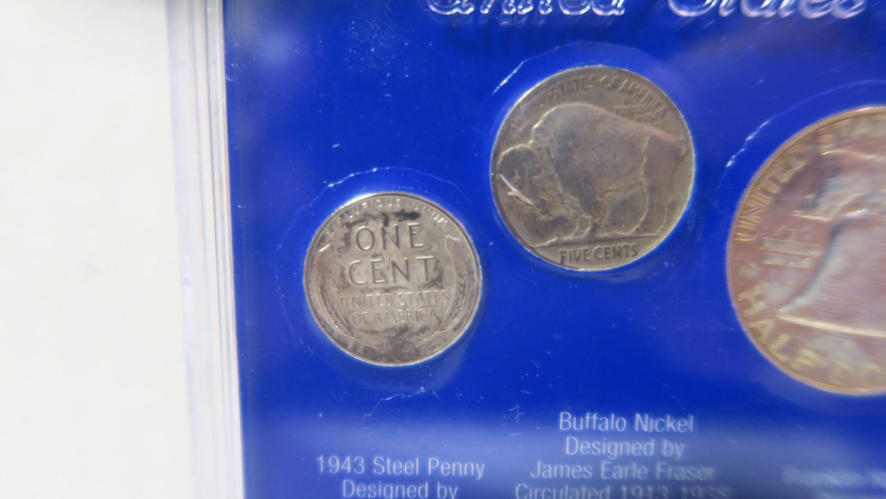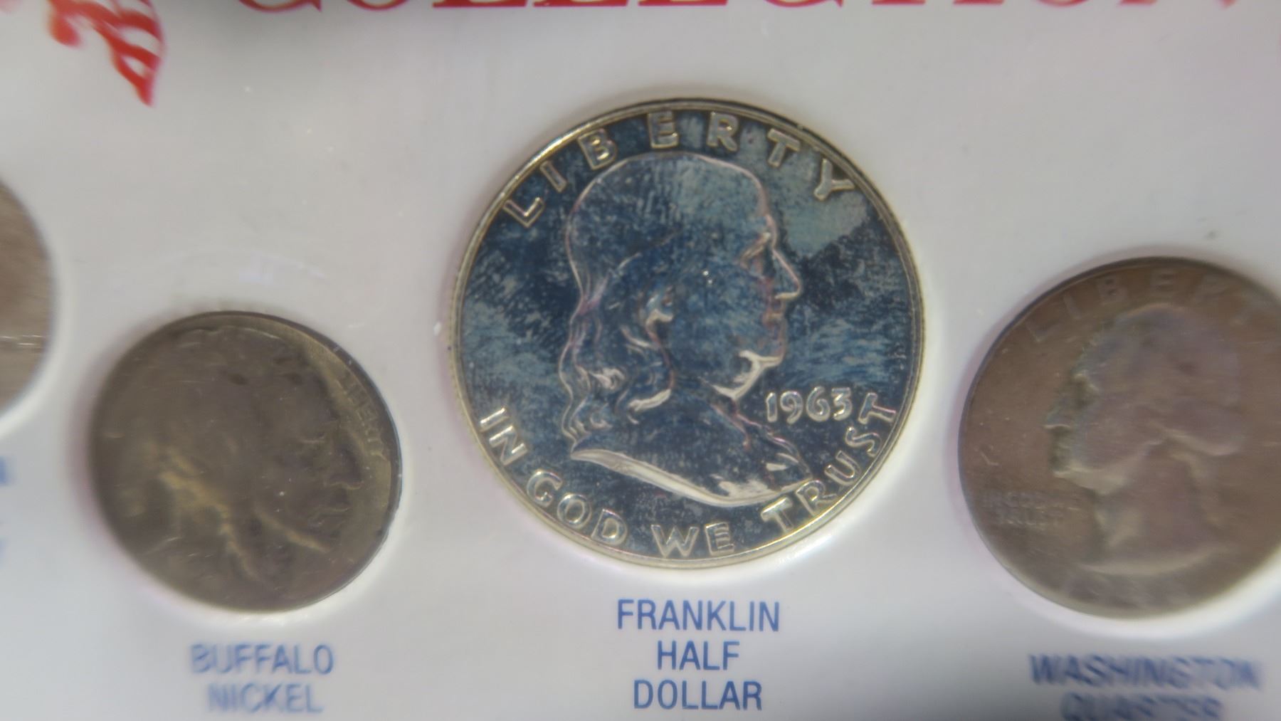 American Obsolete Collection. 5-coin set includes 1943 Lincoln Steel Cent, 1934 Buffalo Nickel, 1941 Silver Mercury Dime, 1946S Silver Washington Quarter & 1963 Silver Ben Franklin Half Dollar. Housed in a SSCA case.