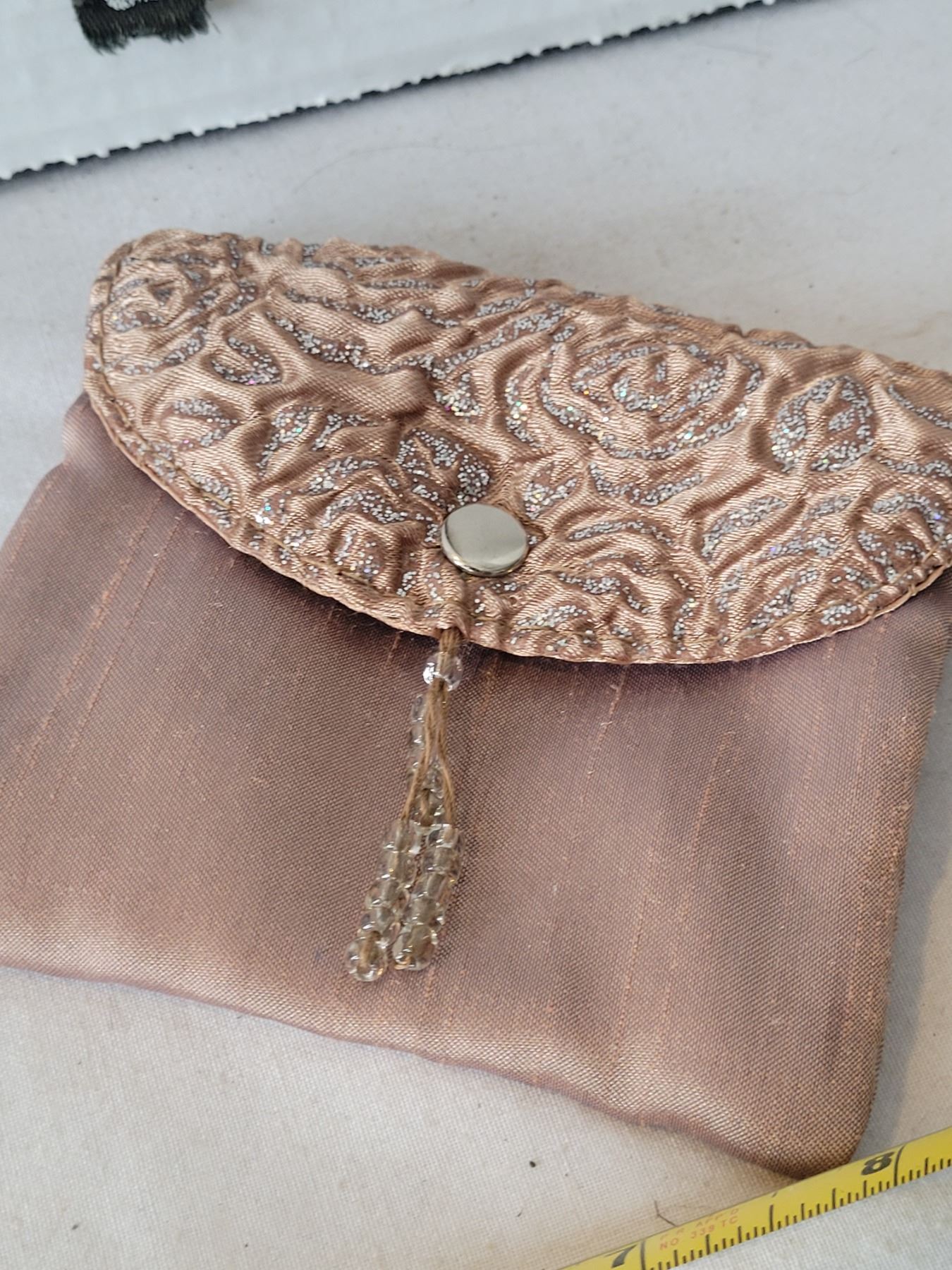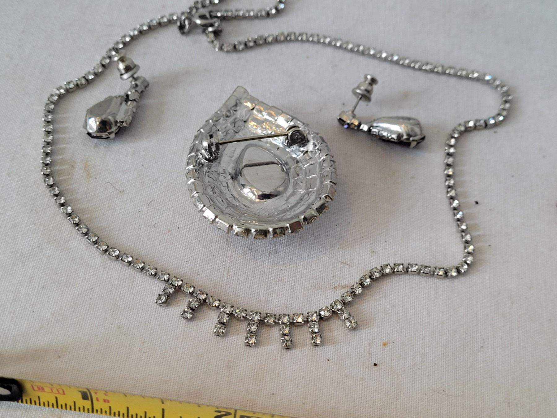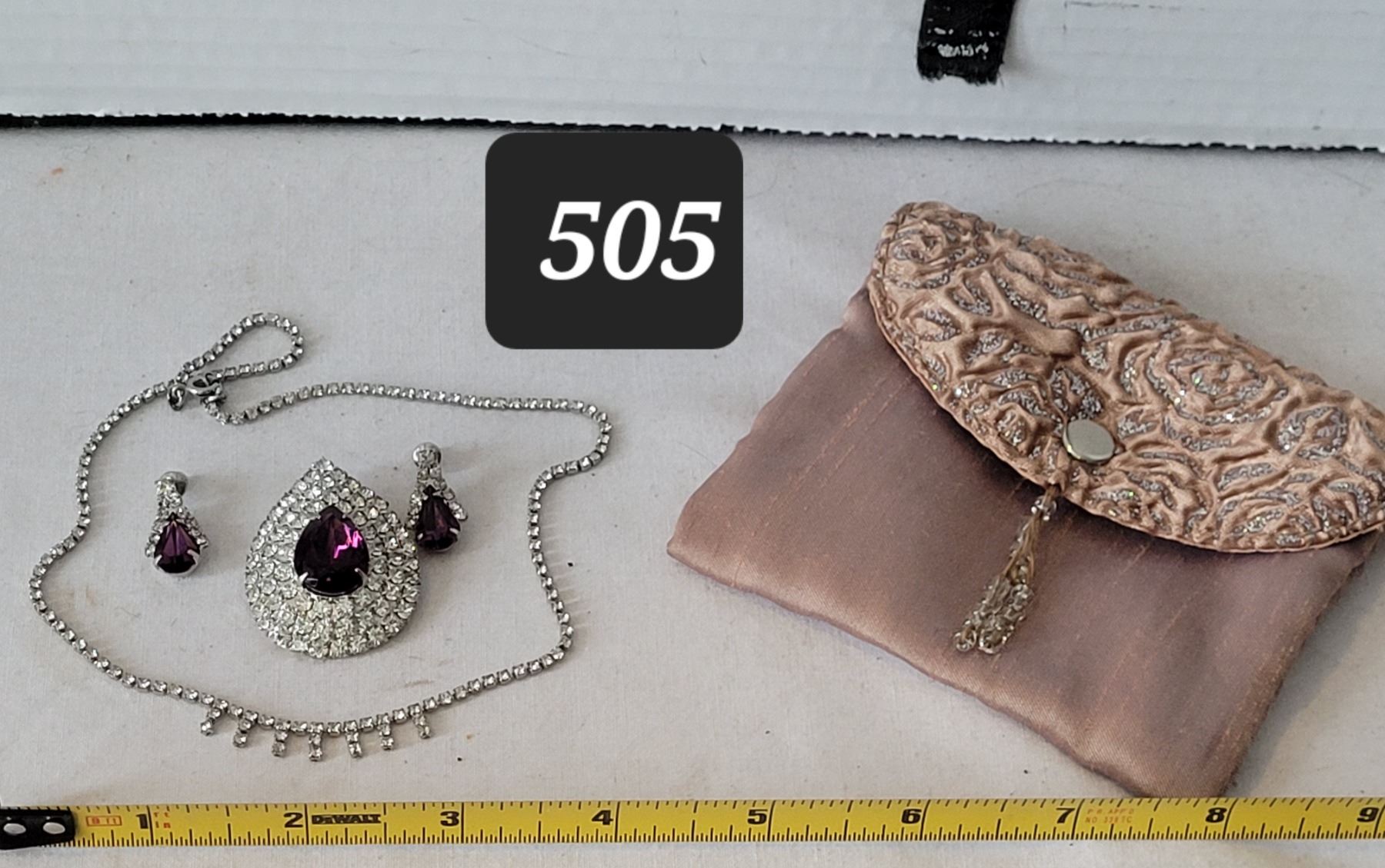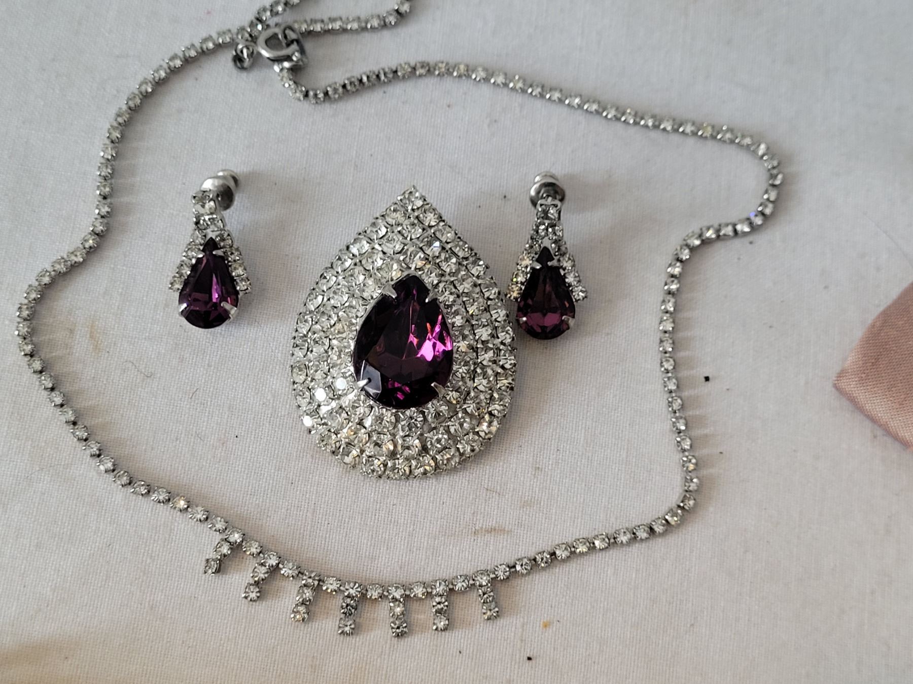 Amethyst rhinestone pin & matching earrings plus neck chain all in soft pouch.