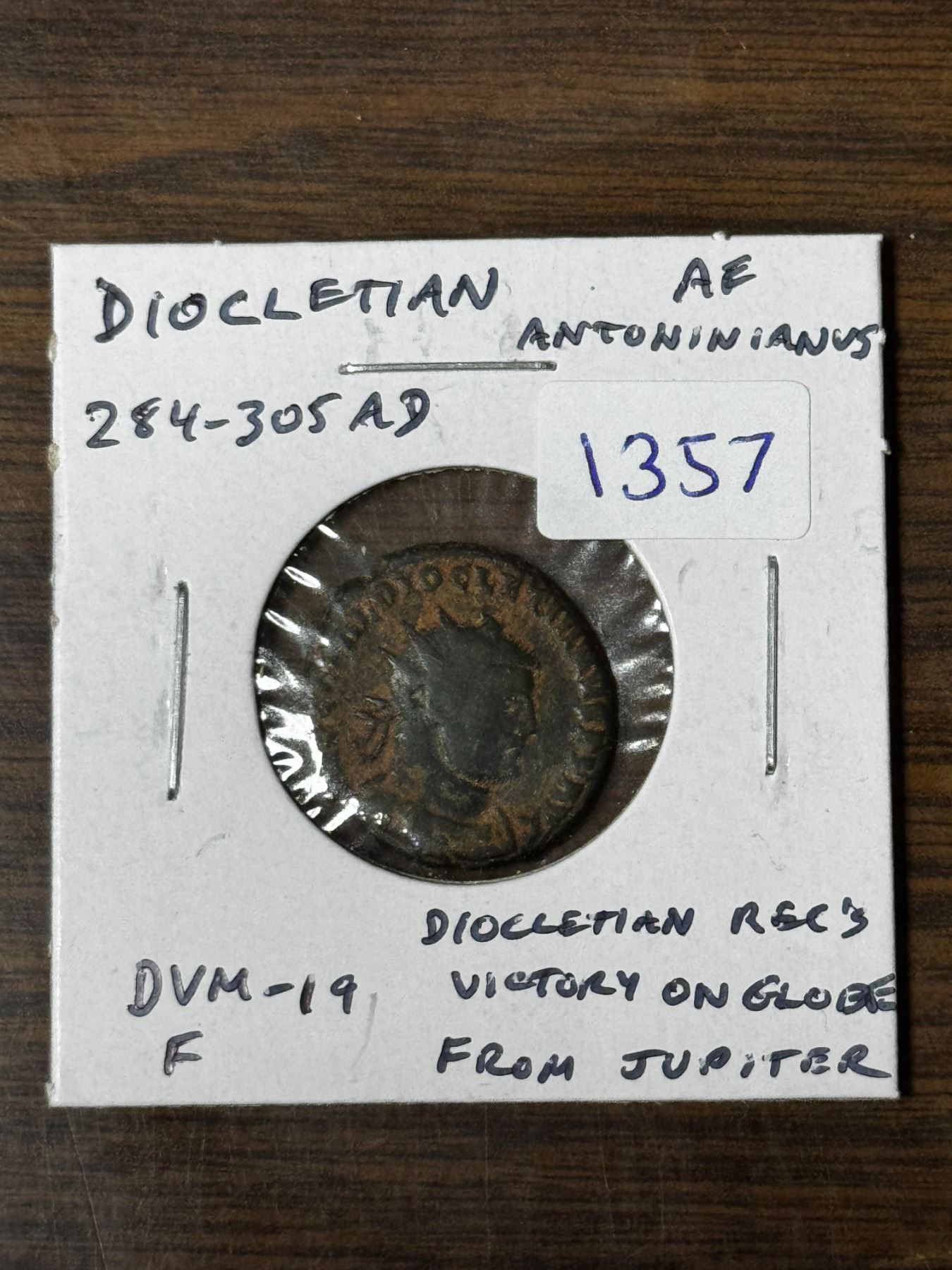Ancient Rome. Emperor Diocletian 284 - 305 AD AE Antoninianus. Rev: Diocletian receives Victory on Globe from Jupiter. DVM-19. Fine.
