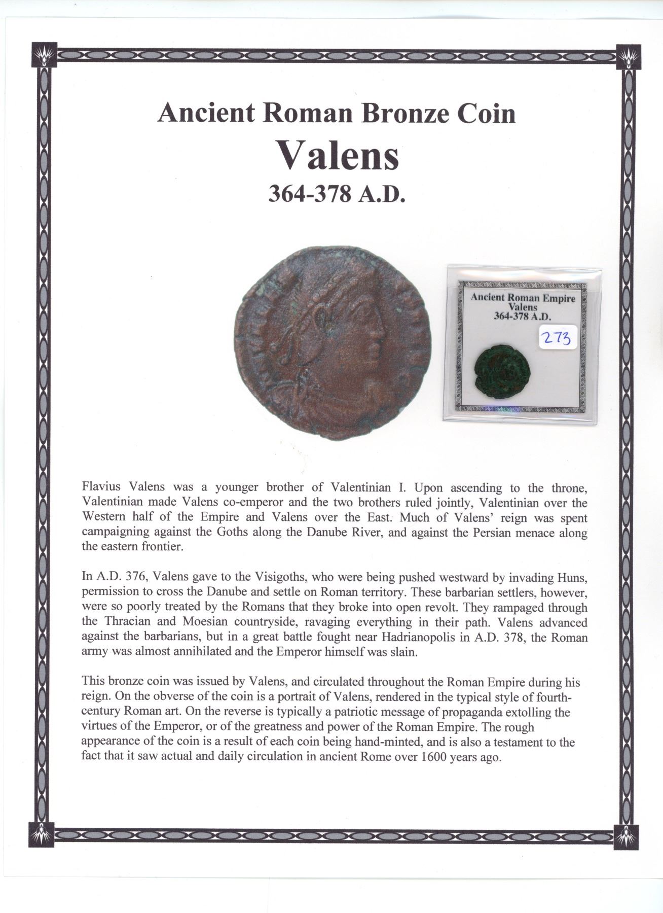 Ancient Rome. Emperor Valens, 364 – 378 AD. Much of Valens’ reign was spent campaigning against the Goths and the Persians. Bronze Coin comes with documentation.