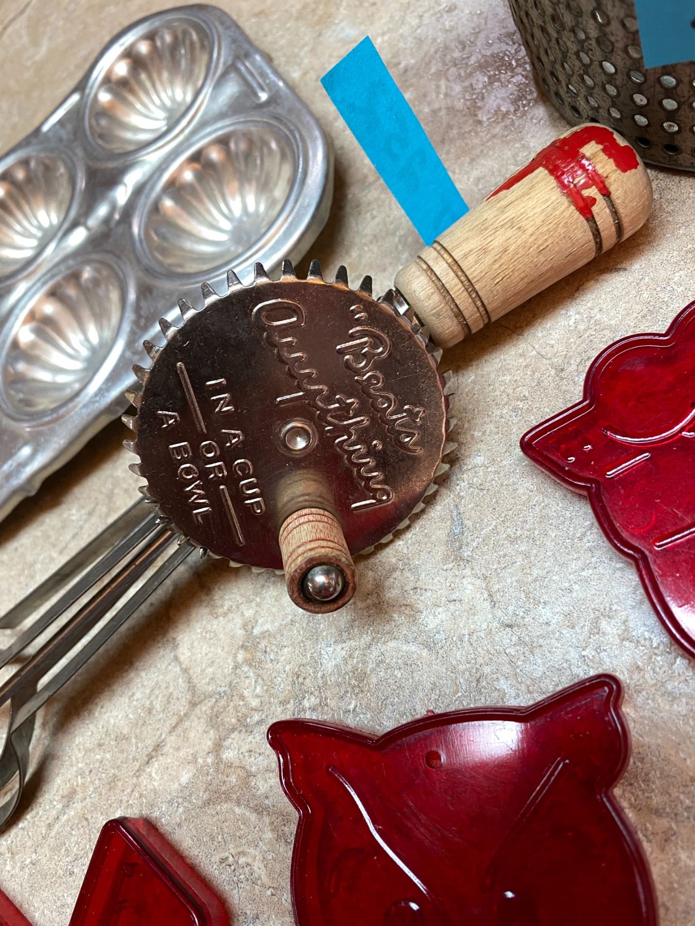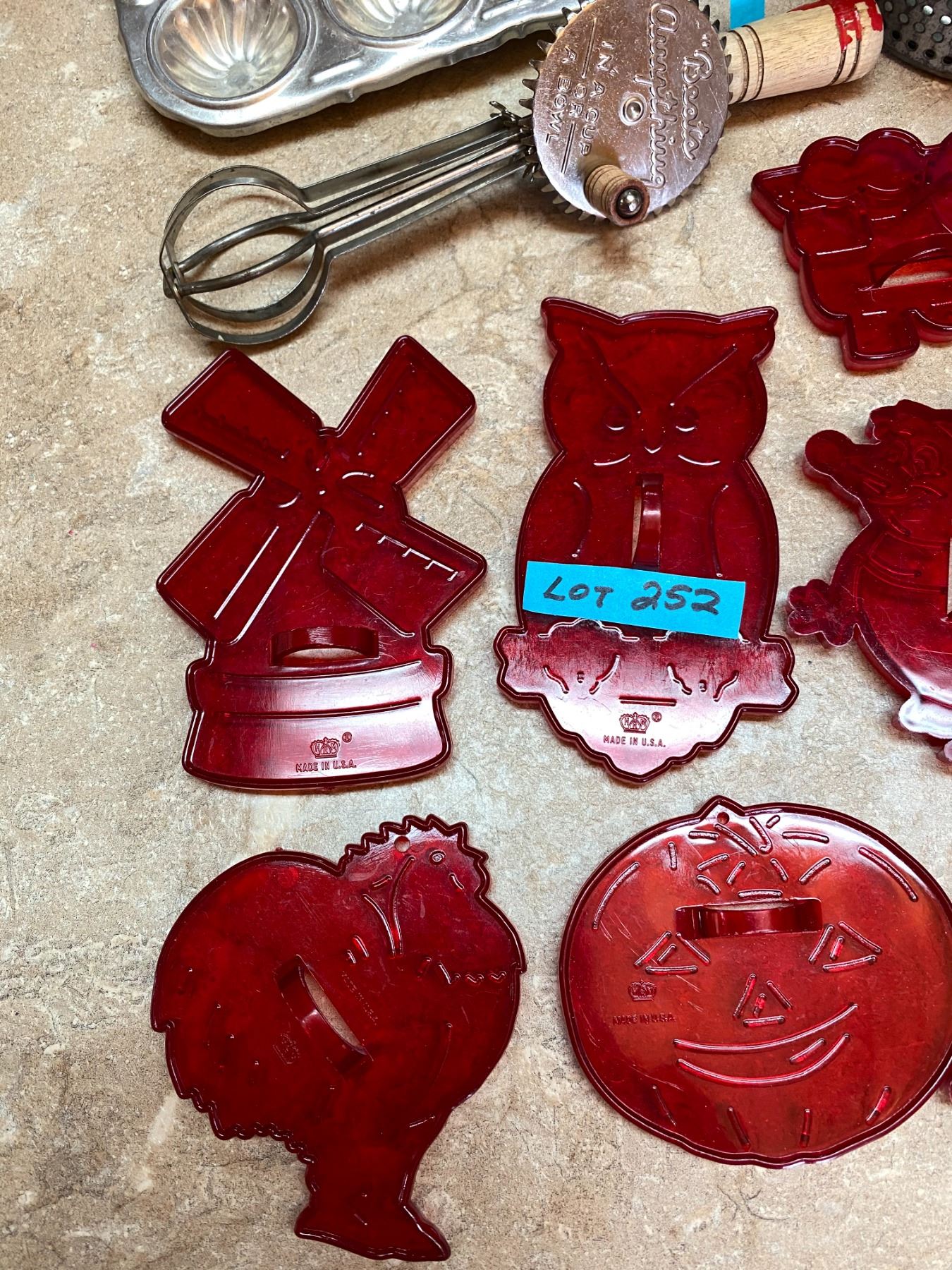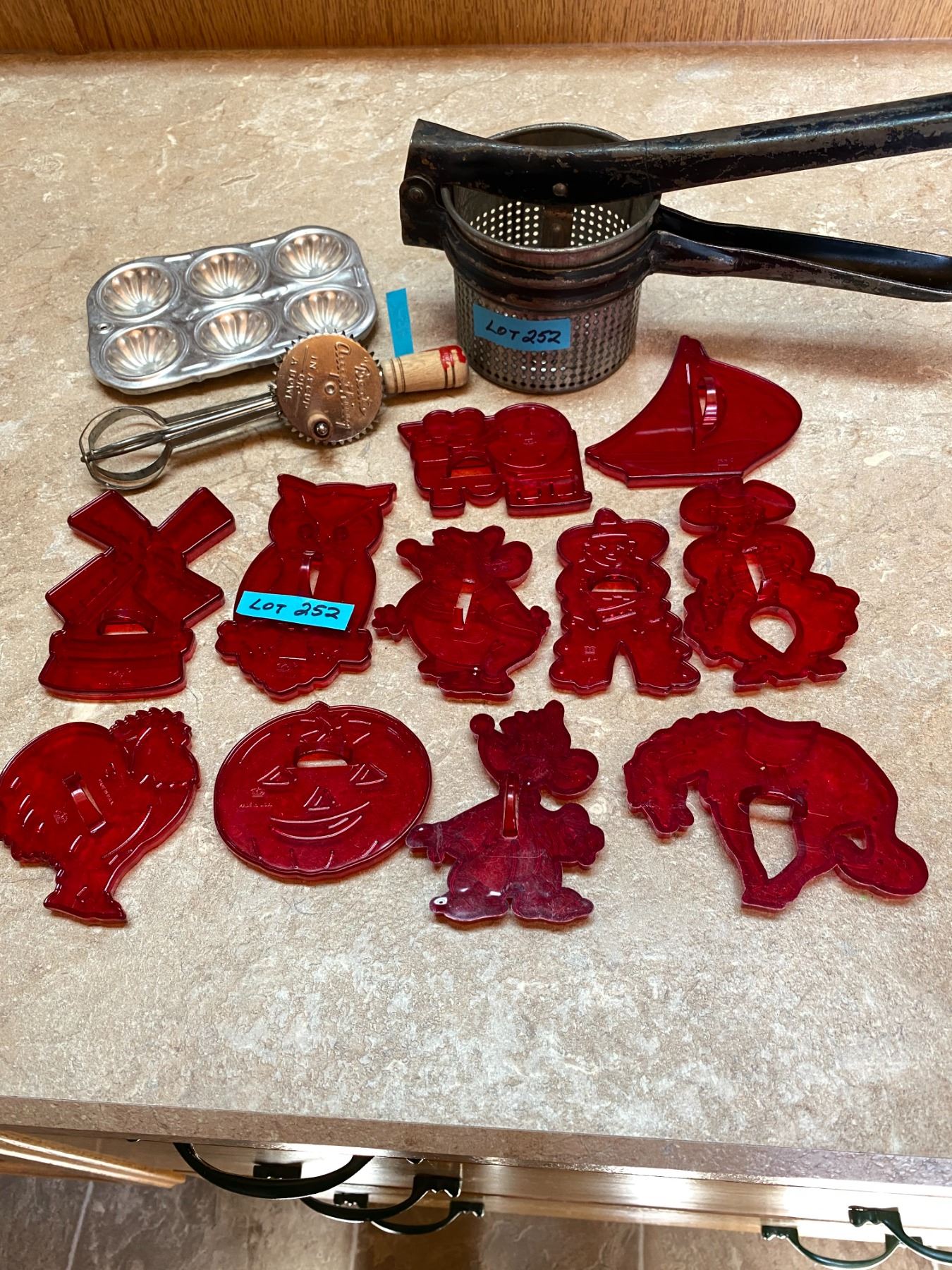 Antique Cookie Cutters 11 Pieces, Beats Anything Made in USA Egg Beater, Pastry Tin, Ricer