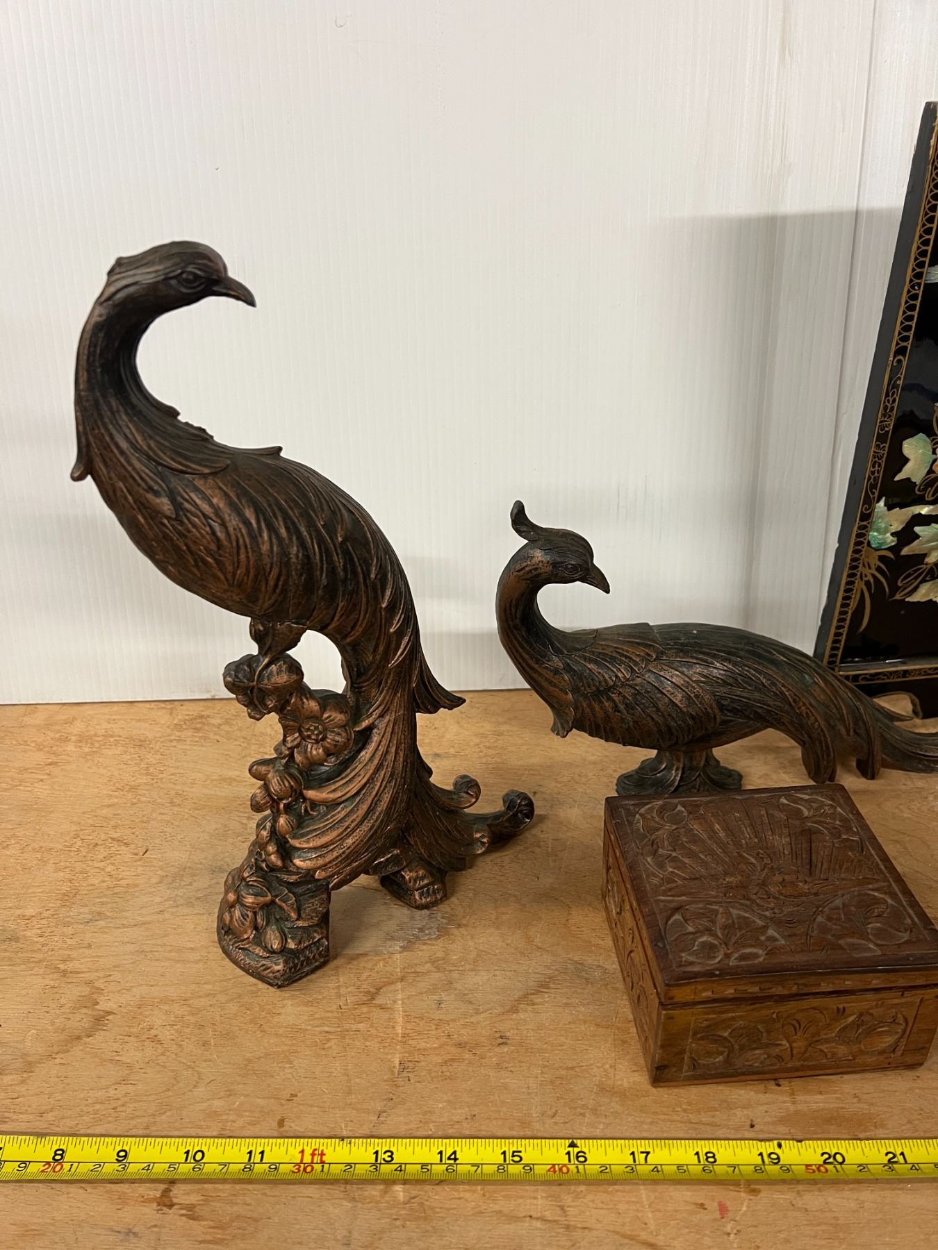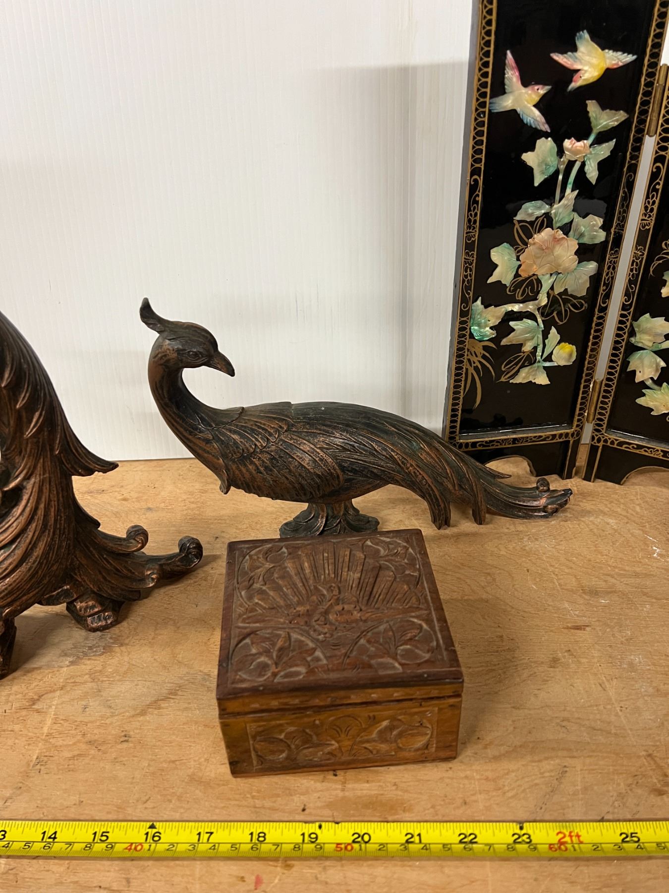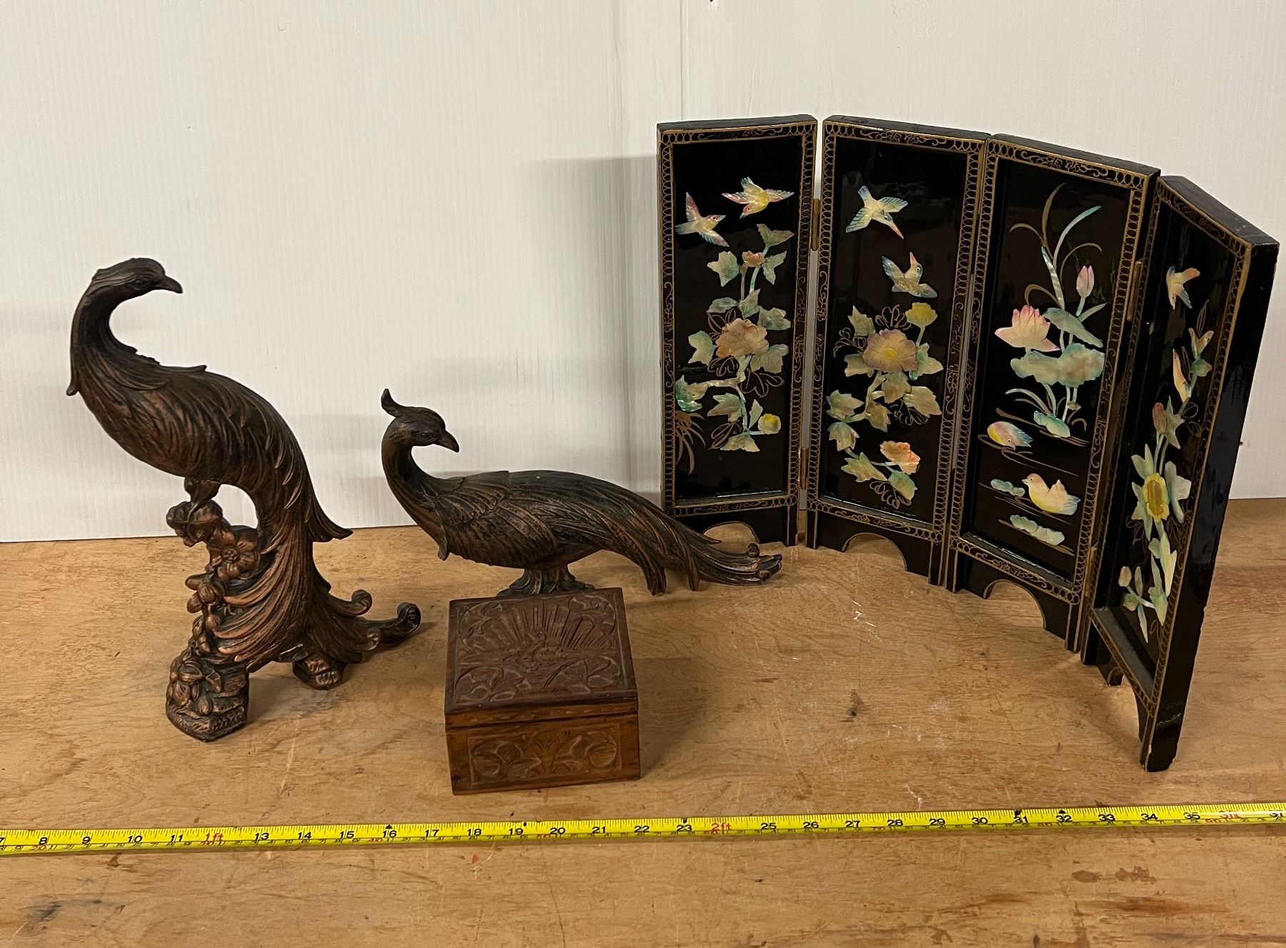 Antique Décor (wooden peacock, wooden box, four panel table screen)