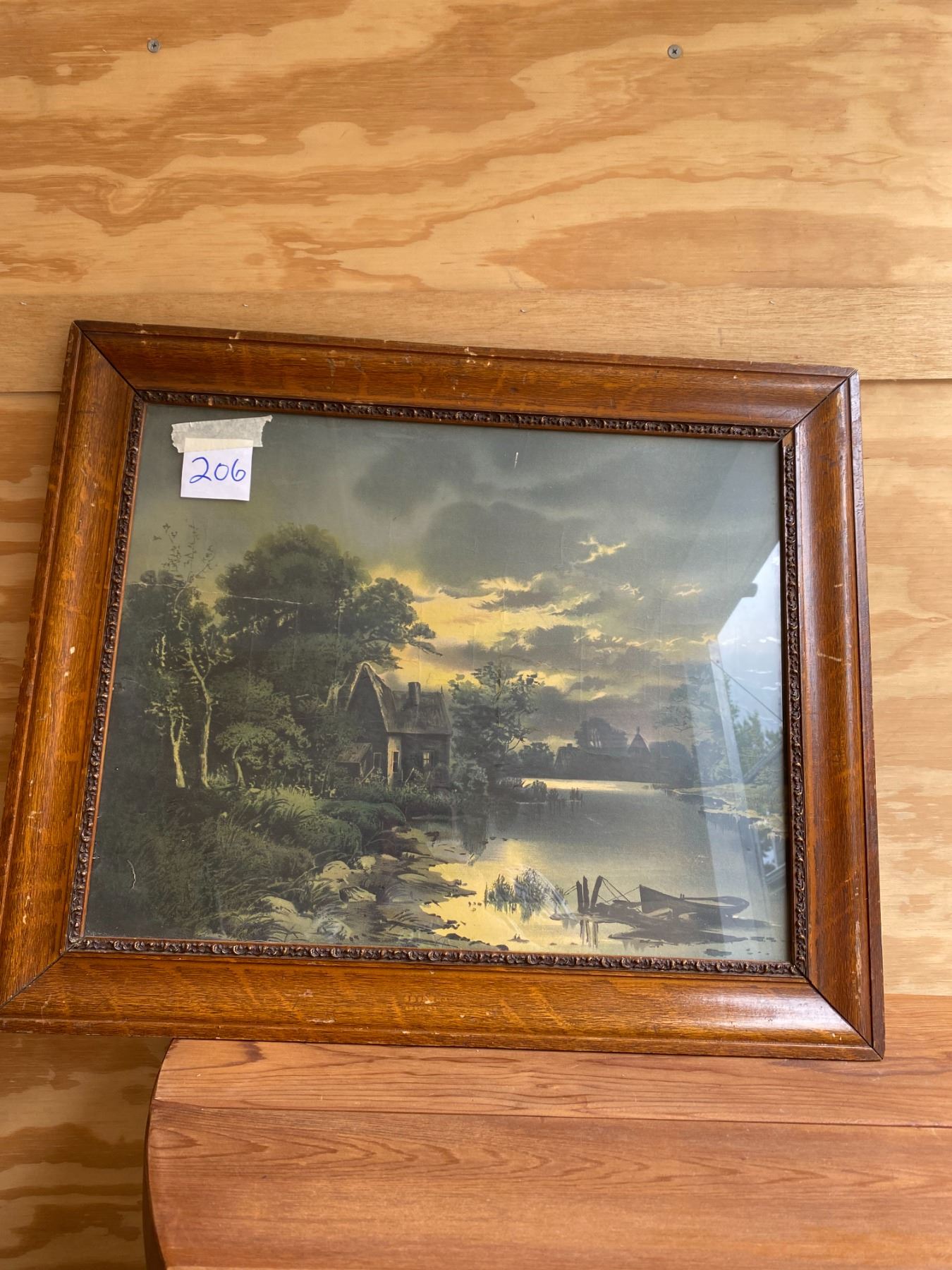Antique House on lake framed artwork beautiful oak frame - slight damage 24 1/2"w x 20 1/2"h