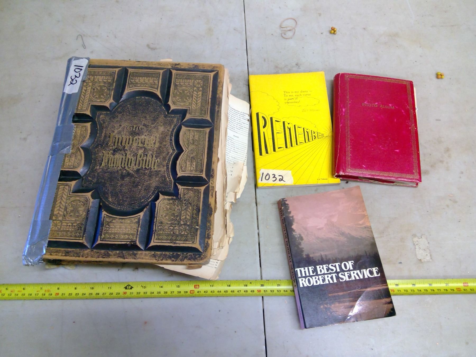Antique Imperial Family Bible and 3 Books (Remember, The Best of Robert Service, and Photo Album)