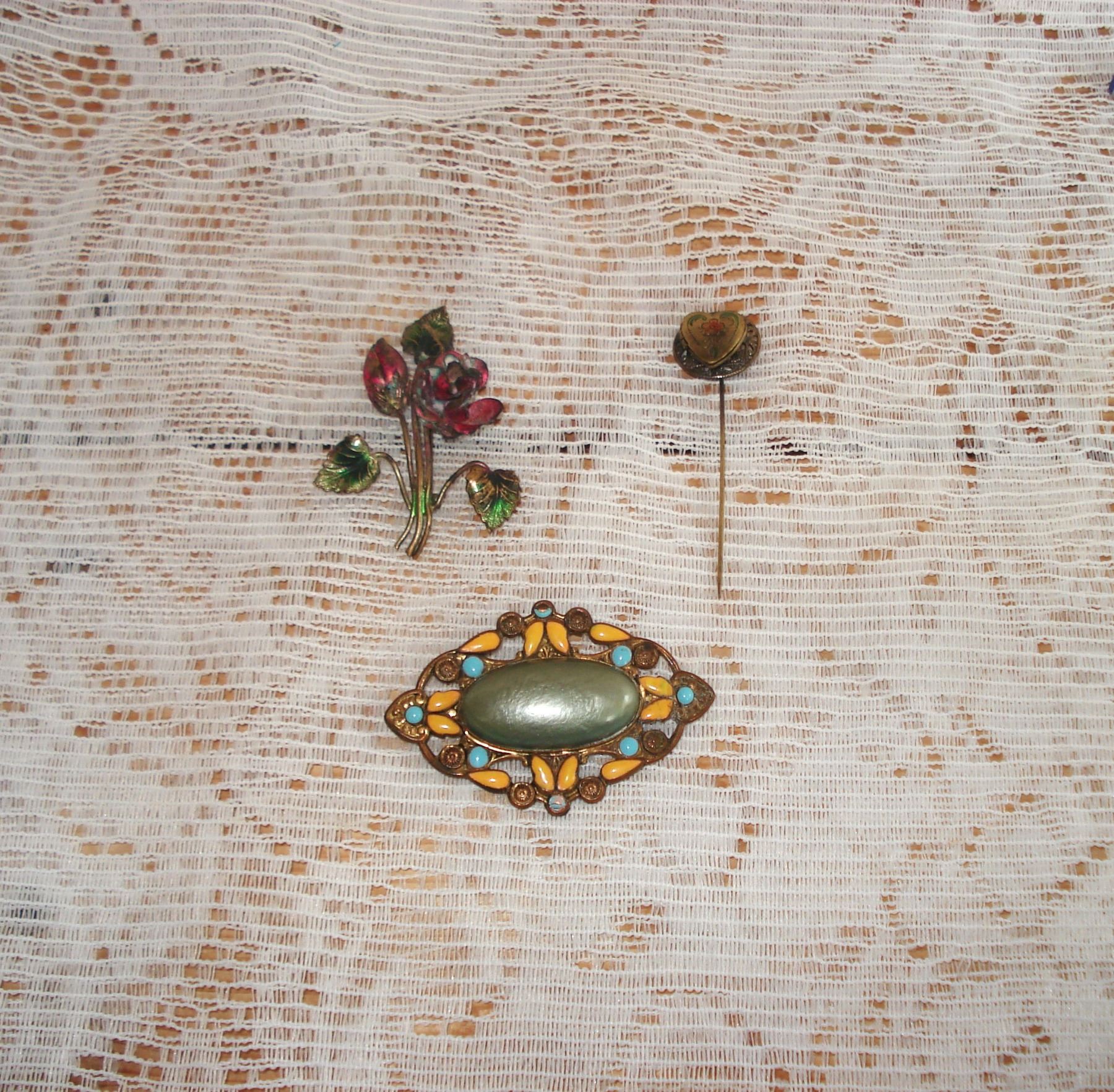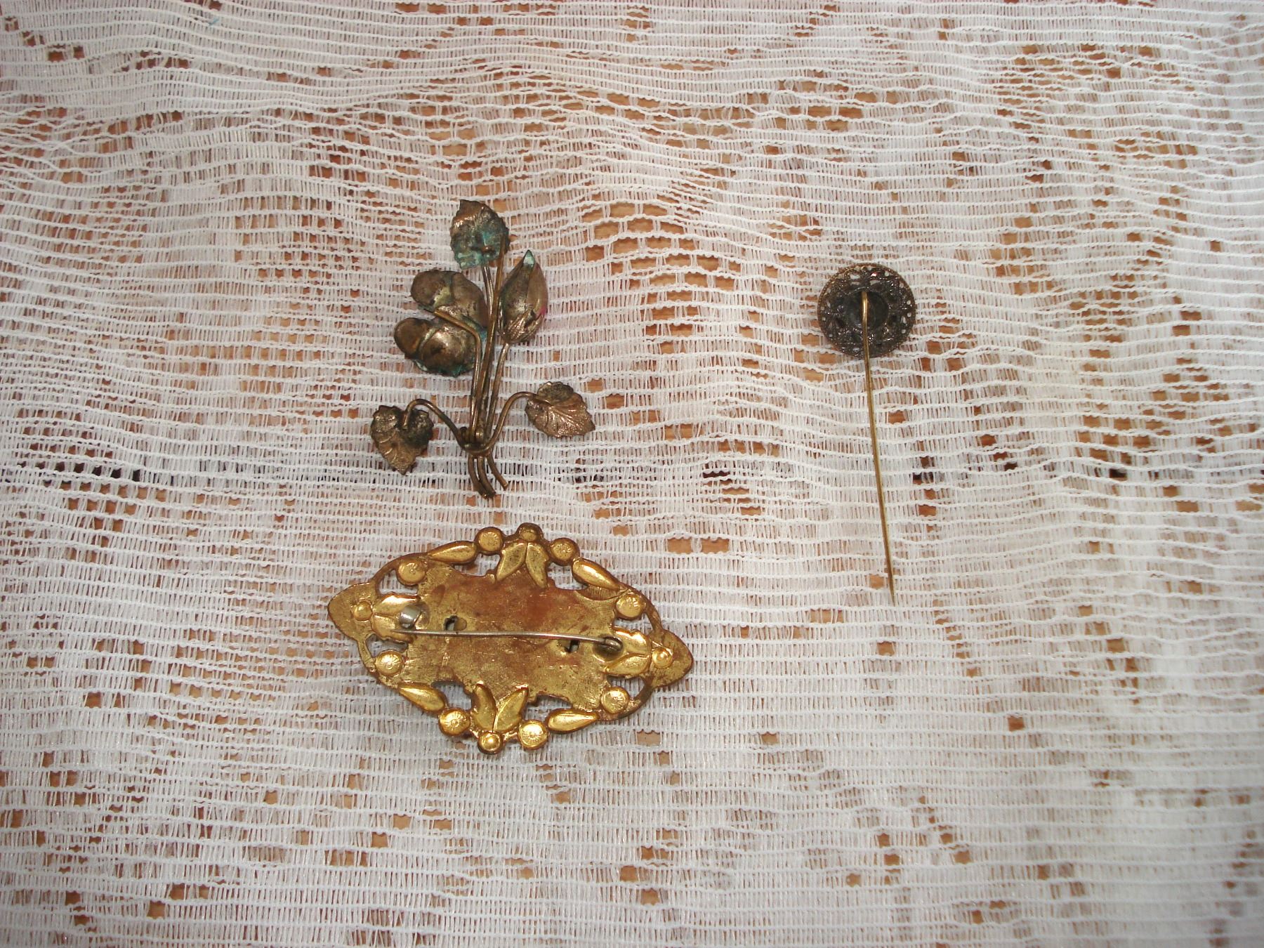 Antique Jewelry stickpin locket and pr old C-Clasp brooches
