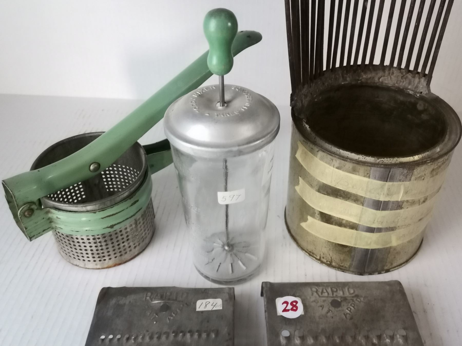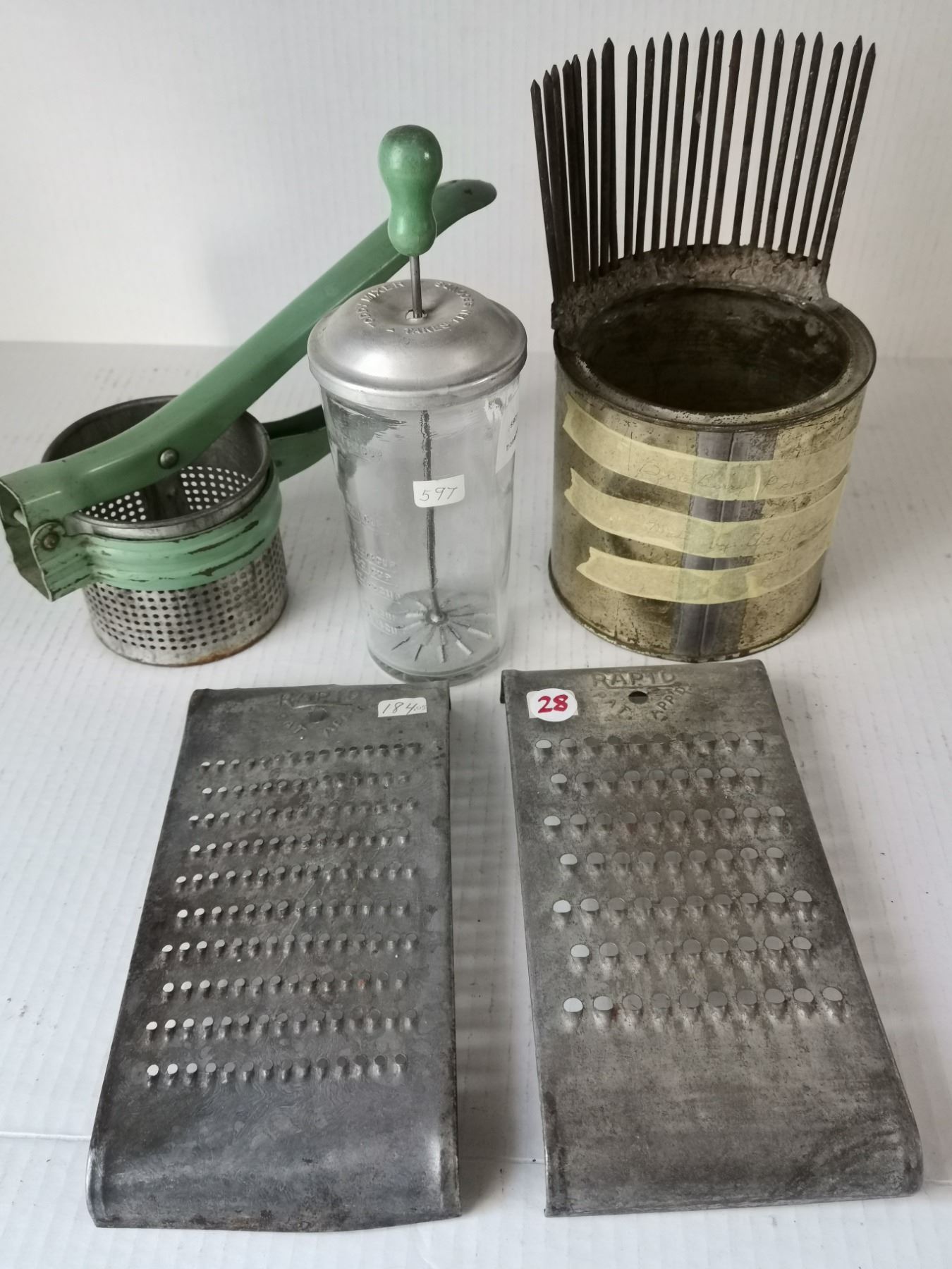 Antique Potato Masher, blueberry picker, Toddy mixer, & Tool hand held Grinder