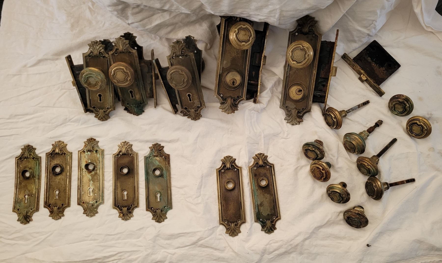 Antique "Racine" Pattern (1905-1908) 2.25" diameter solid brass doorknobs and door sets (French Art Noveau style)