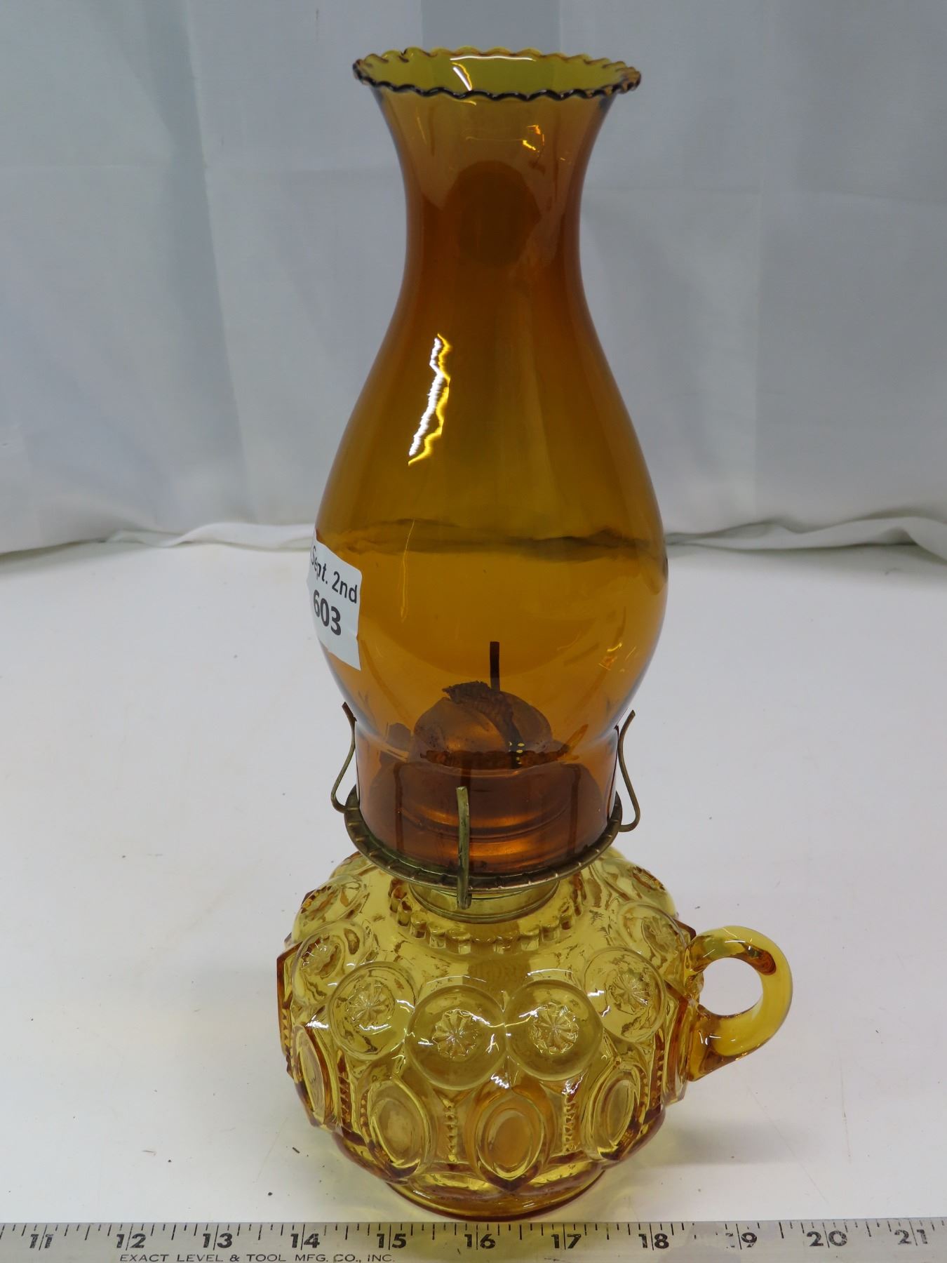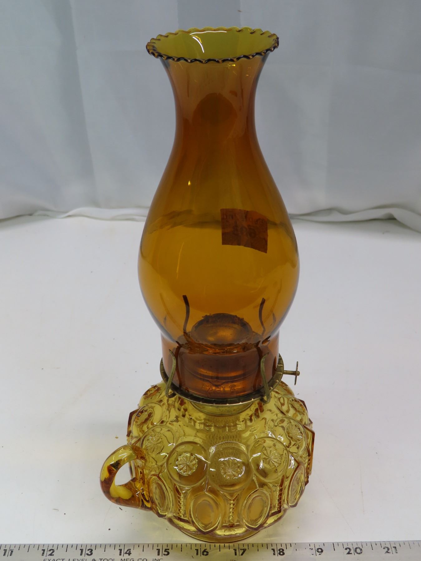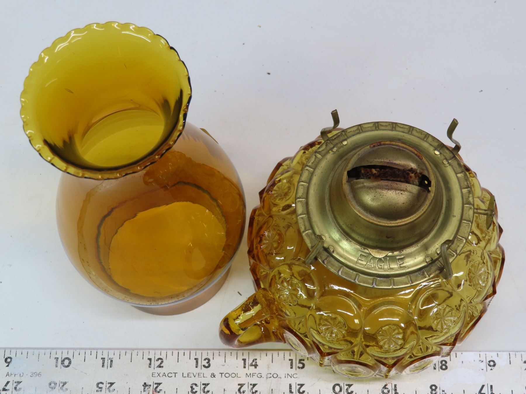 Antique Yellow Glass handheld oil lamp - Floral Pattern + Antique pump