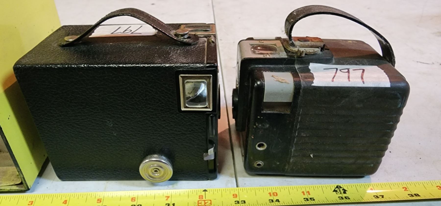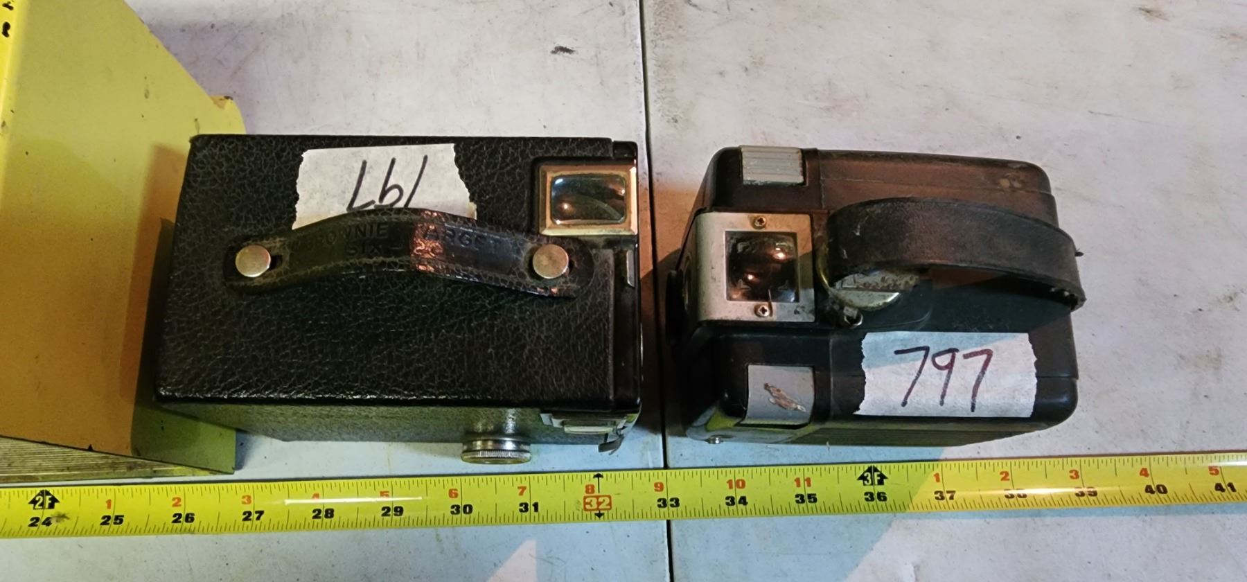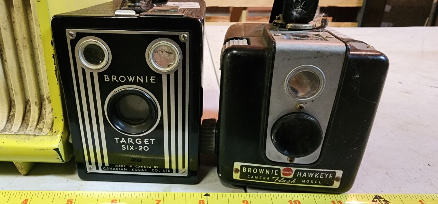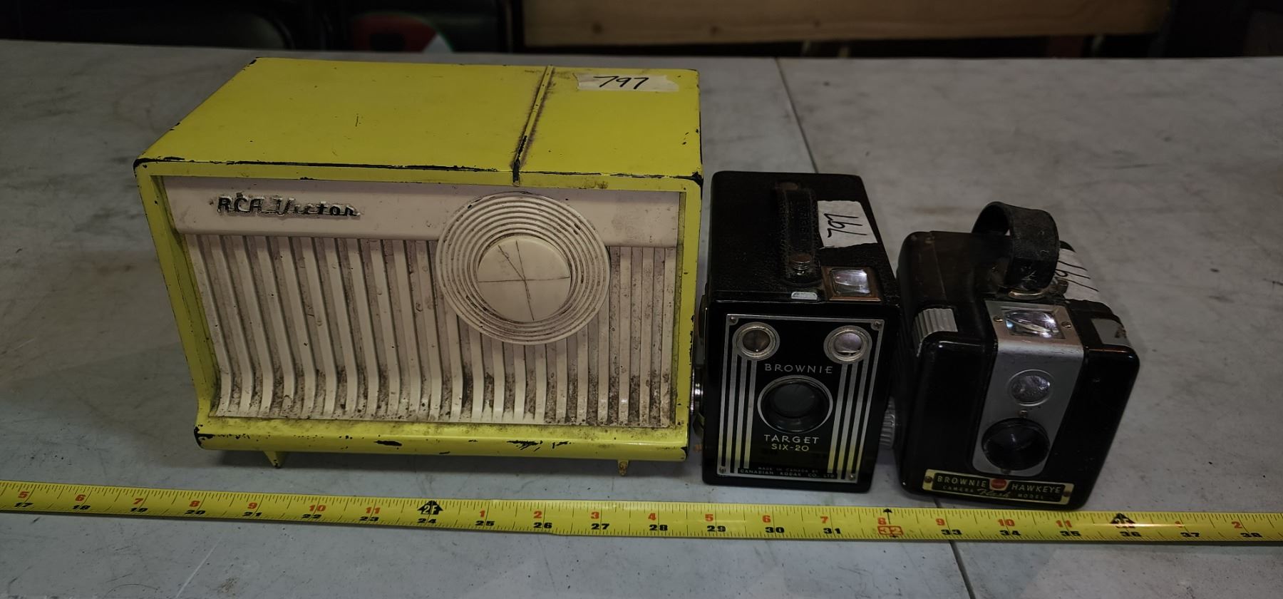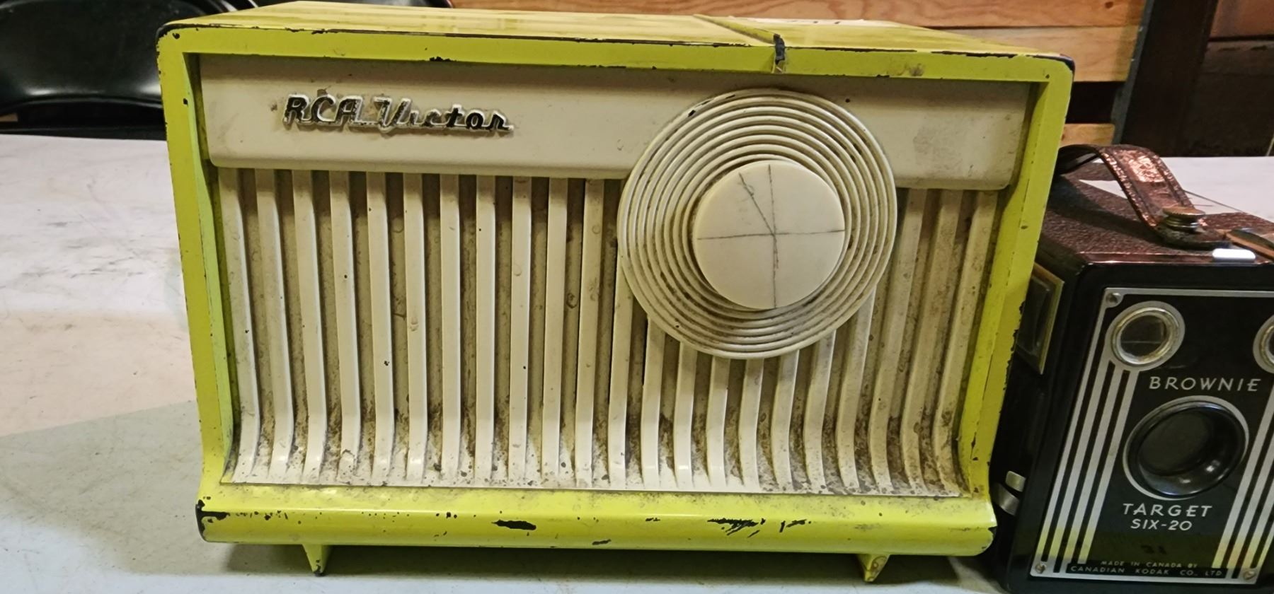 Antique, Yellow "RCA" Victor radio & 2 Antique "Brownie" cameras