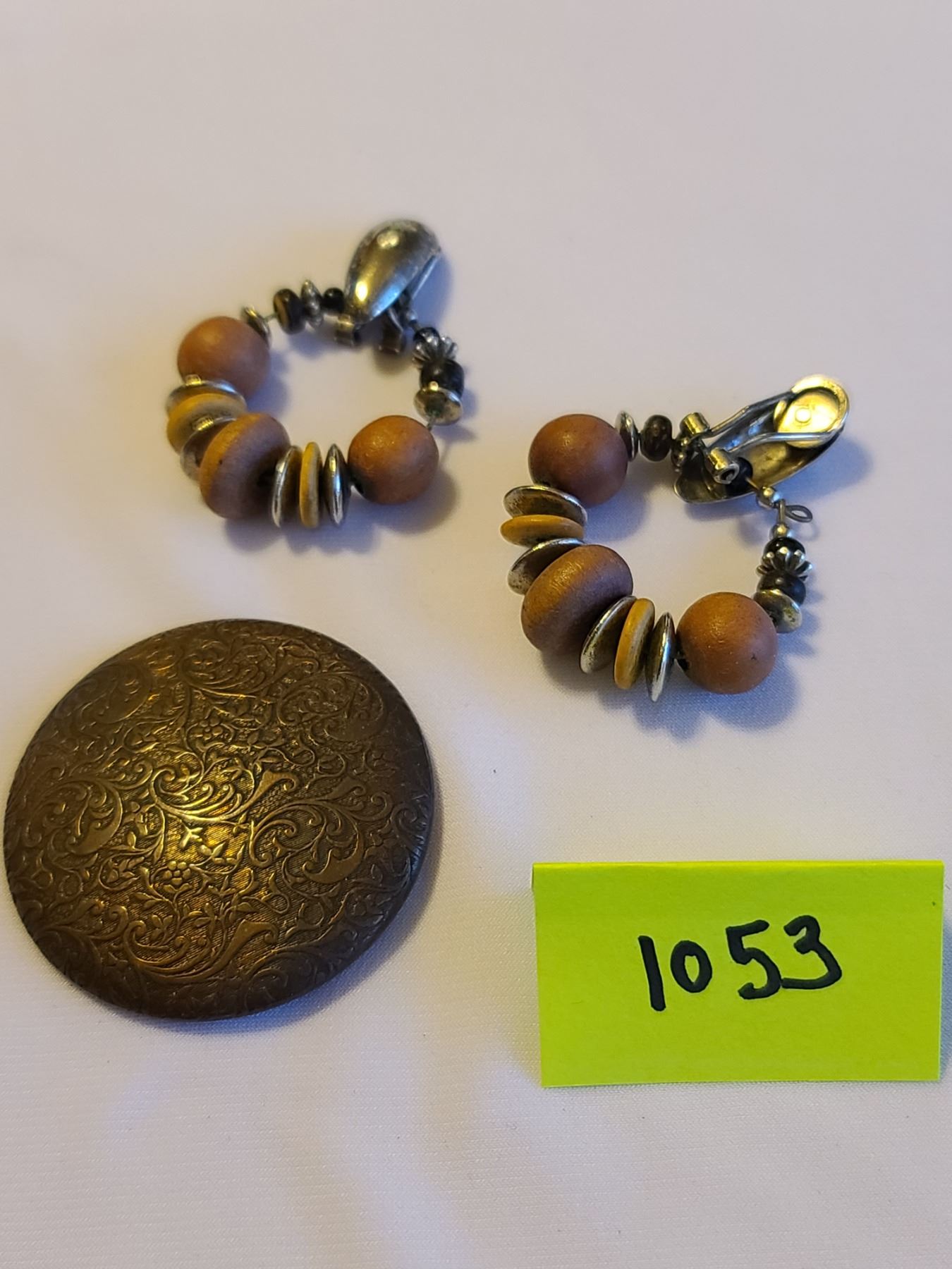 Antique bronze scroll and floral brooch, Wooden beaded hoop clip on earrings