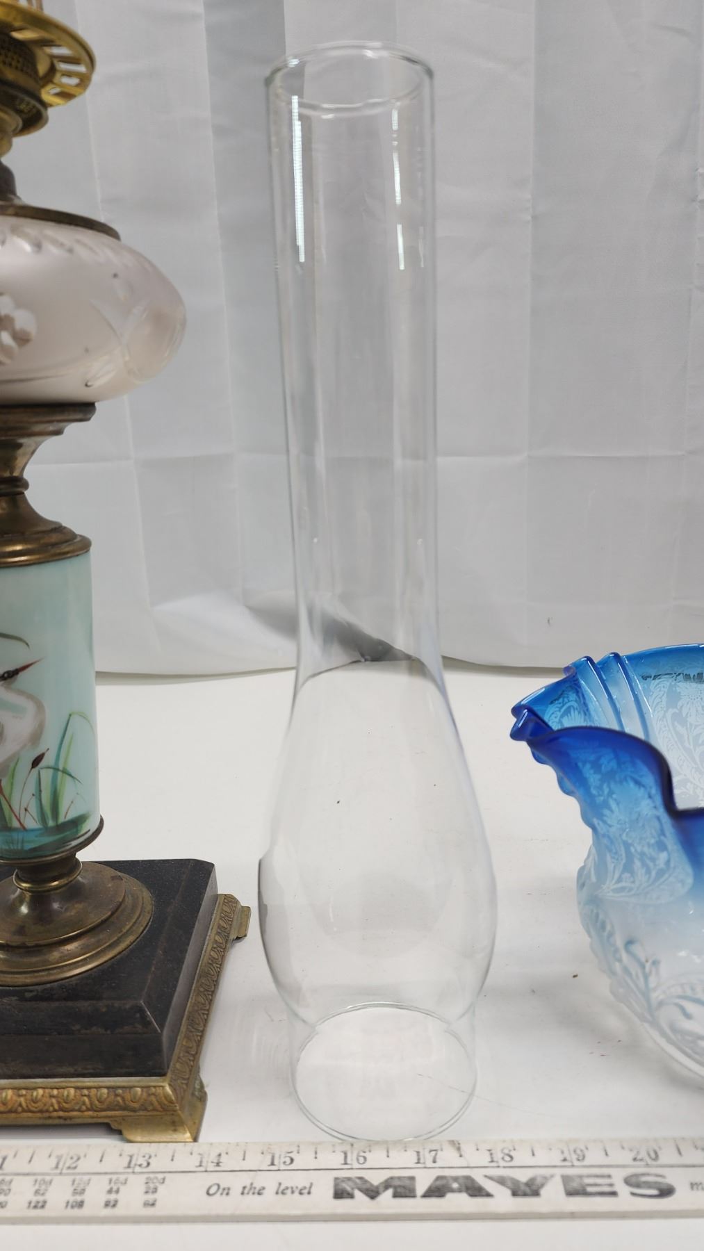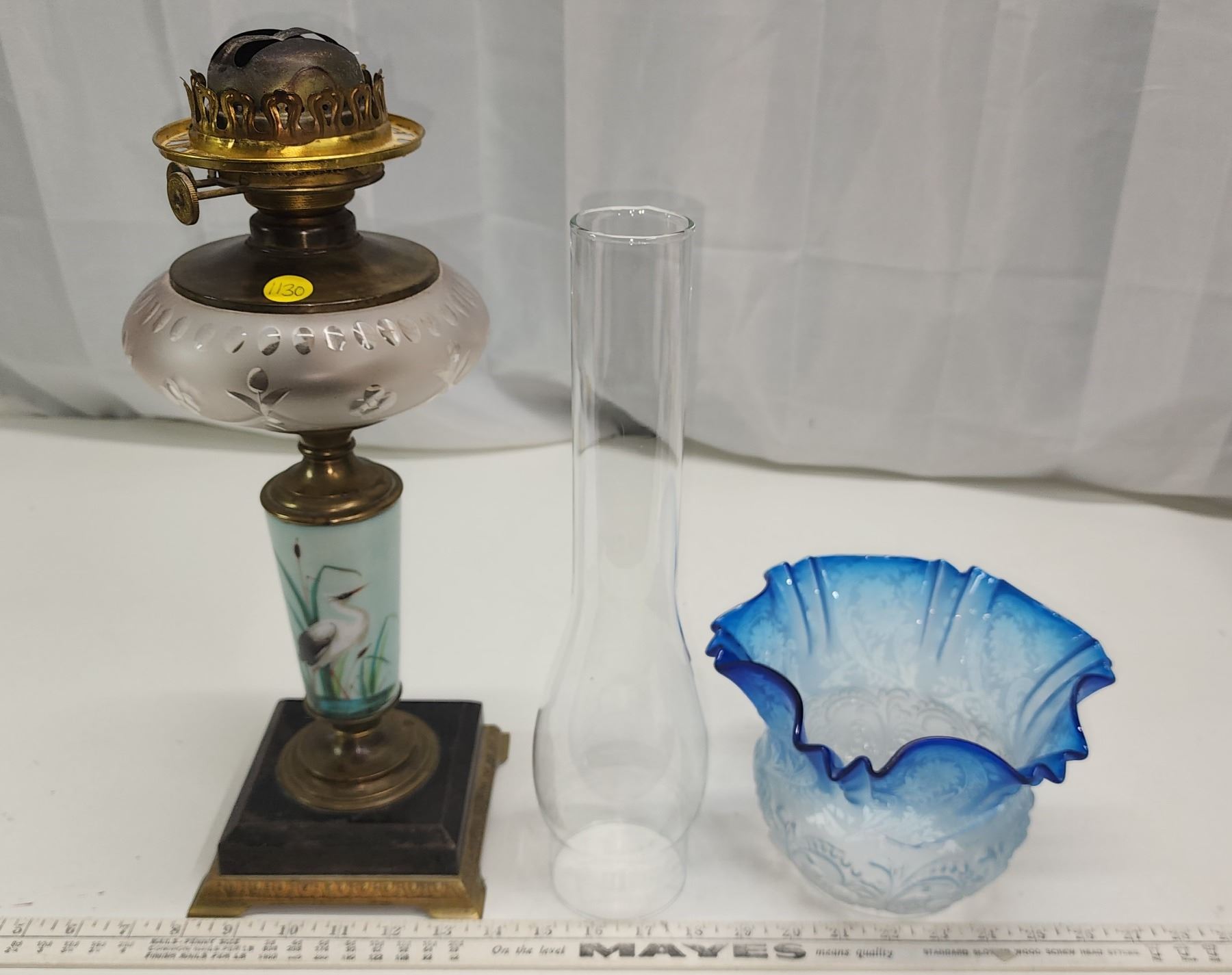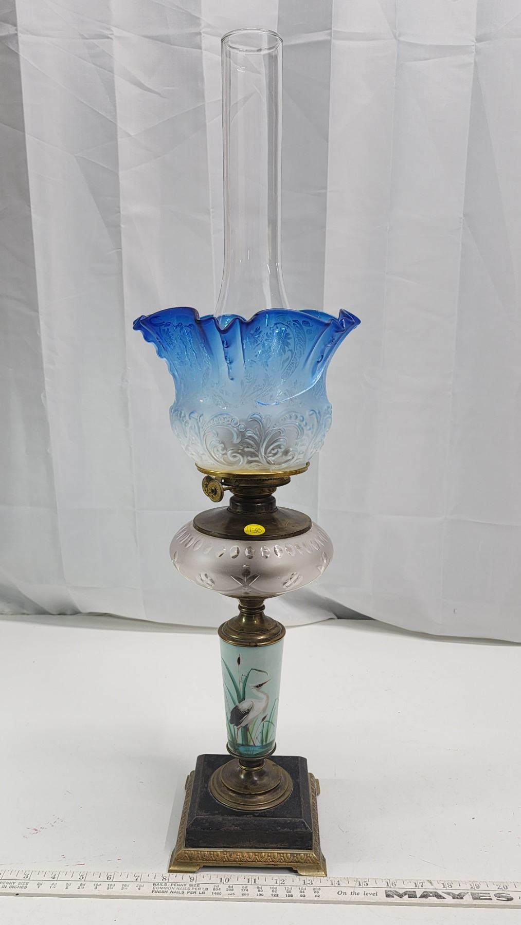 Antique coal oil lamp 30.5” (78 cm) tall with chimney. 2 cracks in blue shade. Used for display only.
