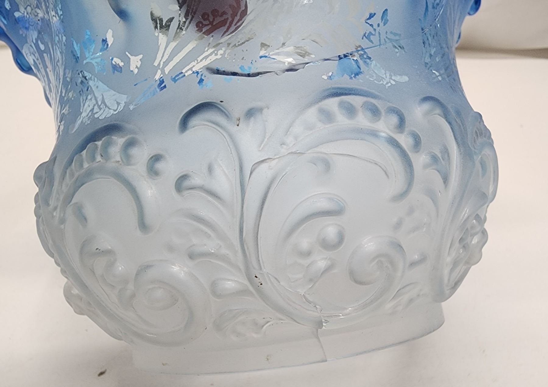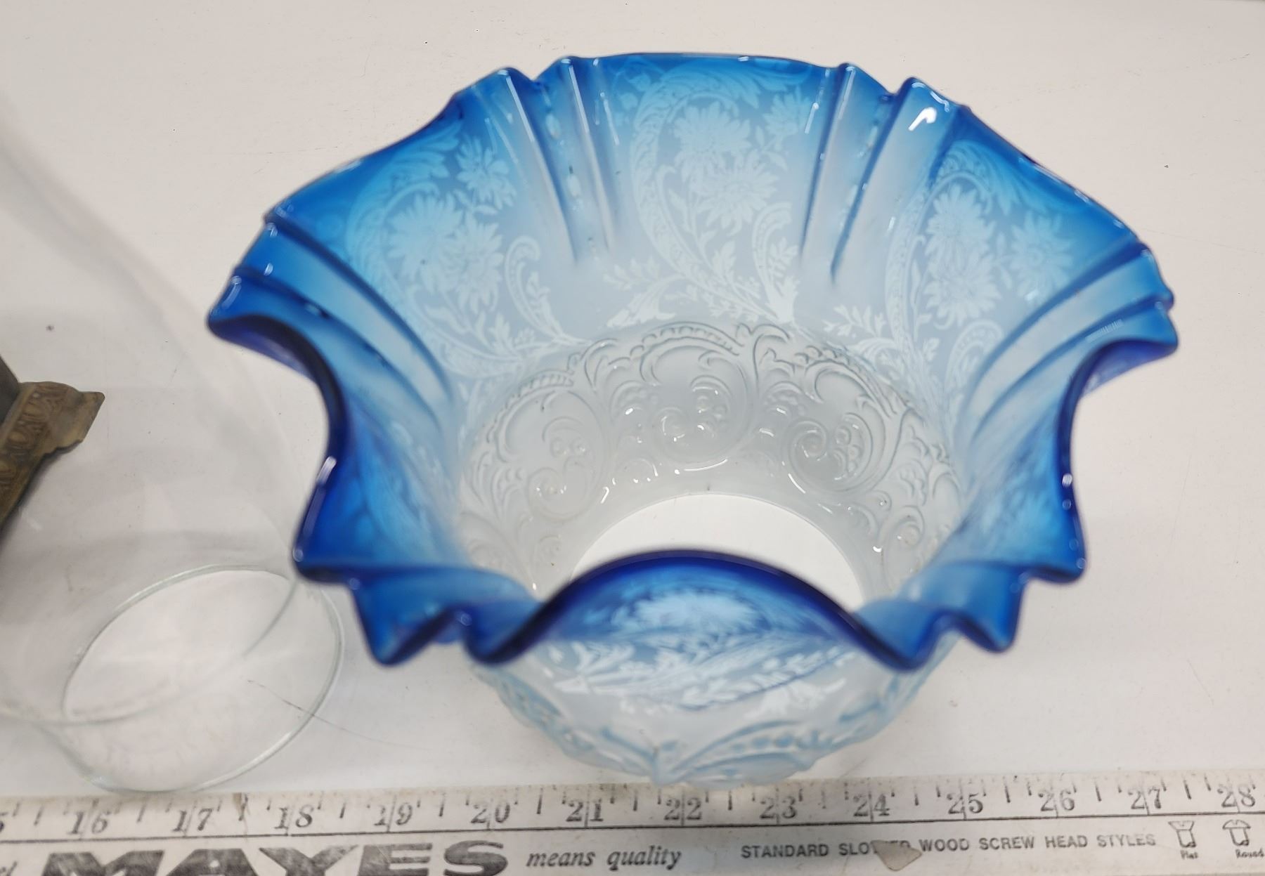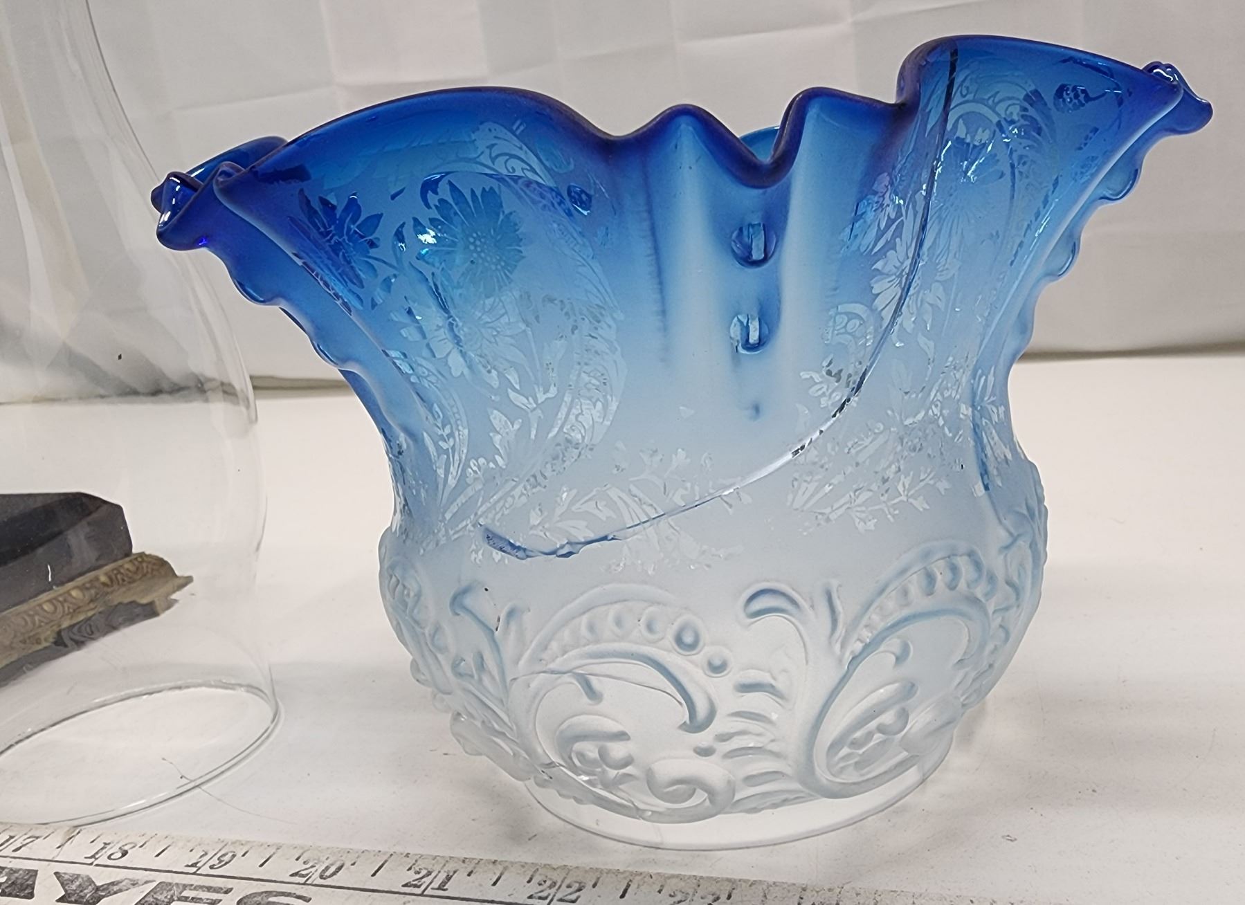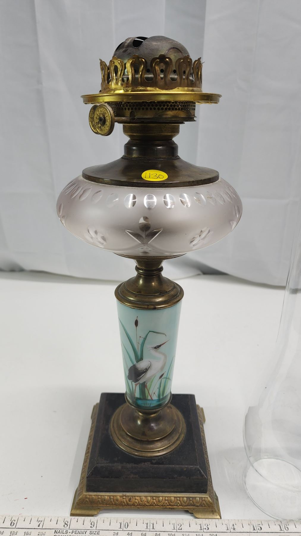 Antique coal oil lamp 30.5” (78 cm) tall with chimney. 2 cracks in blue shade. Used for display only.