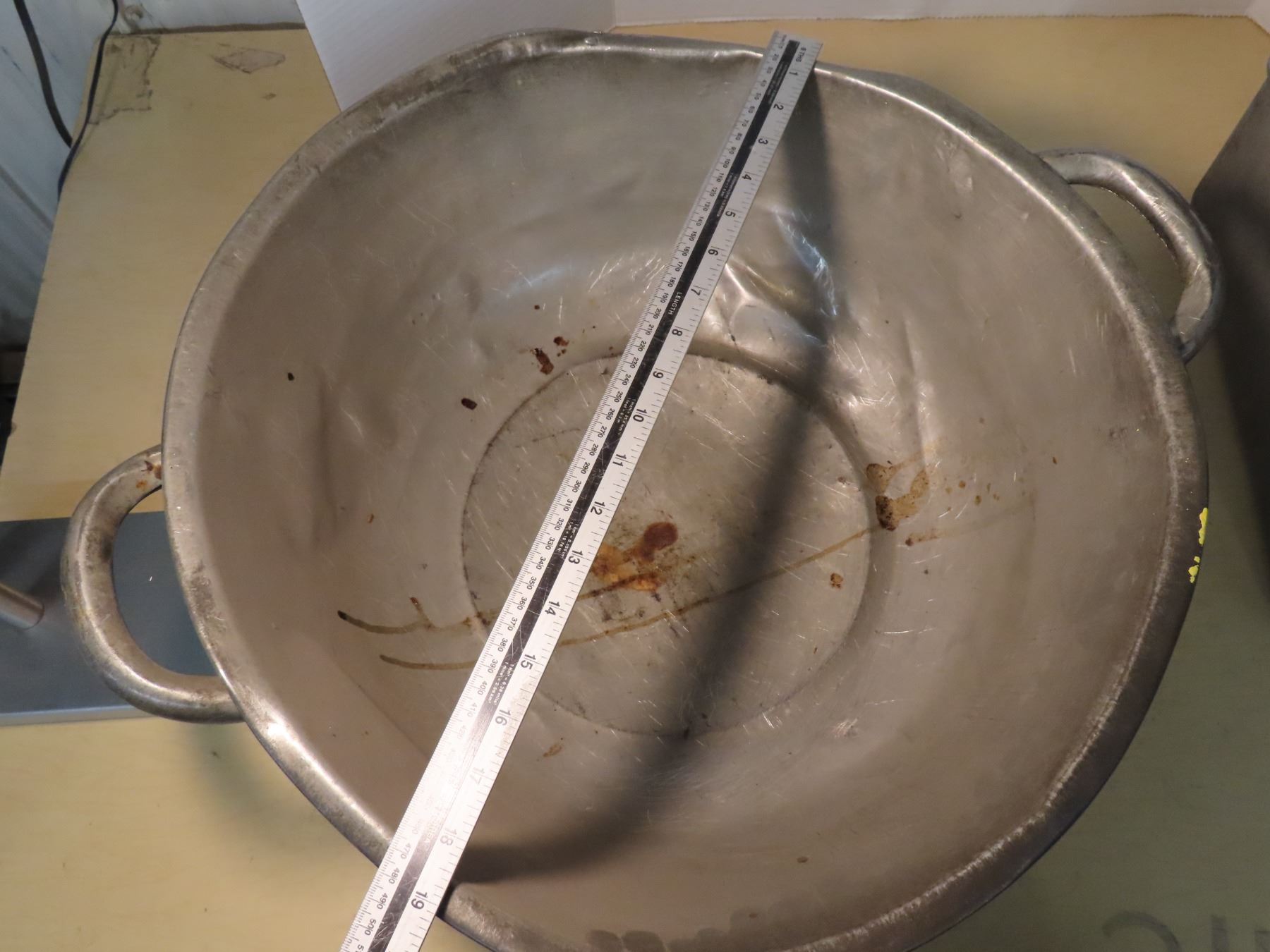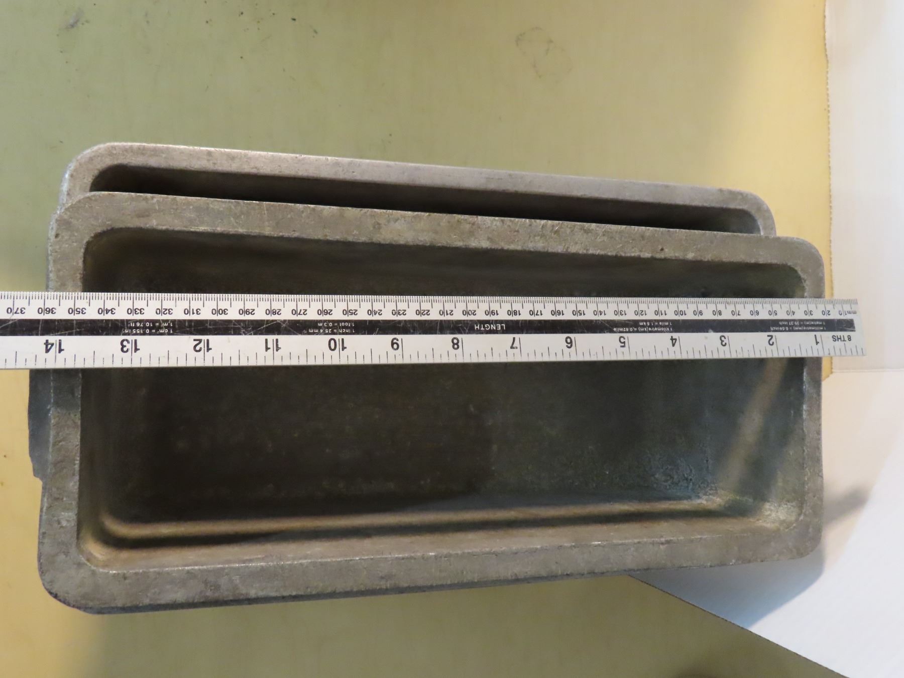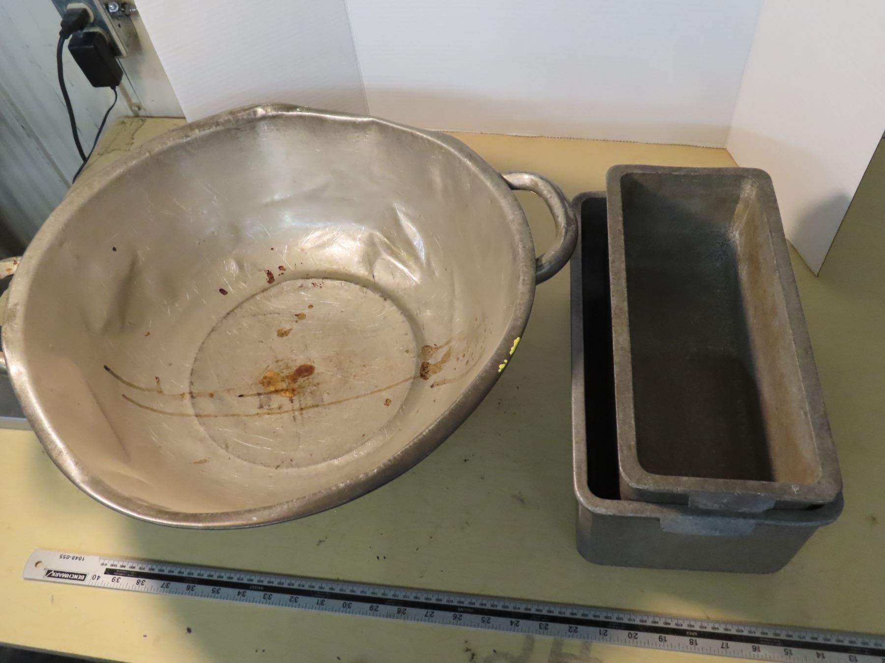 Antique dough bowl and pair of heavy butches patetrrine aluminum molds