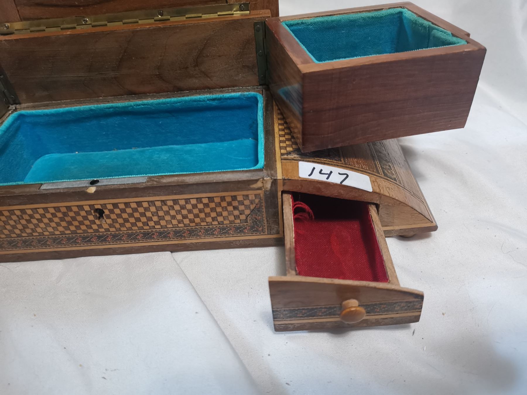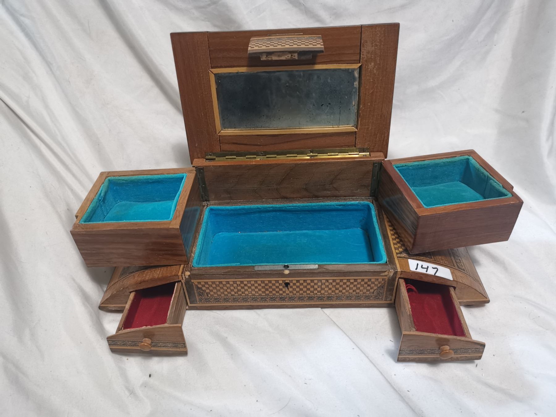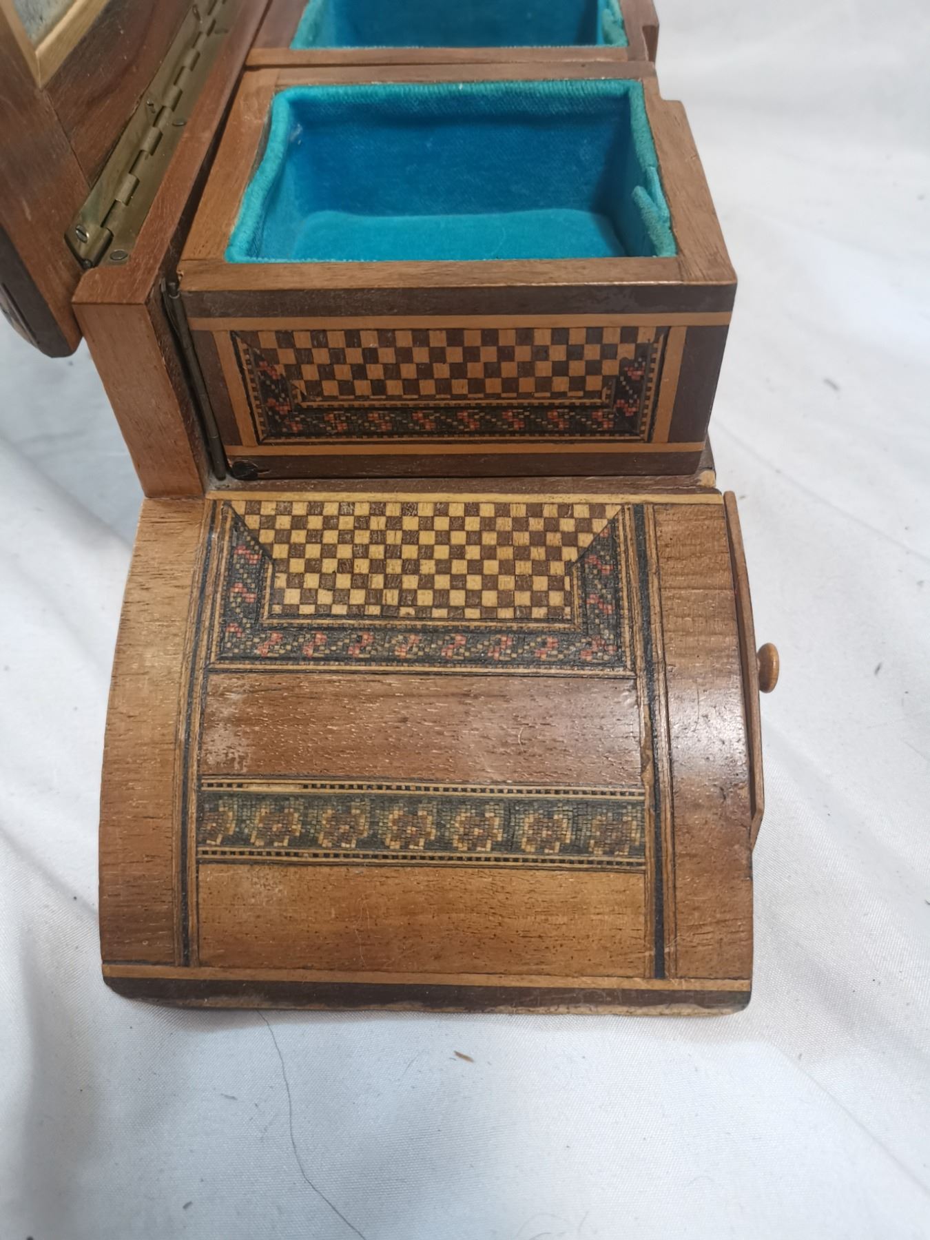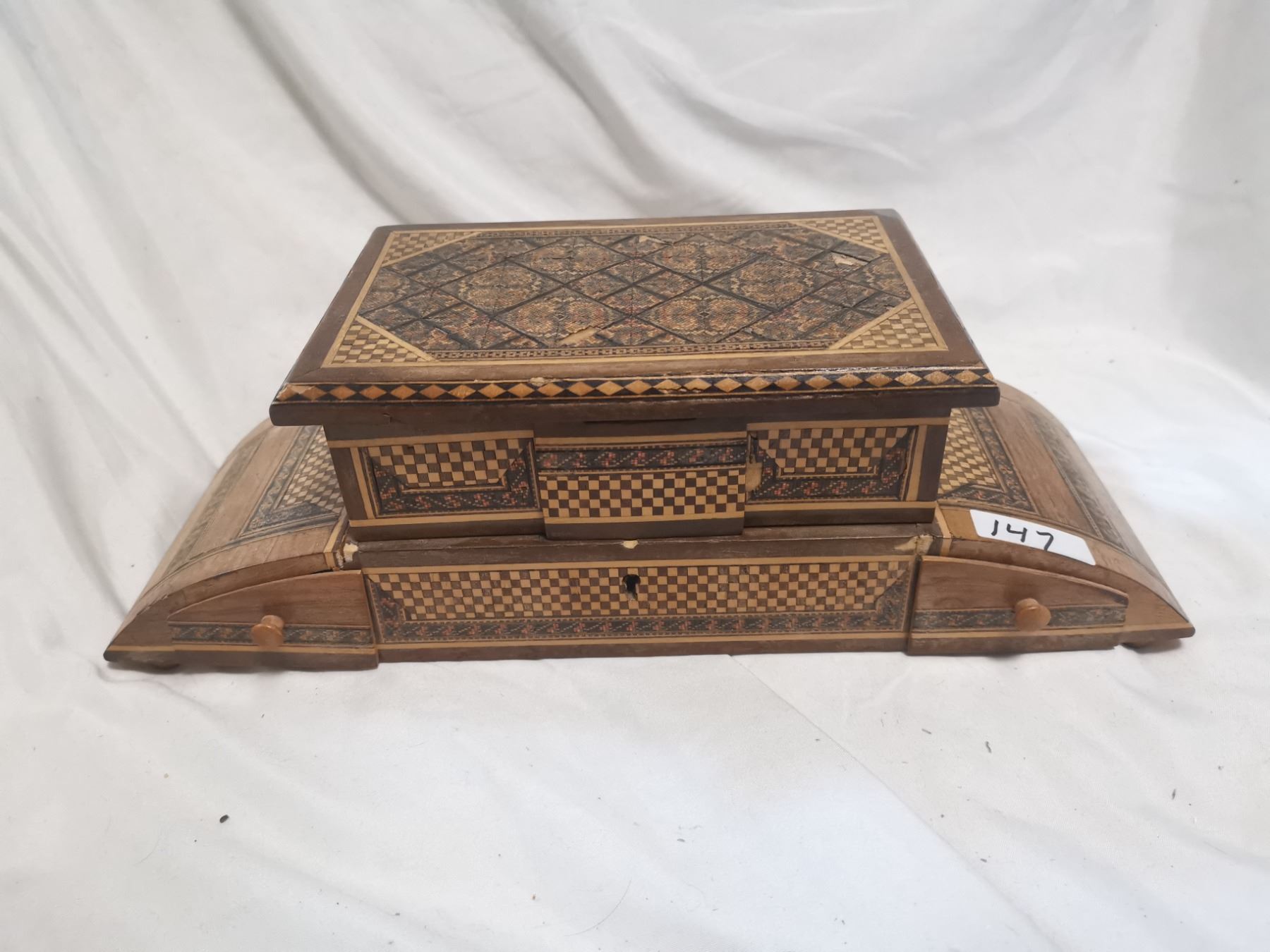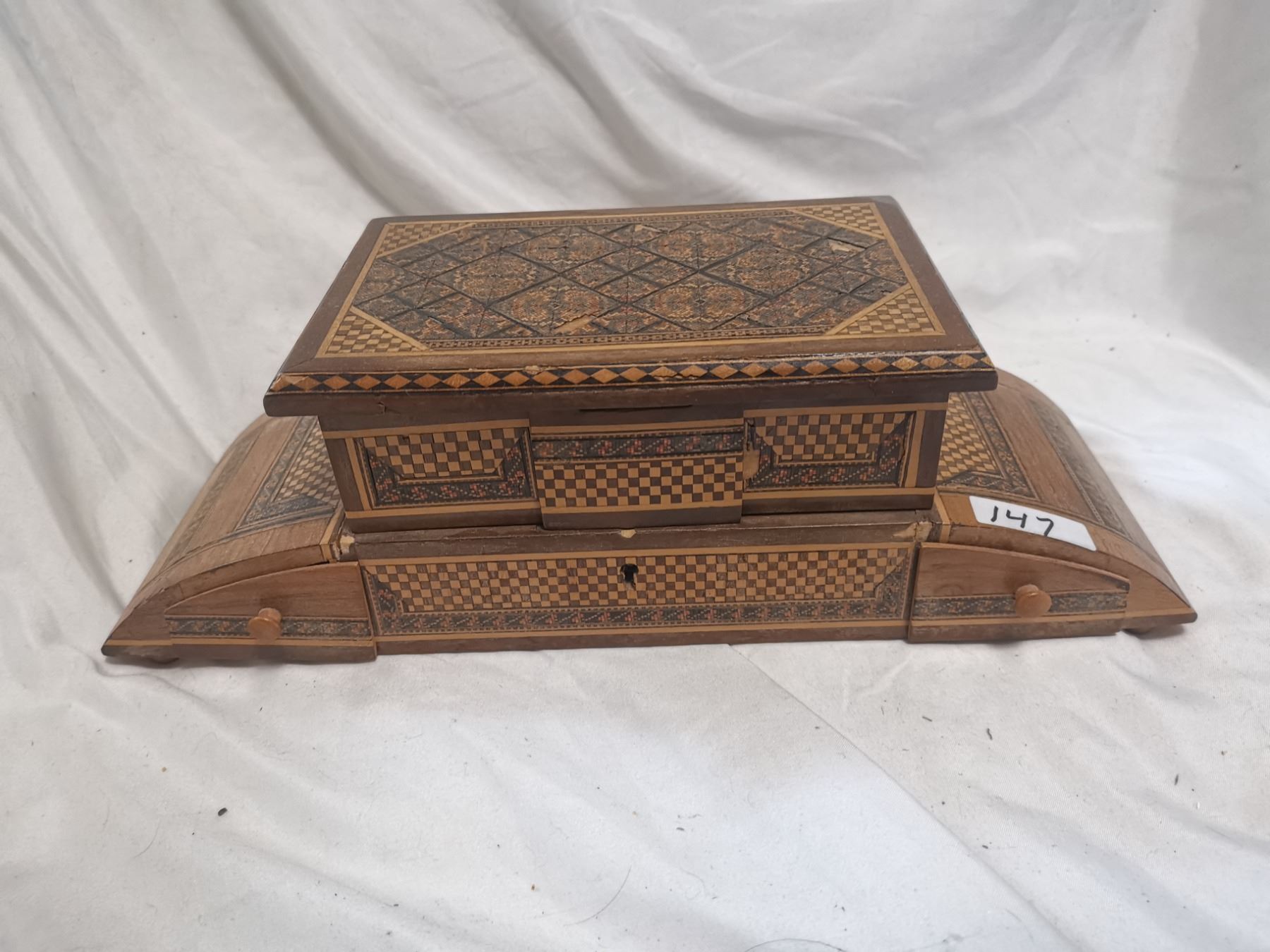 Antique jewelry box, beautiful inlay wood 14" long