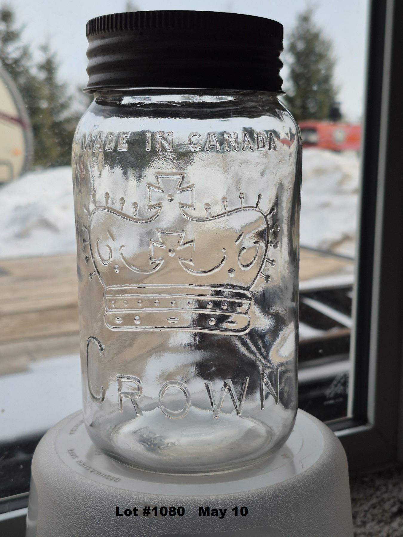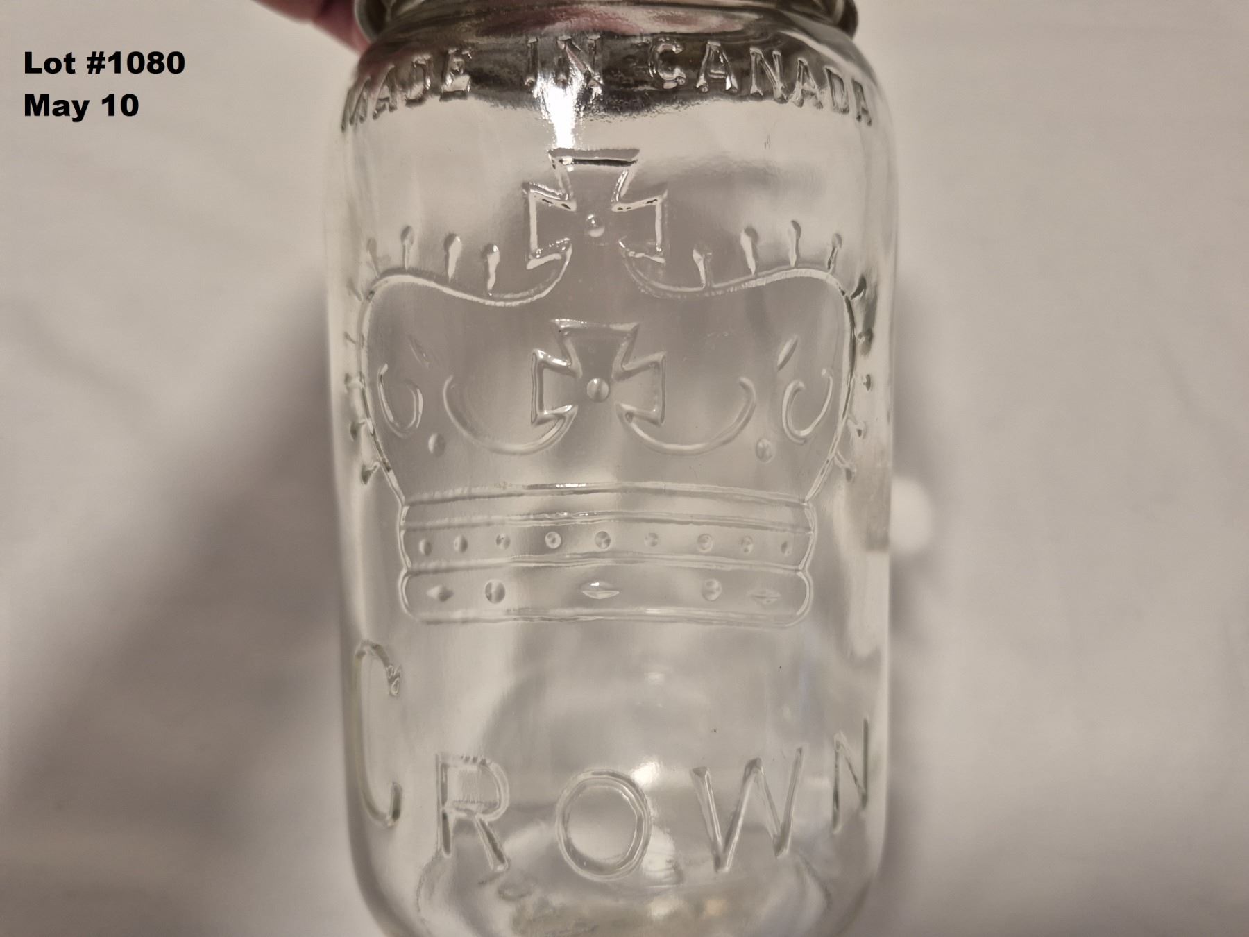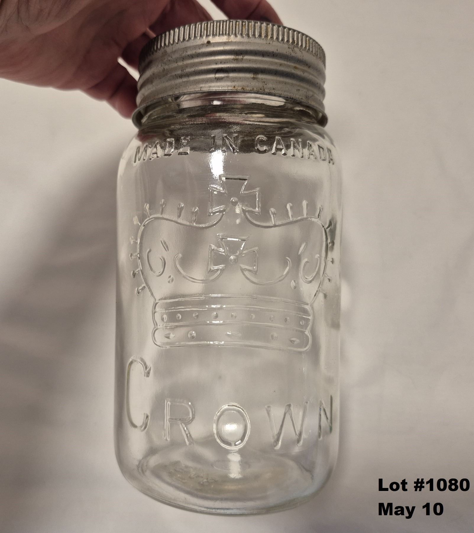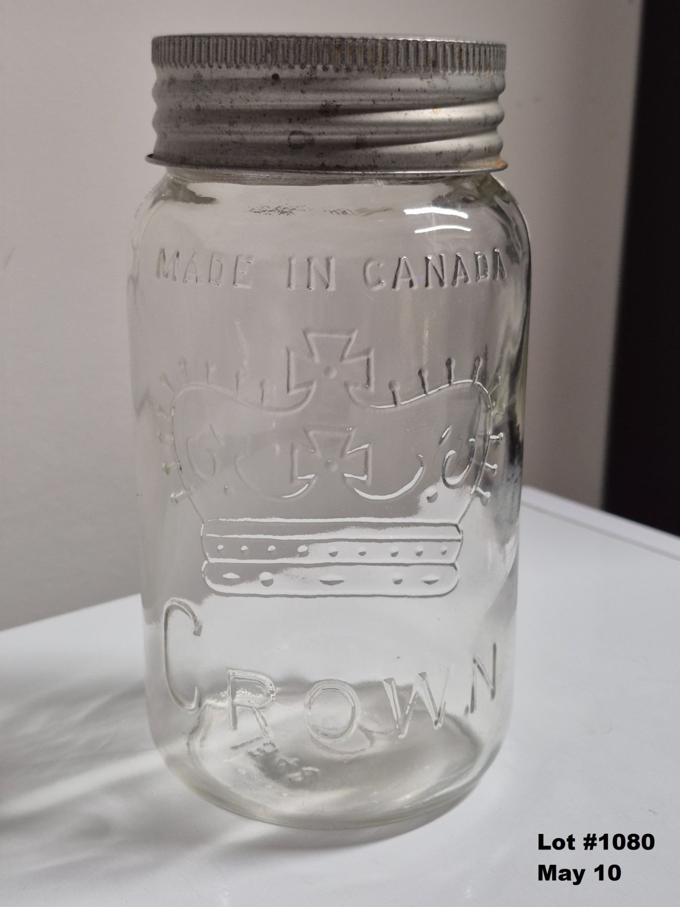 Antique old glass "CROWN" glass canning jar with lid and ring. Dominion Glass - Made in Canada. Old Style thick glass lid fits over top of the jar mouth. 1 quart size.
