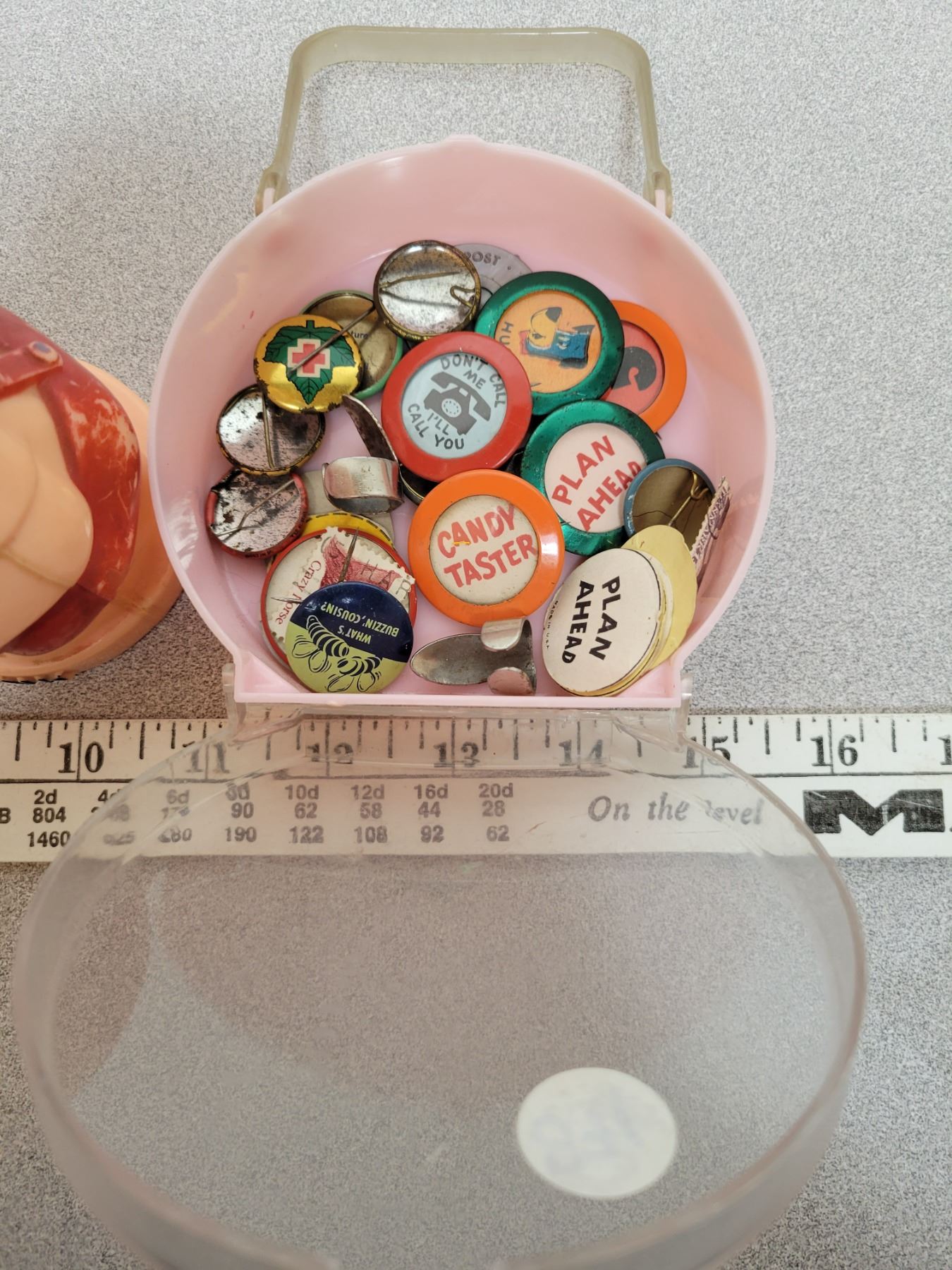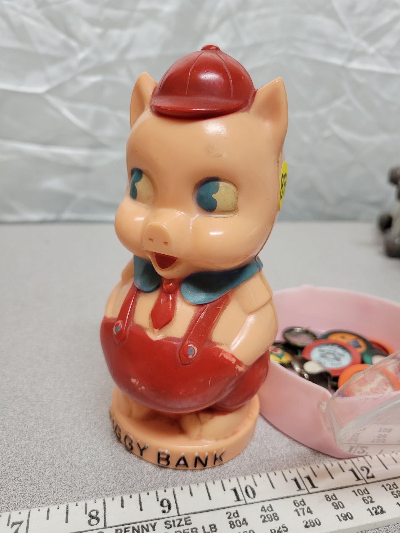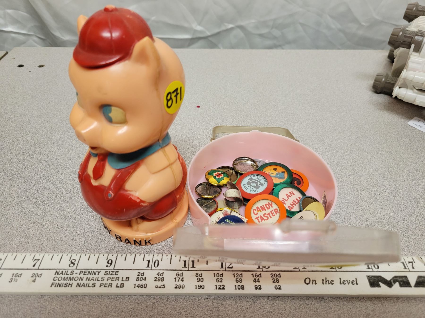 Antique 'reliable' piggy bank and assortment of vintage pins