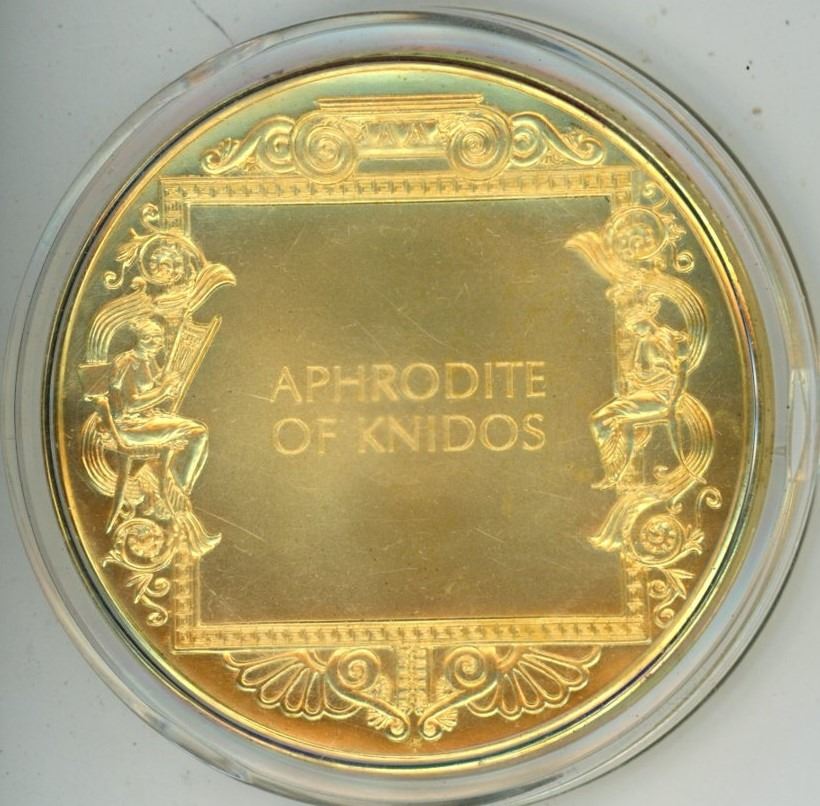 Aphrodite of Knidos. From the Ancient Greece Medals Series. A beautiful gold-plated bronze medal measuring 50mm in diameter and weighing 78.7 grams. In hard plastic holder. BU.