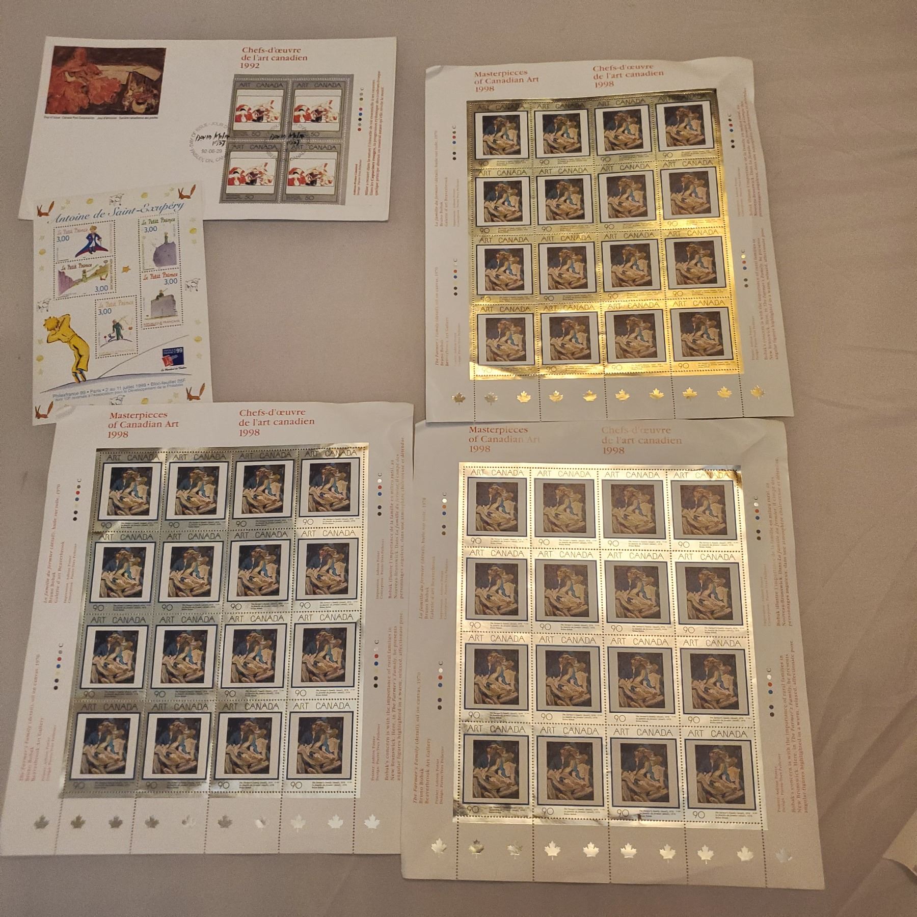 Art Canada New stamps (48x.90=43.20 Stamp value) and Day of Issue cancelled card, plus France chefs d'oeuvre 1992 1998 Antoine de saint-exupery