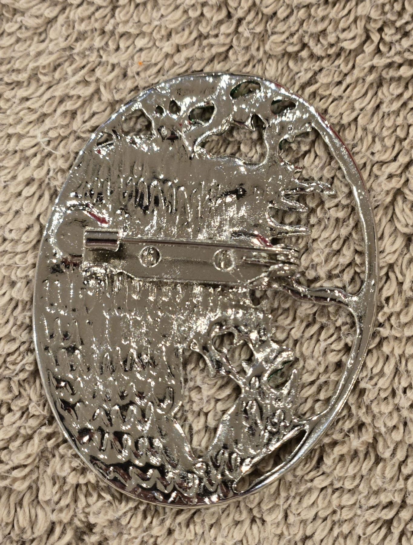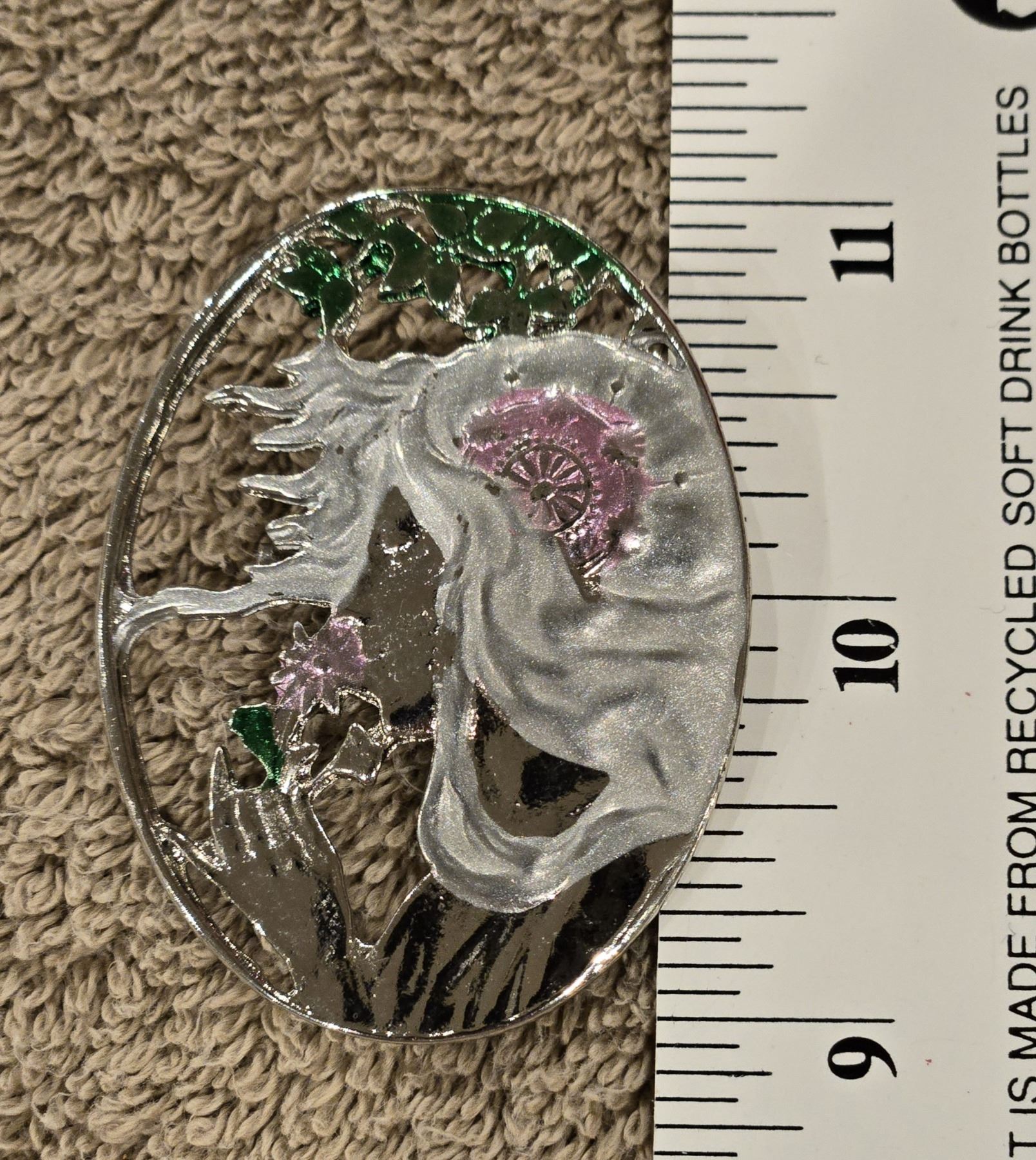 Art Nouveau Mucha Era girl with flower brooch in a white metal frame. No marking. 2"