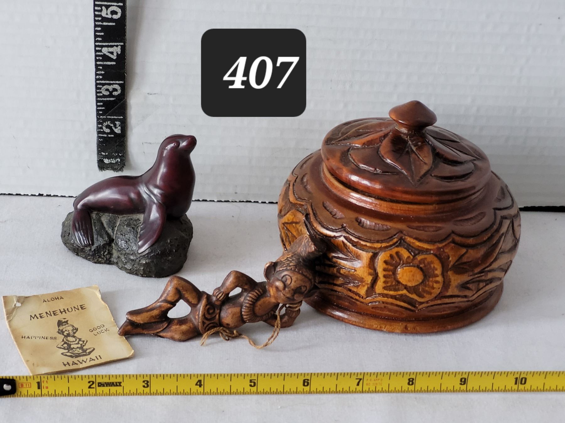 Arts from Canada (seal), Hawaii (good luck menehune), Haiti (carved wood bowl).