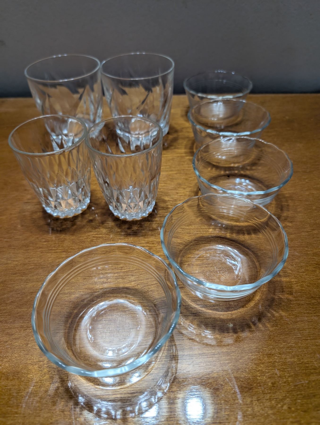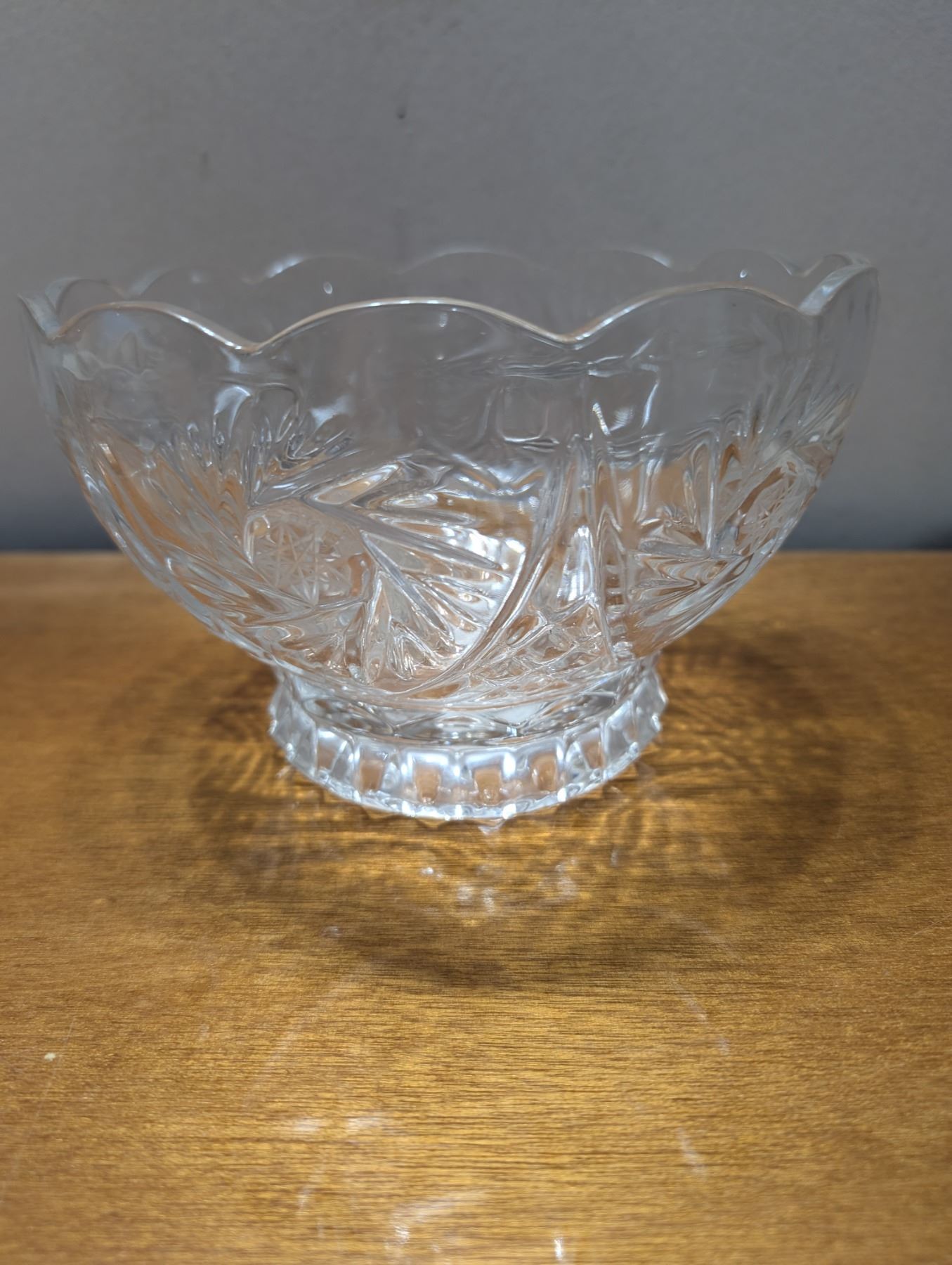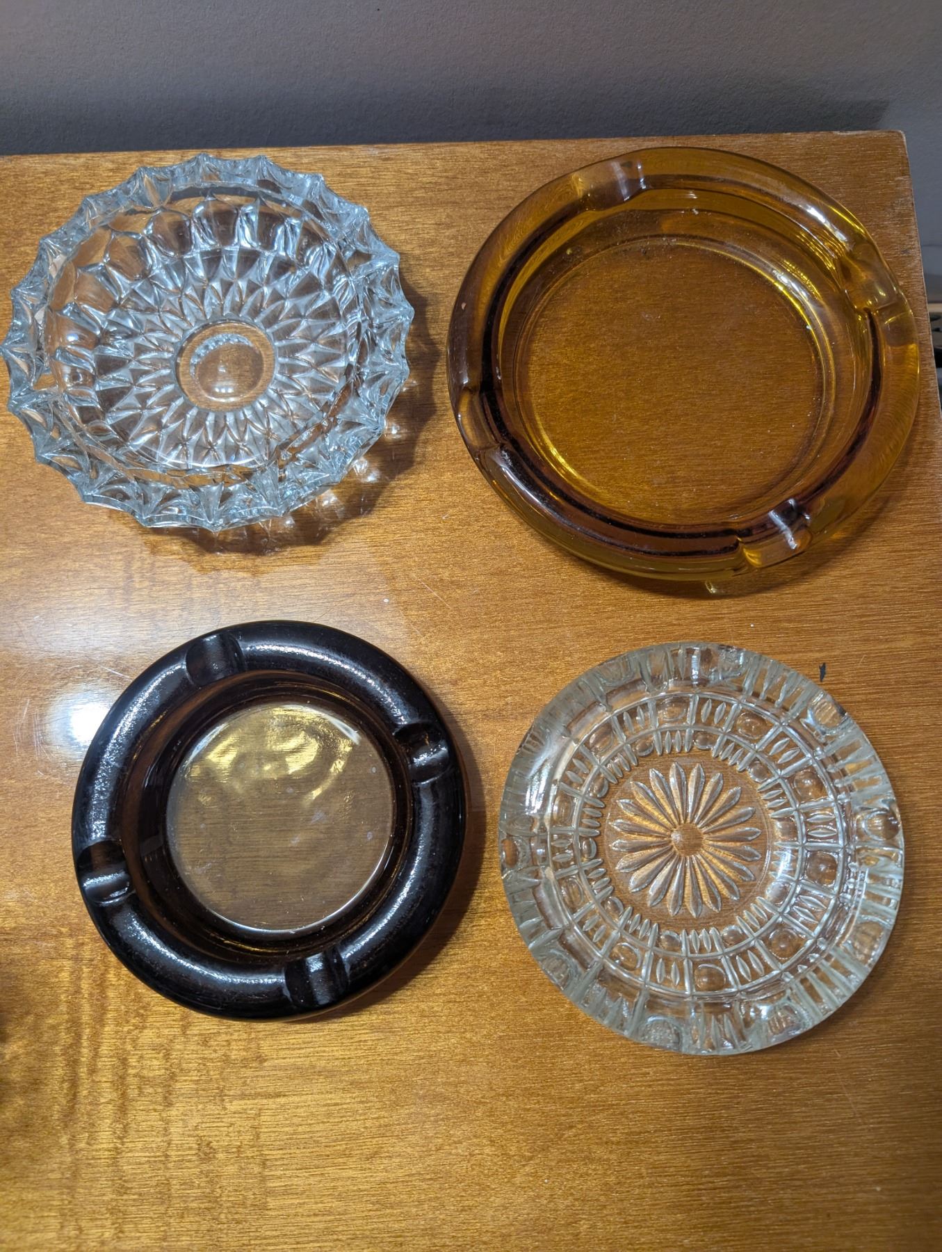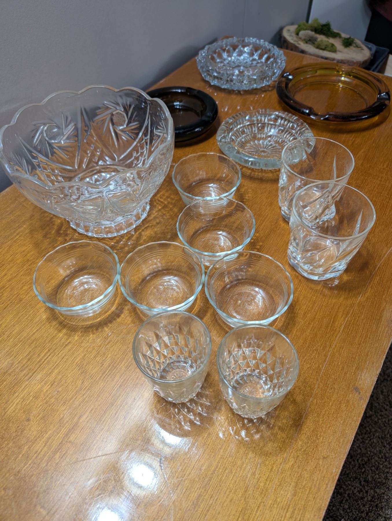 Assorted Glassware. Ashtrays, pinwheel crystal bowl, glasses and fruit nappies.