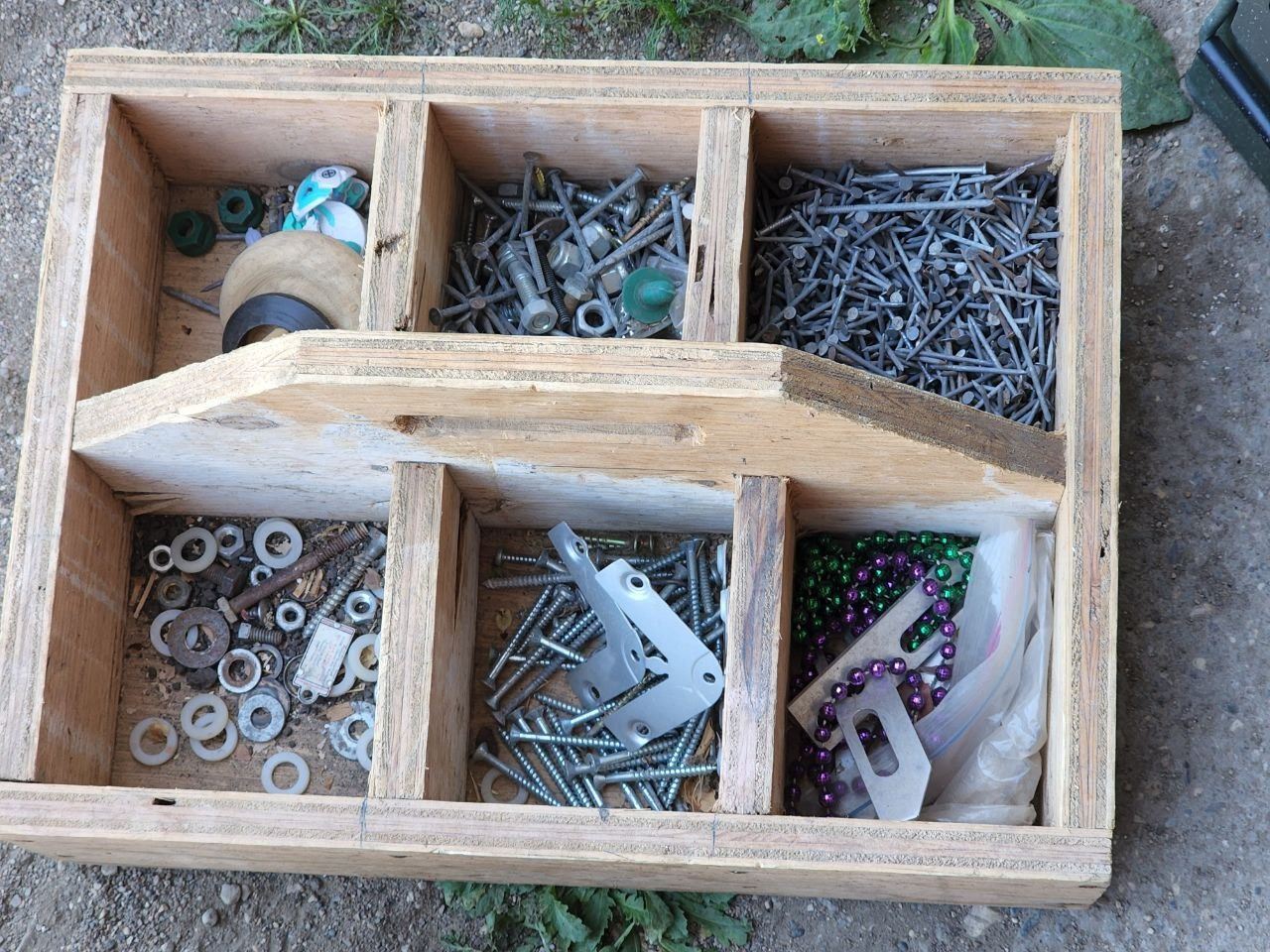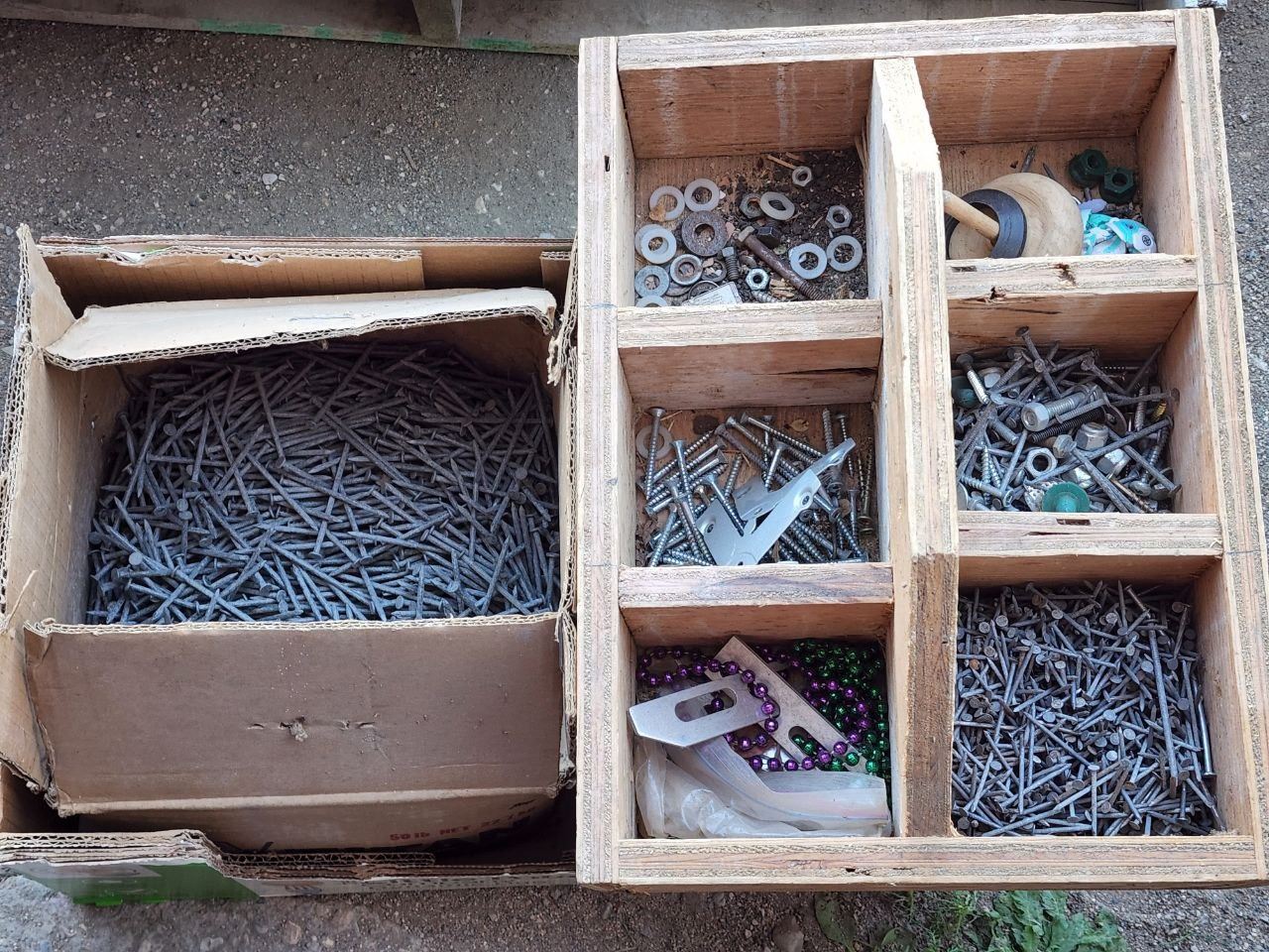 Assorted Hardware, Box of 3" Nails, Box Sorter filled with Assorted Nails, Screws, etc.